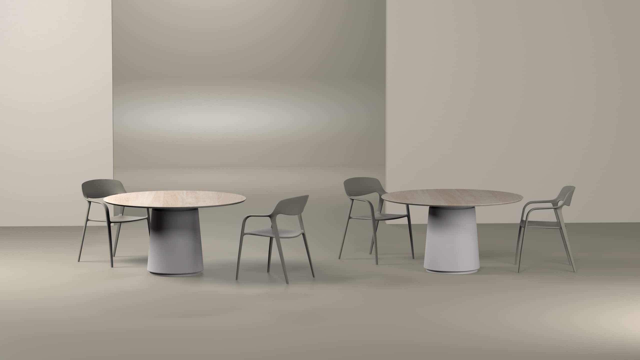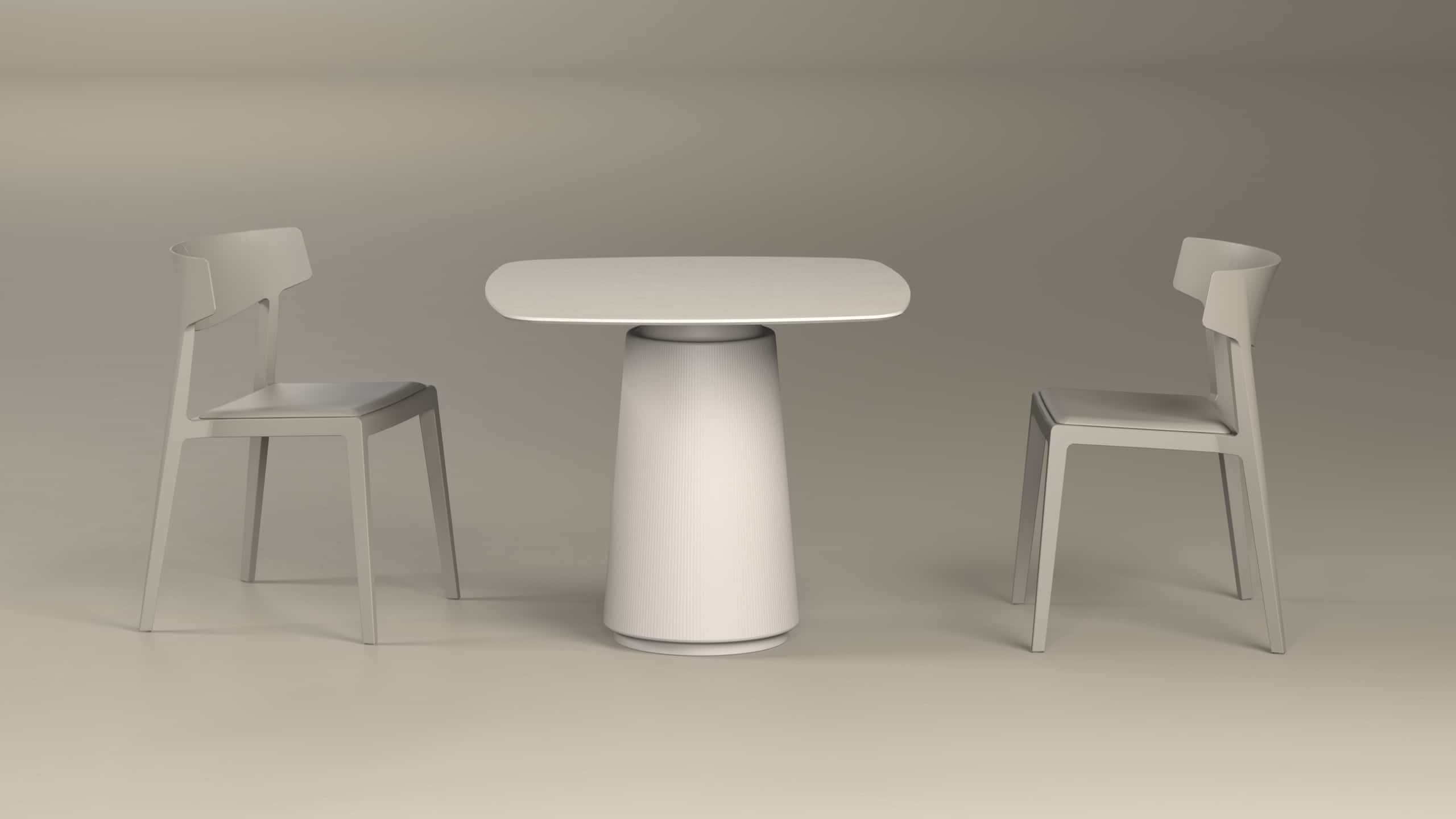 La taula DORIK esta composta per una pota central i un top biselat. Ofertada en diversos acabats, tant en la base com en el sobre. L'estètica de la col·lecció està inspirada en les columnes dòriques pròpies de l'arquitectura de l'antiga Grècia.