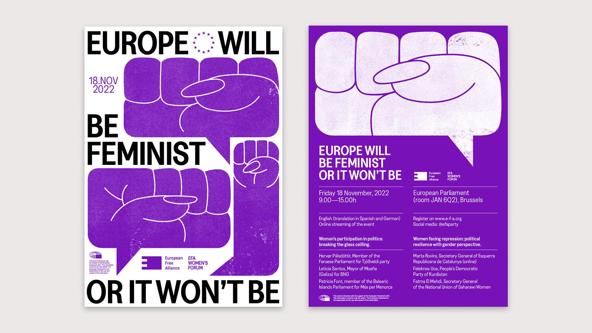 Producció d'un model de cartell que es va usar per a comunicar la trobada de dones polítiques en el parlament europeu. També es van desenvolupar altres peces de comunicació, com a programes, continguts per a xarxes socials, quaderns i samarretes.