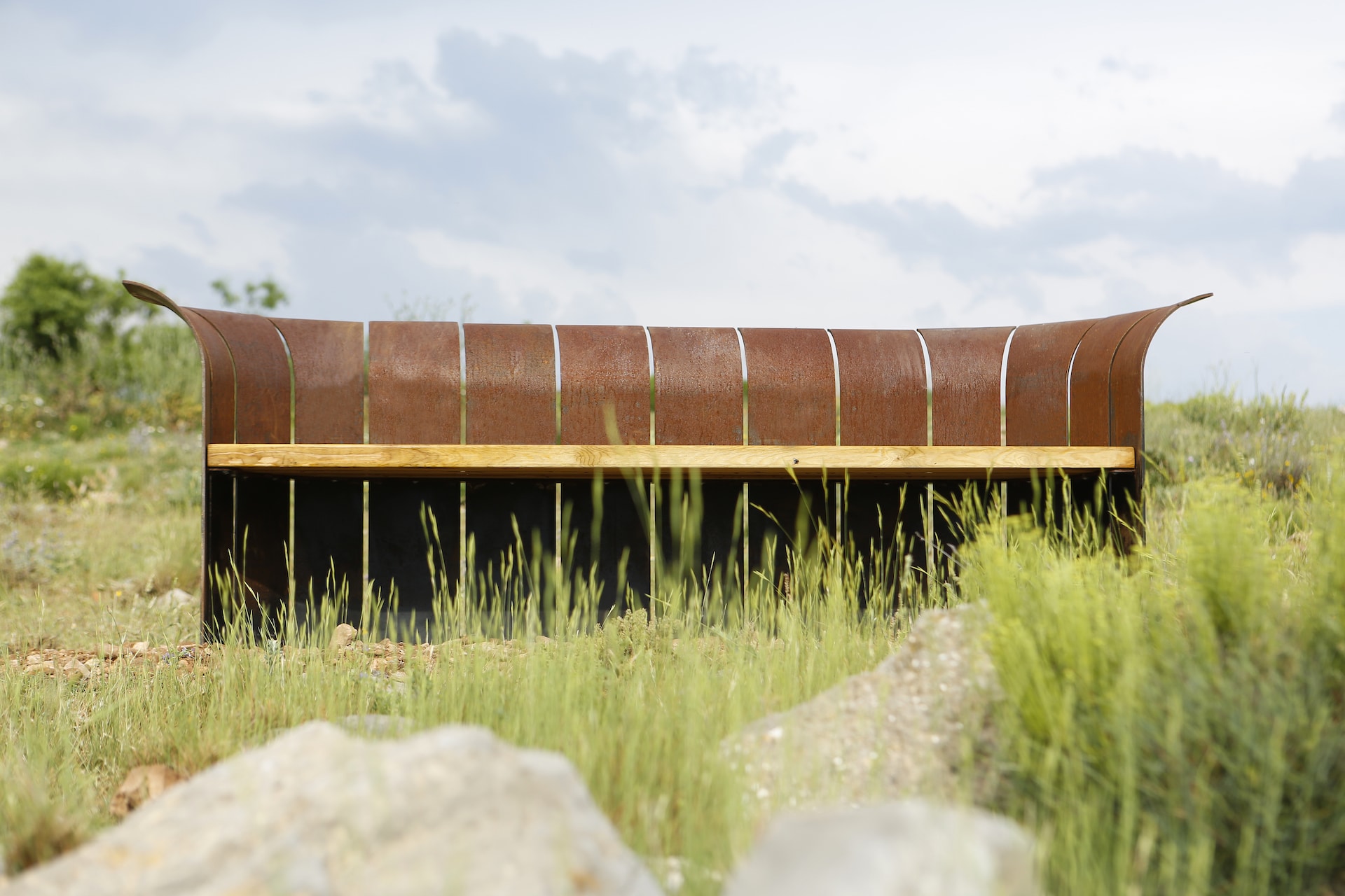 Pieza única elaborada para el programa de bancos Ruta por la diversidad, aunque perfectamente replicable en una producción seriada. Realizada con lamas dobladas de acero corten de 7 mm (estructura y respaldo), y listones de madera maciza (asiento). Las piezas se separan para evitar la acumulación de agua. El conjunto metálico se resuelve con solo dos tipos de pieza, logrando un resultado sinuoso.