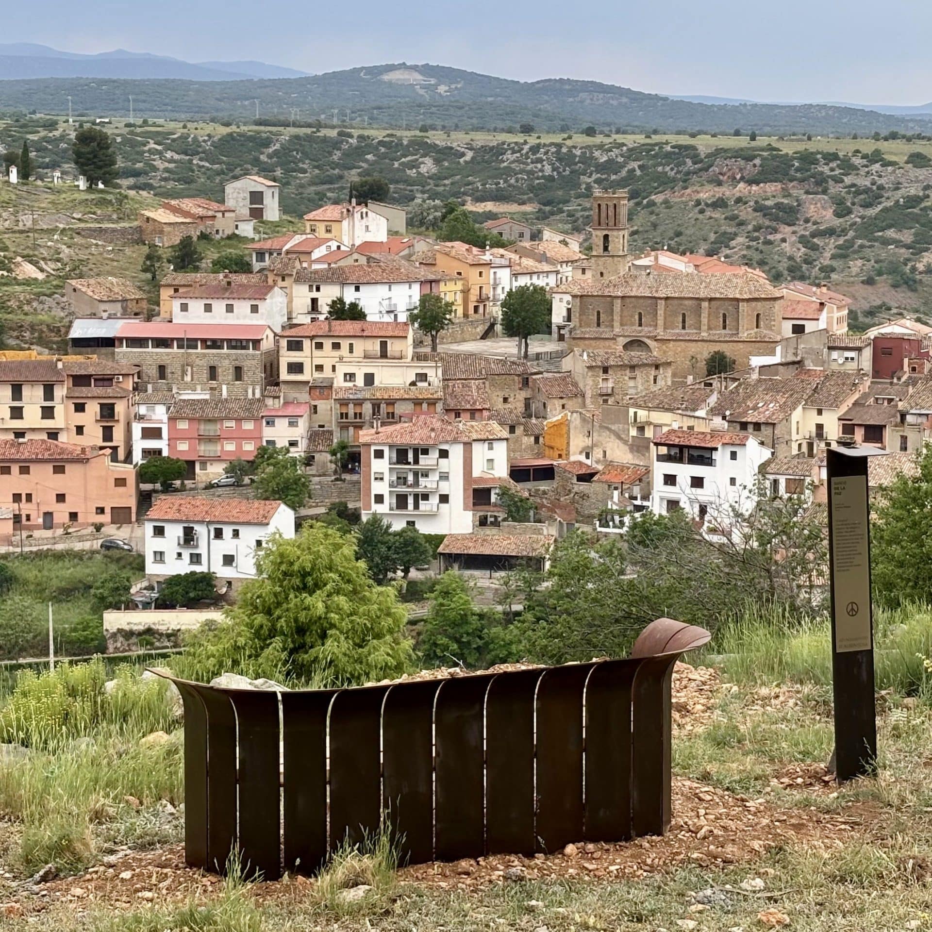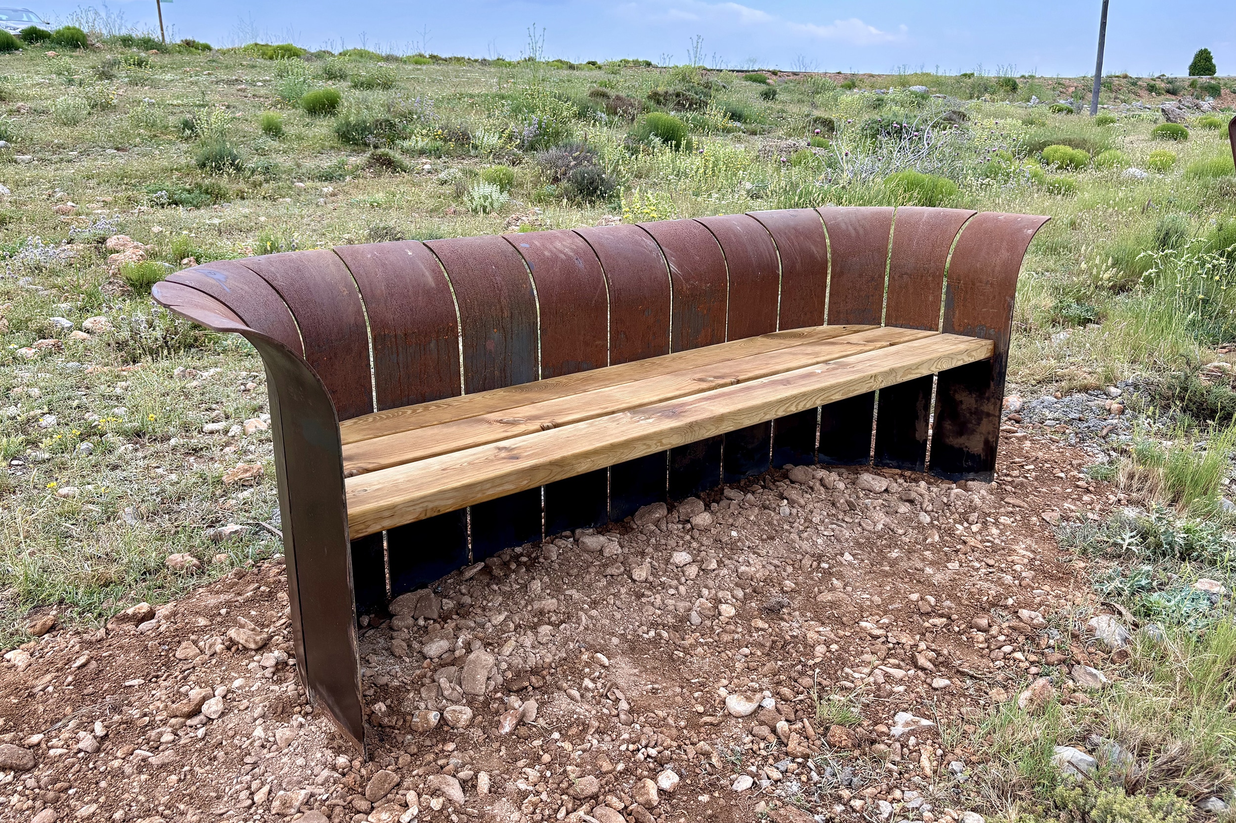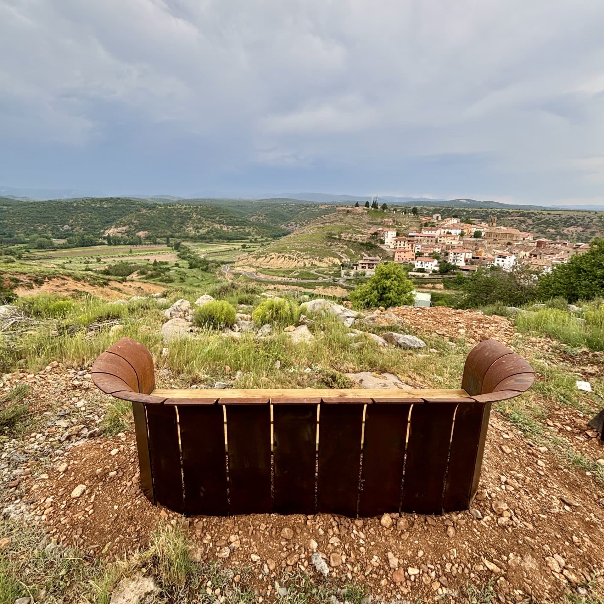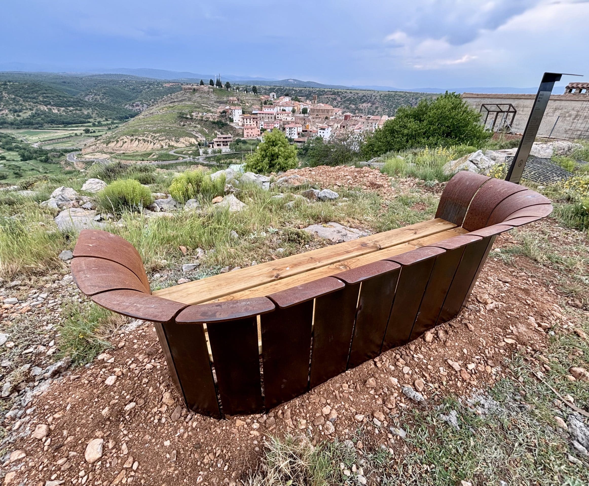 El banco A brazos está realizado con lamas dobladas de acero corten de 7 mm y listones de madera maciza. Su forma remite a un sofá chesterfield, transmitiendo sensaciones de comodidad, hogar y seguridad. Los brazos envuelven en un gesto de acogida, empatía y cercanía, como un abrazo. La pieza se sitúa en un entorno natural y rural, con vistas privilegiadas del pueblo de Albentosa.