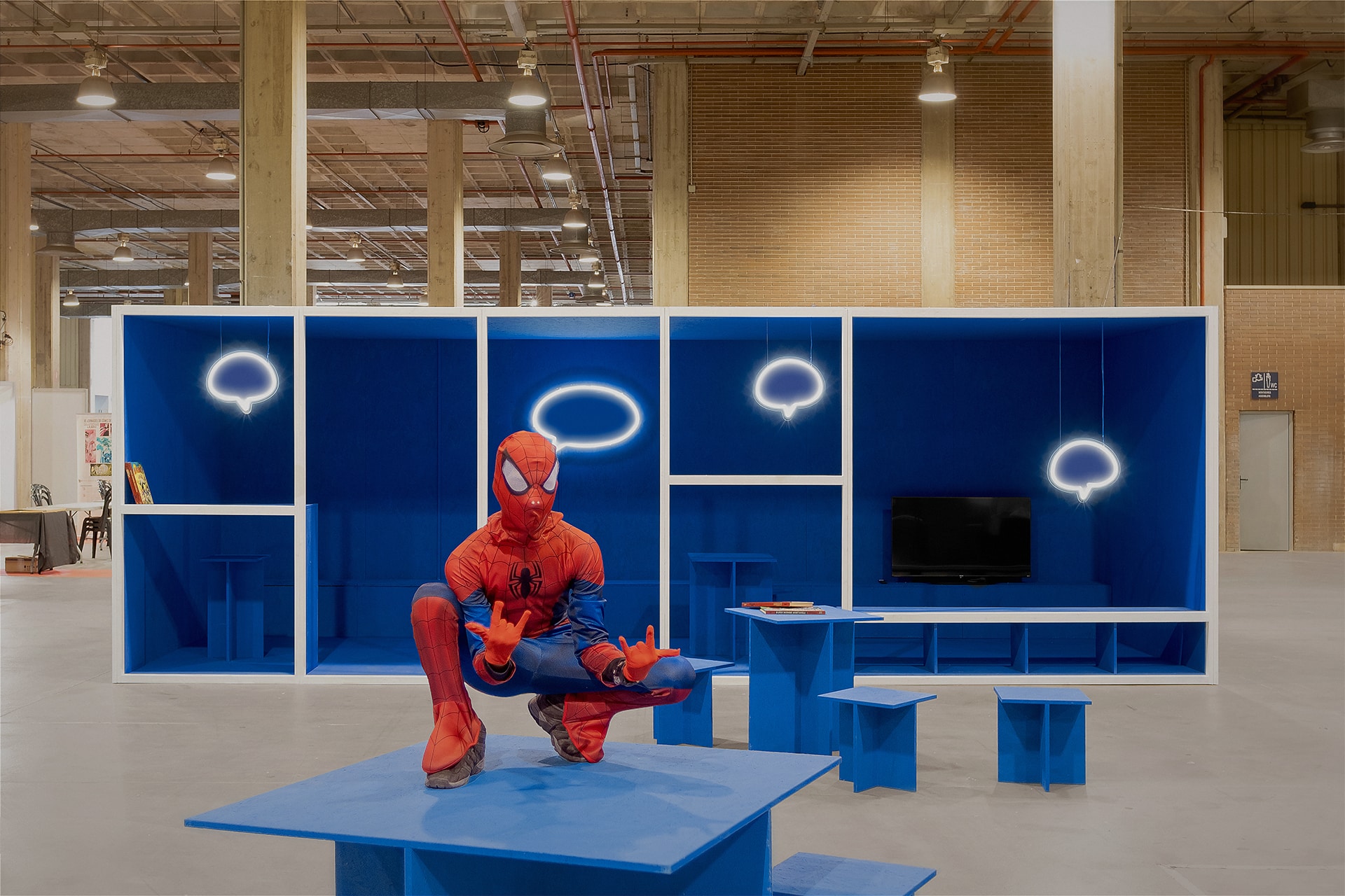 Inspirado en la icónica sección del 13, Rue del Percebe de Francisco Ibáñez, el proyecto construye un cómic formado por viñetas que responden al programa de necesidades e incorporan bocadillos de neón, tan característicos de este universo. El color azul refuerza este mundo de fantasía. Los visitantes se convierten en protagonistas, transformados en los personajes que dan vida y sentido al stand.