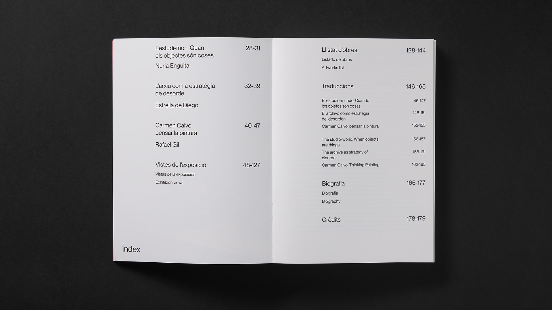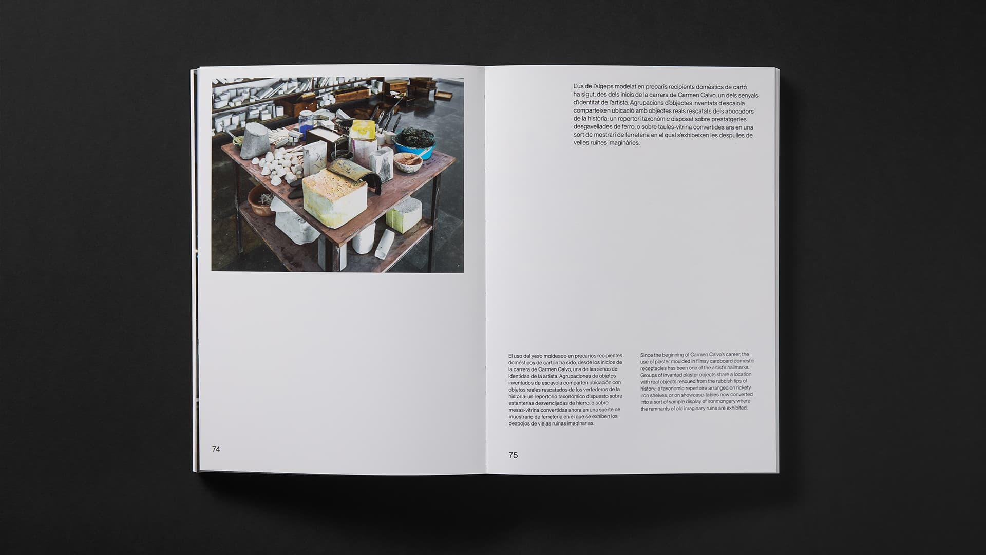 Catálogo de la exposición de Carmen Calvo en el IVAM. El libro debía reflejar conceptualmente la obra de la artista y diferenciarse de sus publicaciones previas, apostando por la elección de materiales y un diseño contundente y cuidado.