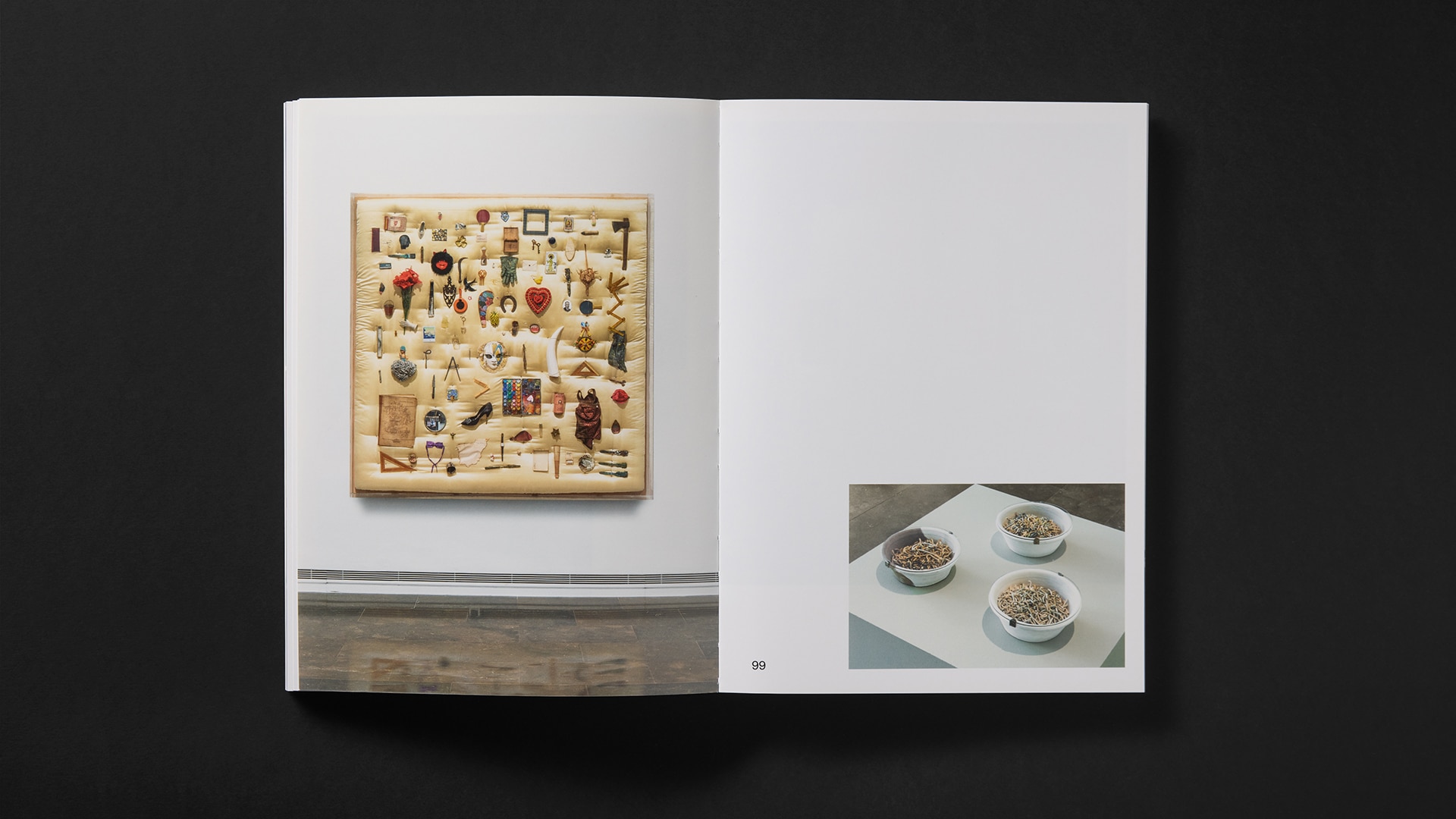 El color rojo de portada, combinado con la fotografía colocada mediante un golpe seco en bajo relieve, acentúa la mujer objetualizada, oculta y oprimida bajo las telas. La encuadernación plana permite una visualización perfecta de las imágenes.