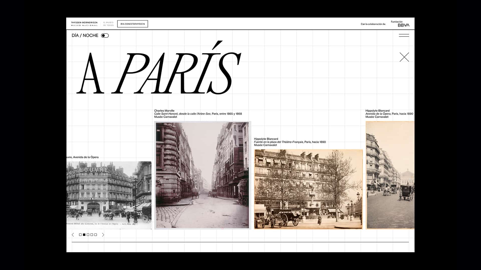 Diseño contemporáneo con contenido audiovisual, textual, gráfico y podcast. Web con animaciones, selección de color (Día/Noche), tipo de navegación (rumbo/deriva), elementos personalizados y participación del público a través de Instagram.