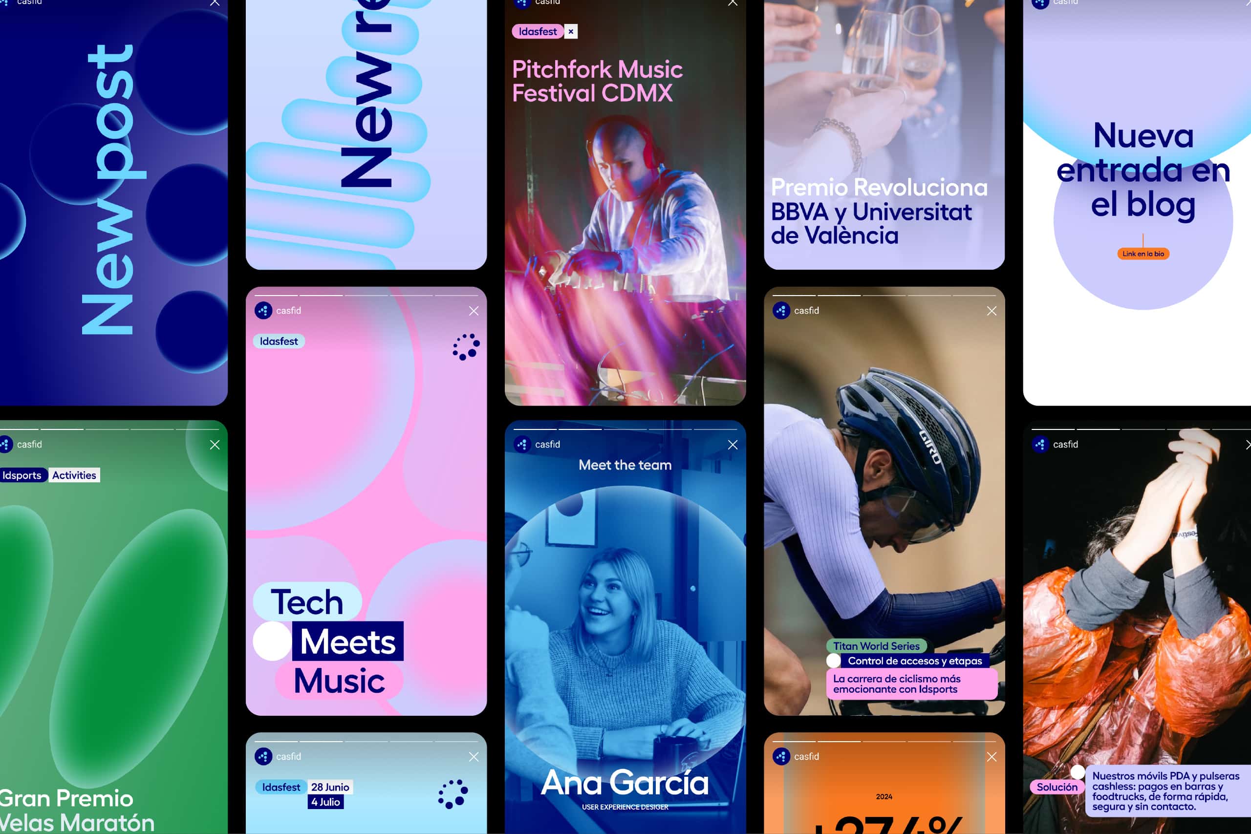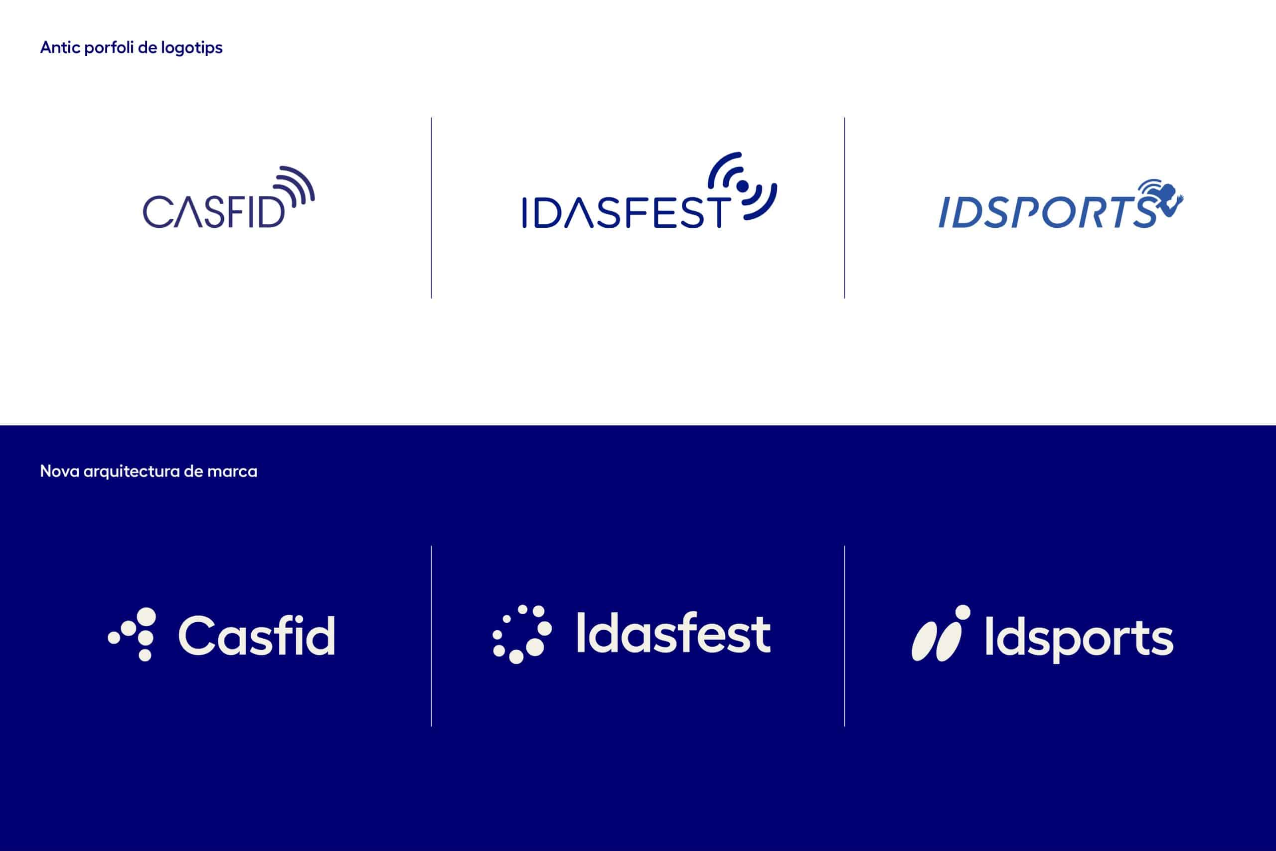 Casfid, matriz tecnológica especializada en RFID, control de aforo y sistemas cashless, quería rediseñar su identidad. El objetivo era unificar la arquitectura de marca sin perder el concepto inicial. Al final, los logotipos debían ser reconocibles dentro de sus sub-nichos (consultoría, festivales y competiciones deportivas) y percibirse como parte de una misma familia.