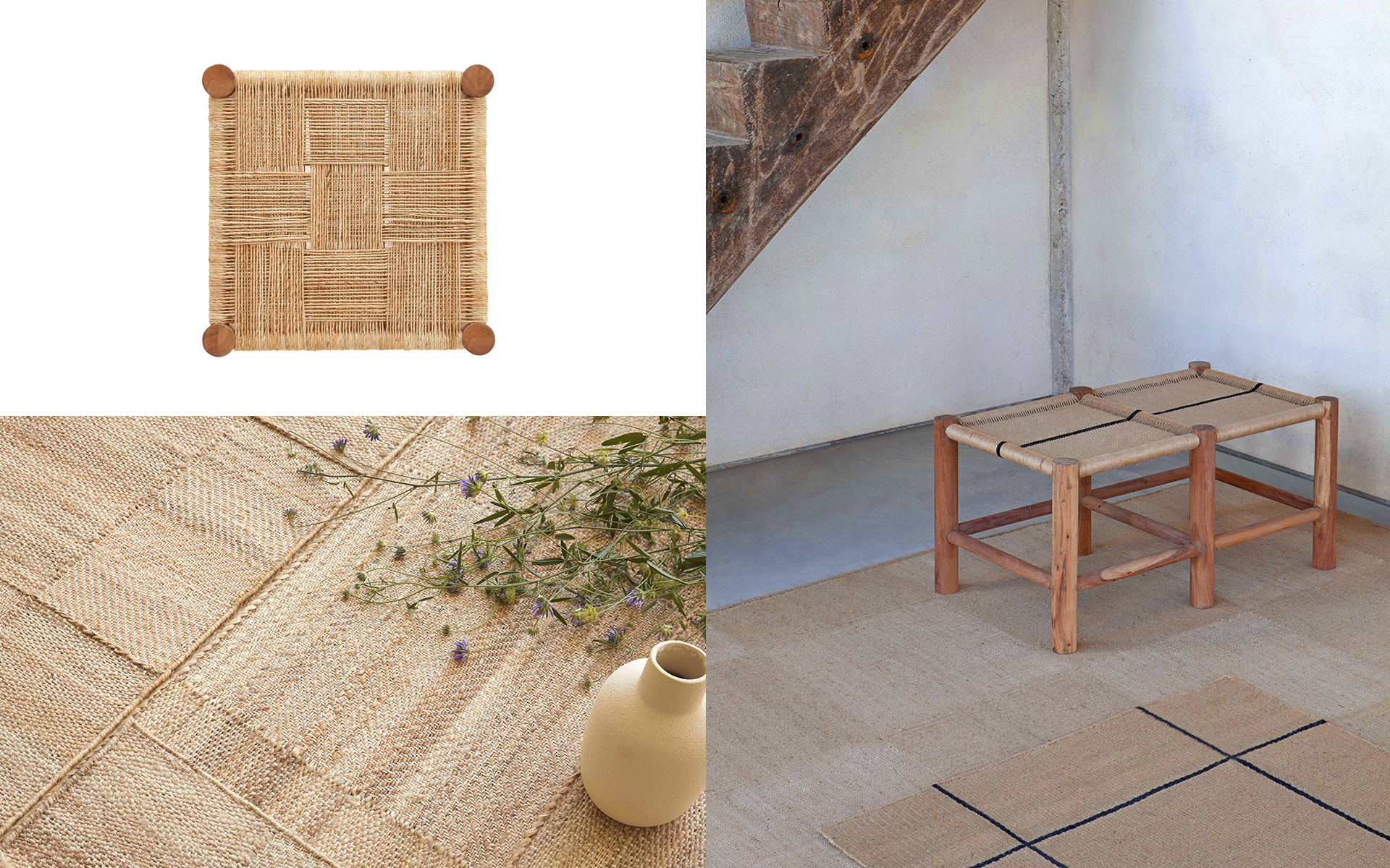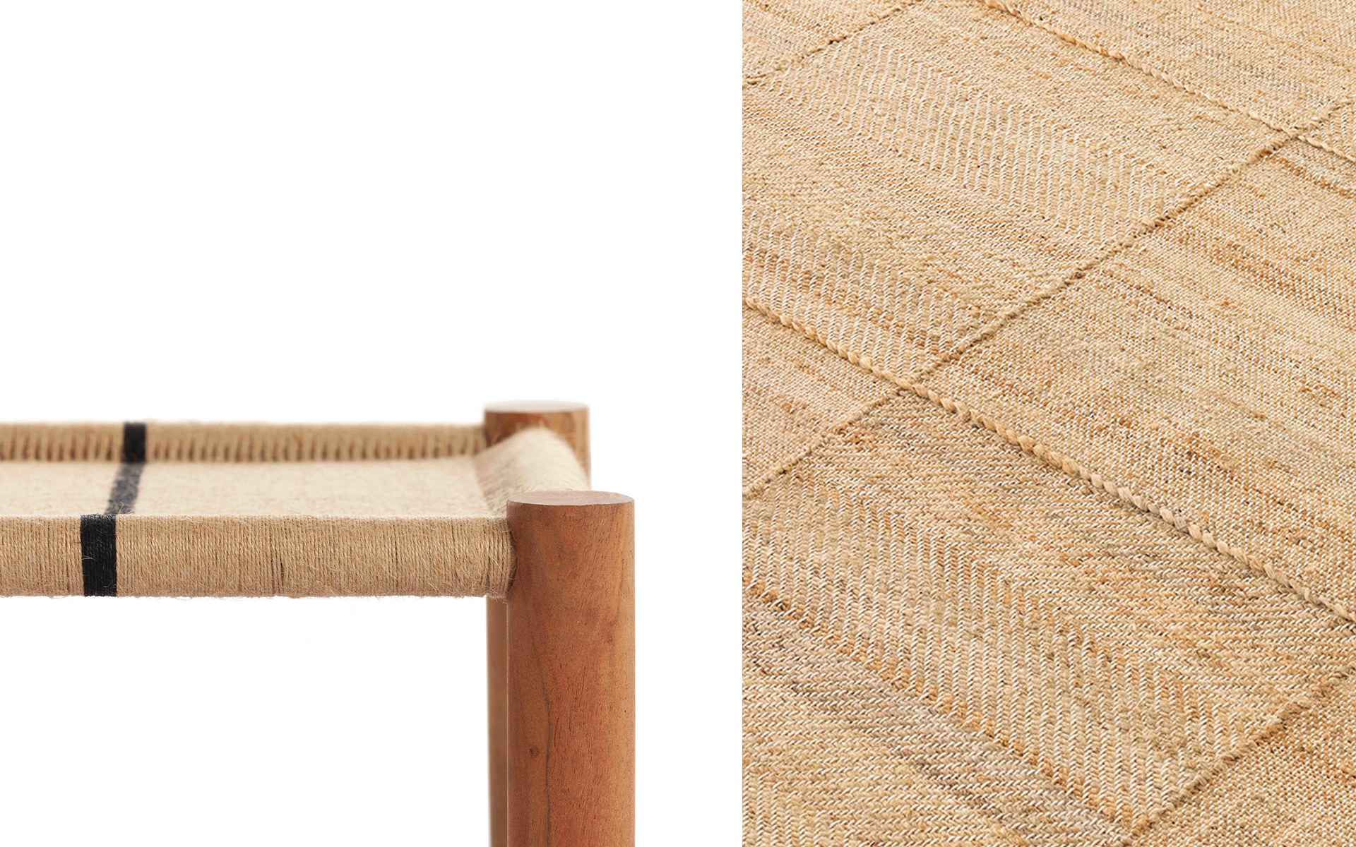 Los kílims están tejidos con fibras de yute que se entrelazan en la urdimbre de algodón. Los taburetes están trenzados con fibras de yute sobre una estructura de madera de acacia. Todos ellos con una confección impecable y a mano en la India