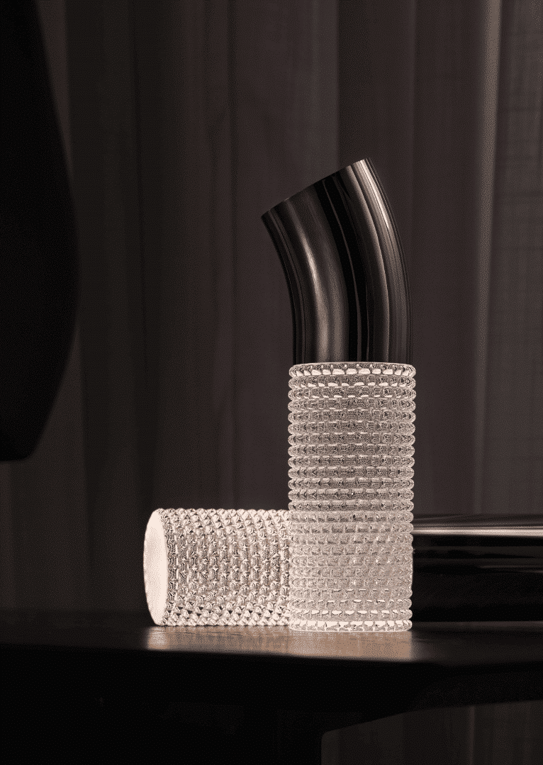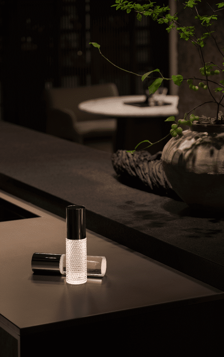 Colección de lámparas inalámbricas, compactas, portátiles y recargables está diseñada para crear ambientes íntimos. La parte superior se ofrece en forma recta o curva e integra un LED que difunde la luz a través del cristal. La base de cristal macizo presenta cuatro acabados, esmerilado, limpio, textura 3D y degradado, y dos colores: negro y cromo, generando diferentes efectos de iluminación.