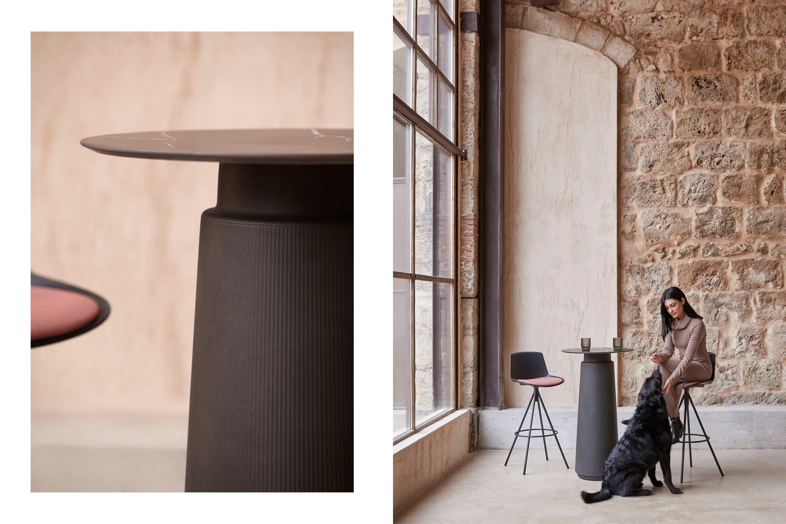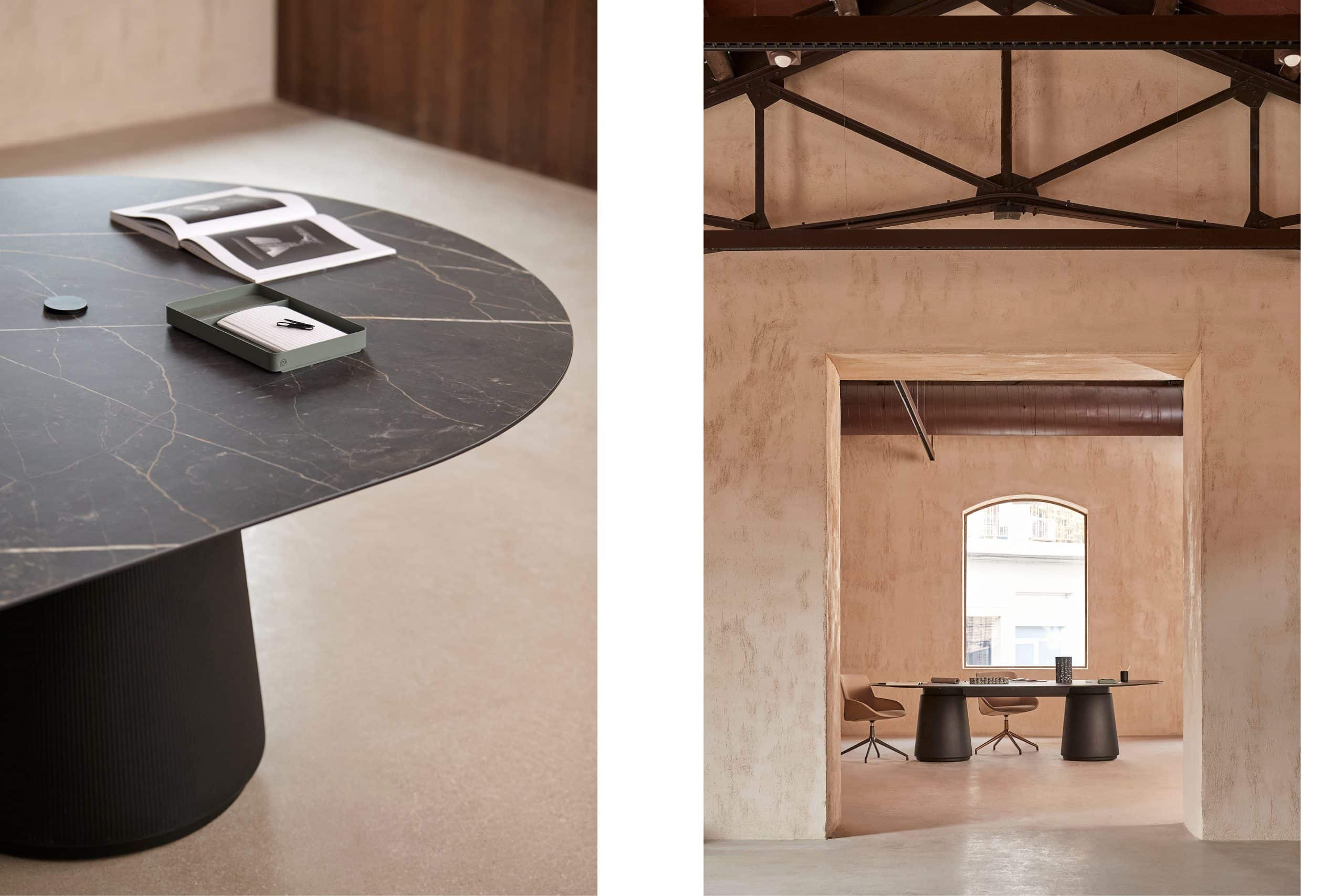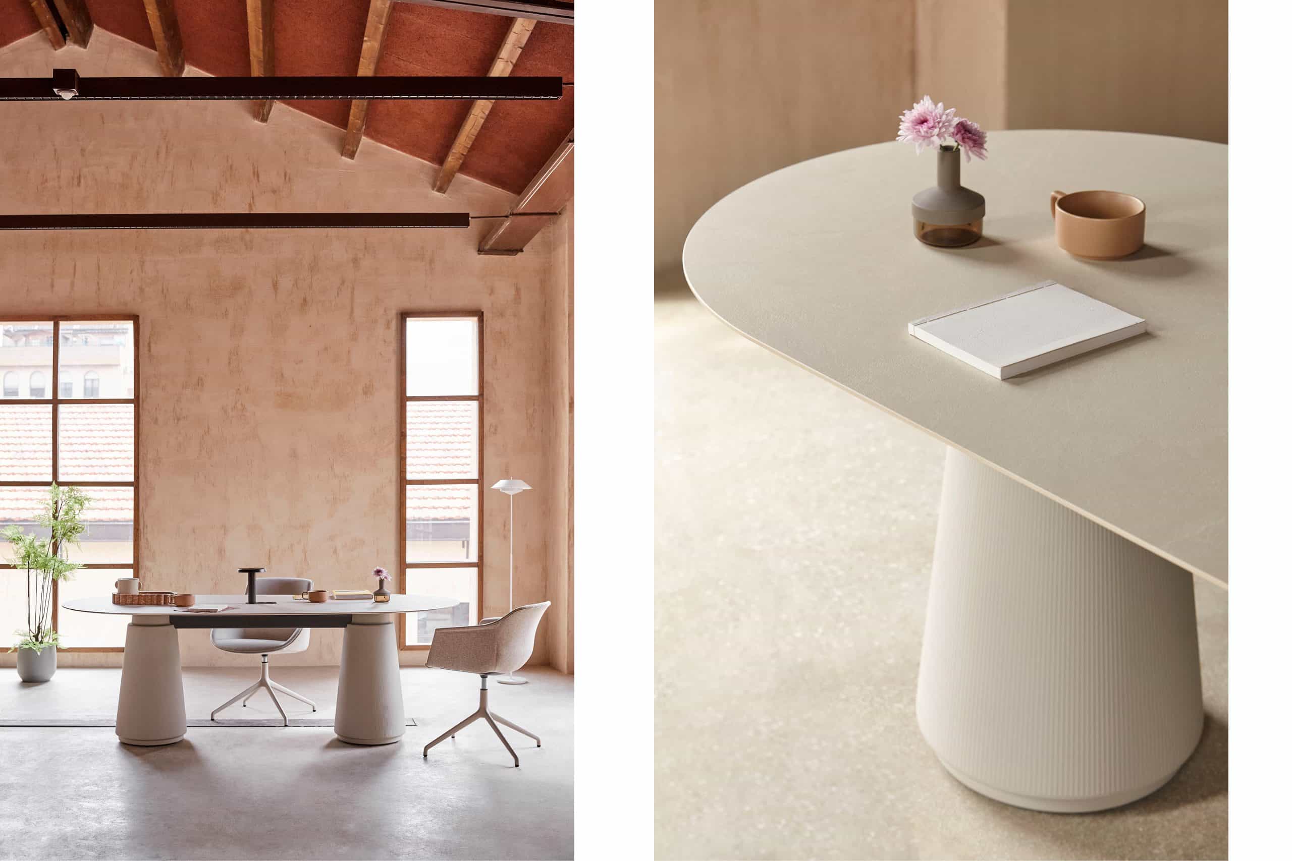Se enfatiza la silueta vertical y el carácter escultórico de Dorik, que ordena el espacio con equilibrio entre diseño y función. Las composiciones evocan simetría y proporción desde un lenguaje actual. Imaginamos la pieza en entornos contract, reuniones, áreas colaborativas, contract... donde conversación y creatividad fluyen, reforzando su versatilidad.