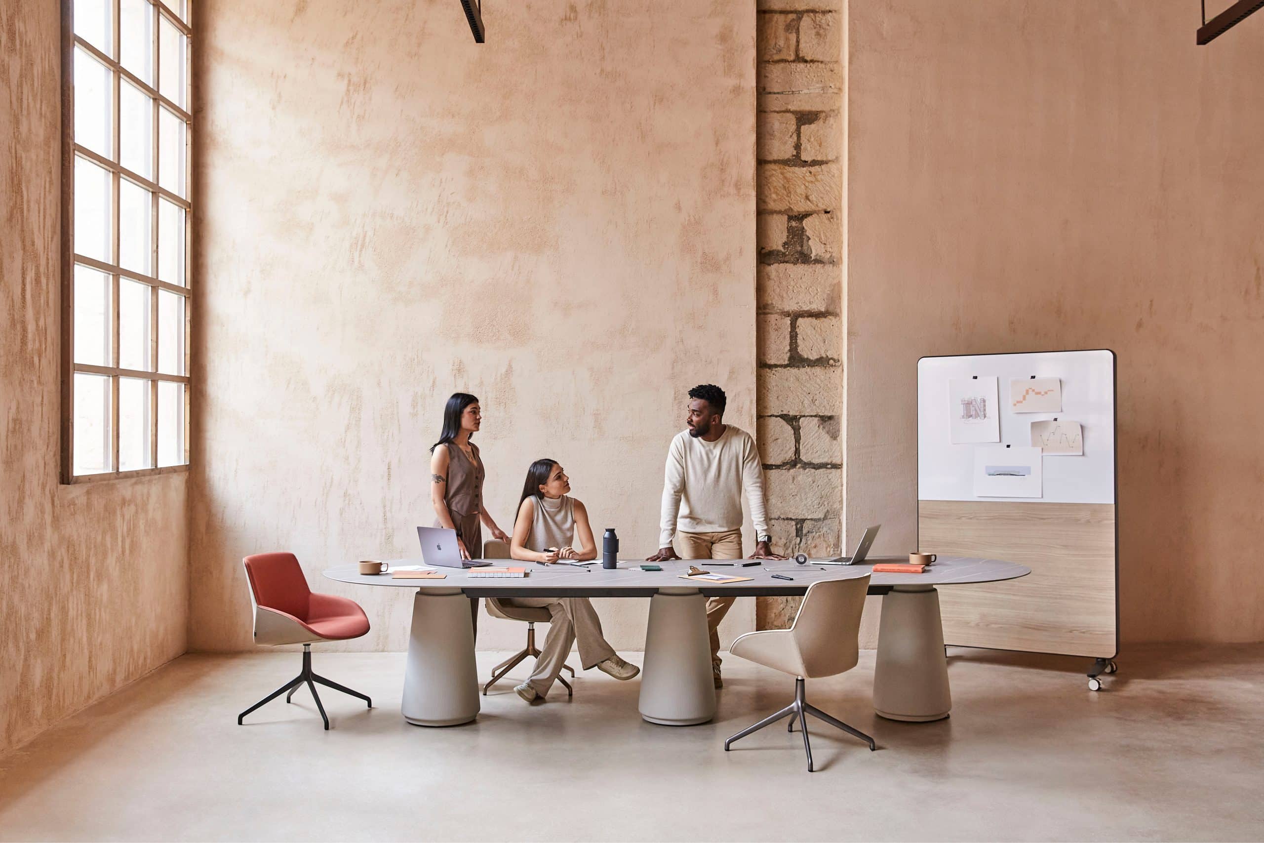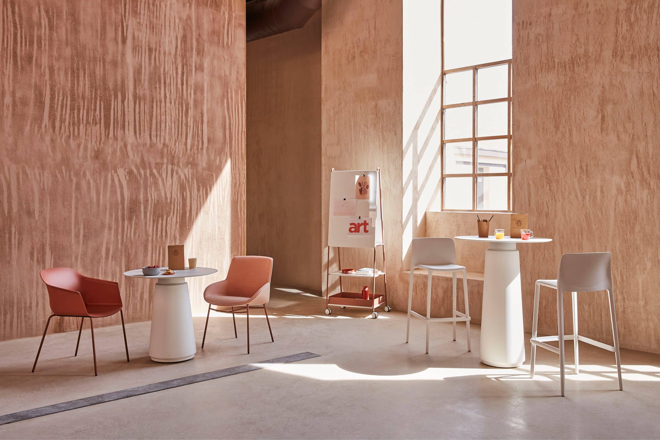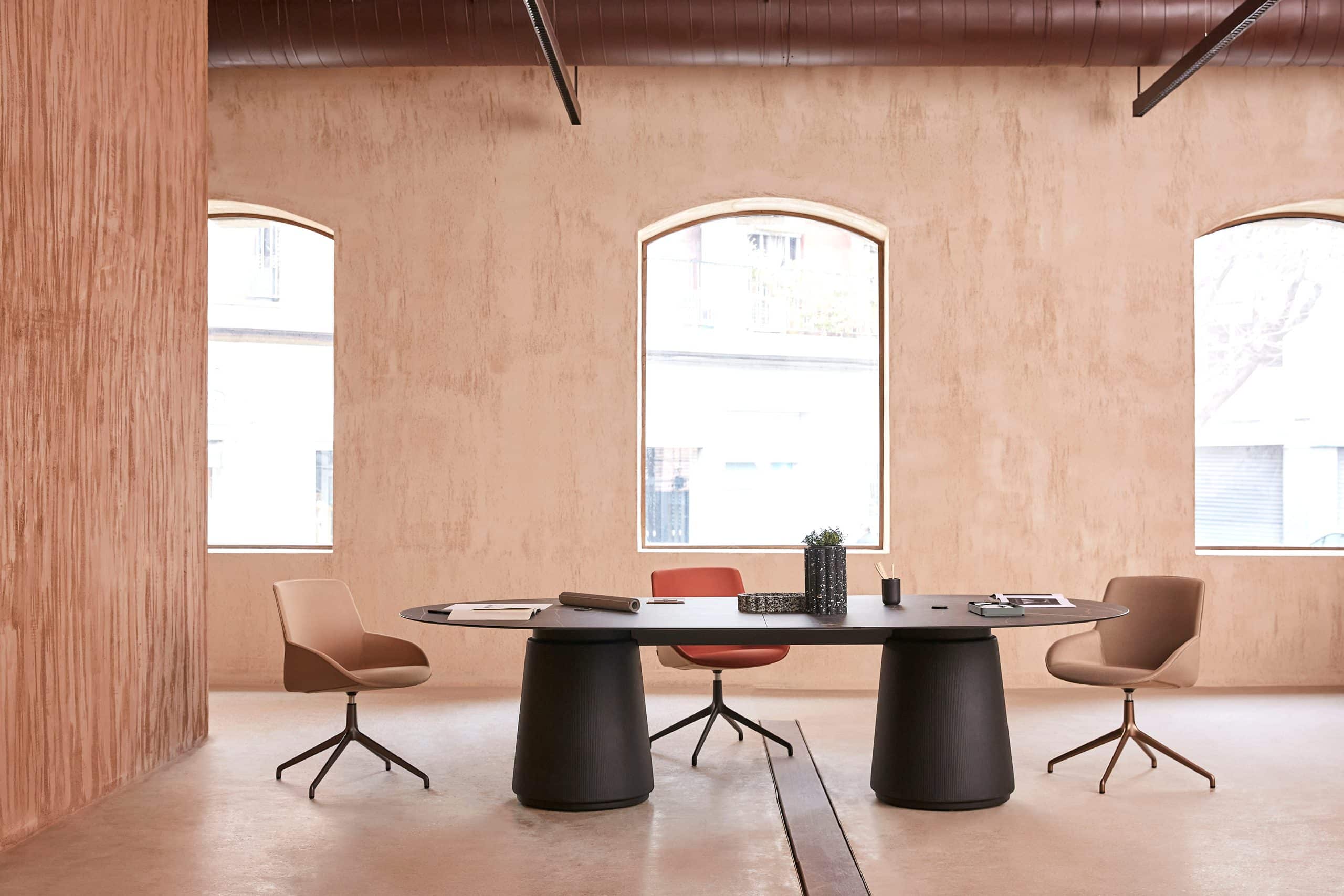 Se enfatiza la silueta vertical y el carácter escultórico de Dorik, que ordena el espacio con equilibrio entre diseño y función. Las composiciones evocan simetría y proporción desde un lenguaje actual. Imaginamos la pieza en entornos contract, reuniones, áreas colaborativas, contract... donde conversación y creatividad fluyen, reforzando su versatilidad.
