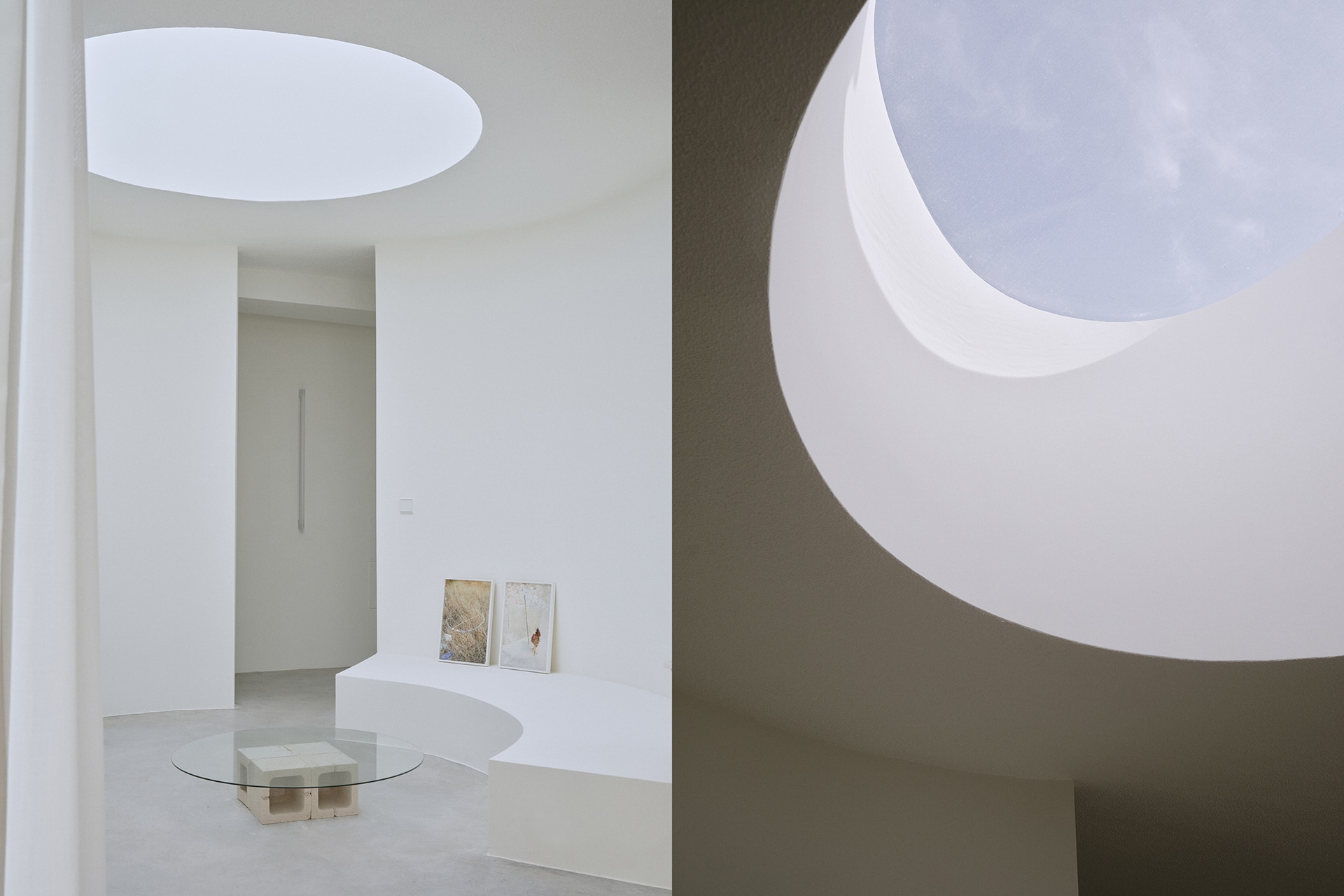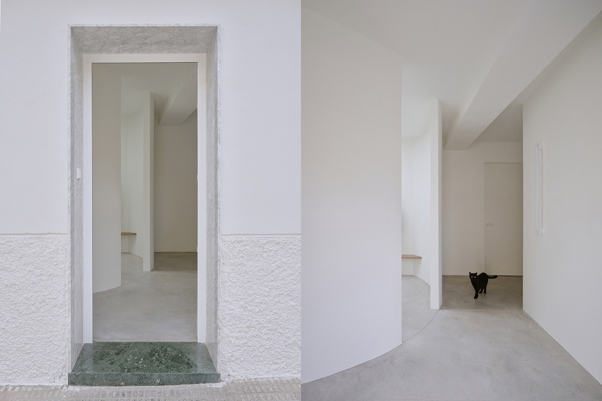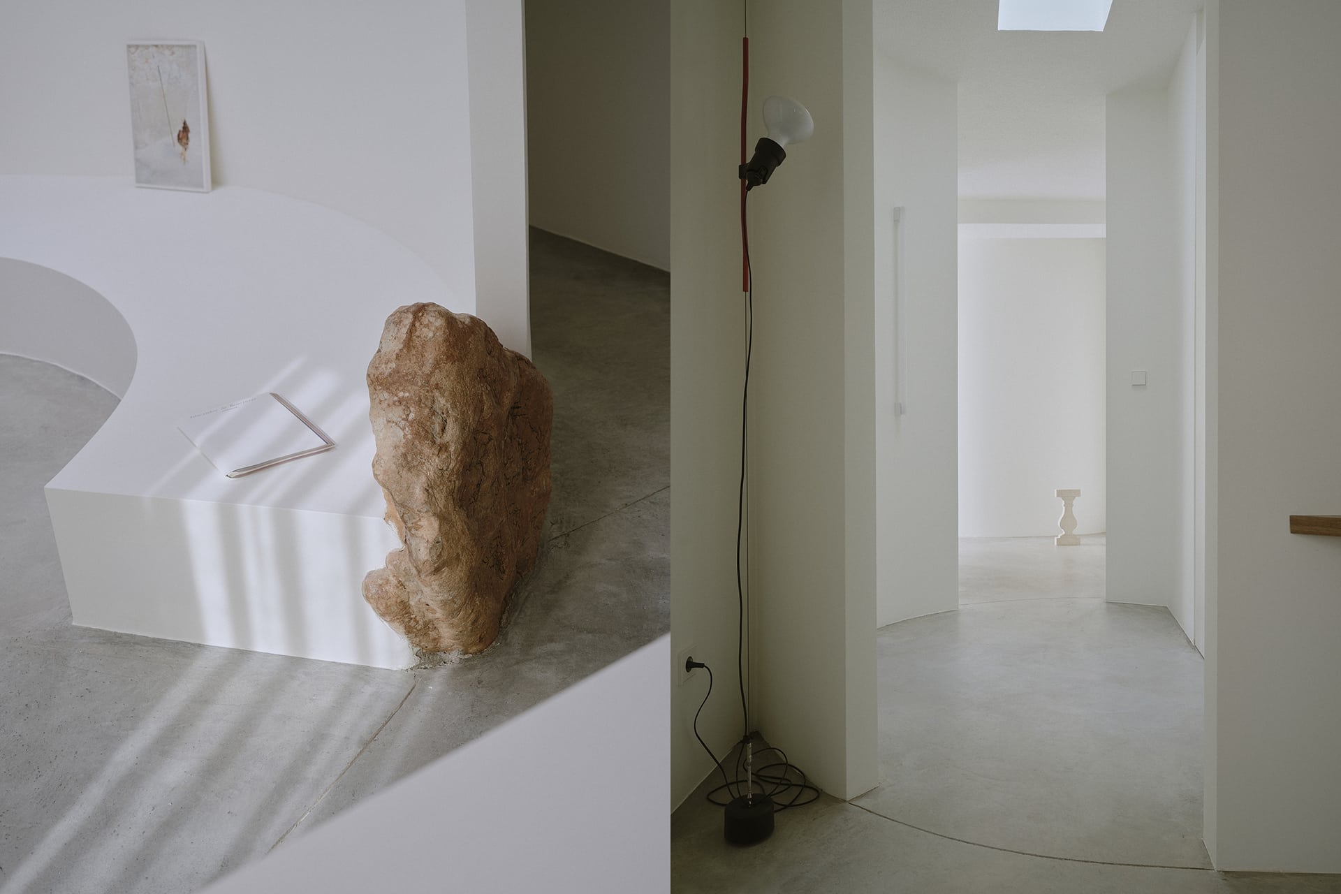 Un suelo continuo de hormigón unifica la planta y sirve de base neutra para la aparición puntual de la roca. Los paramentos claros amplifican la luz y el gotelé existente preserva la memoria doméstica. Las nuevas intervenciones son precisas y mínimas, permitiendo que identidad y uso evolucionen sin perder el origen.