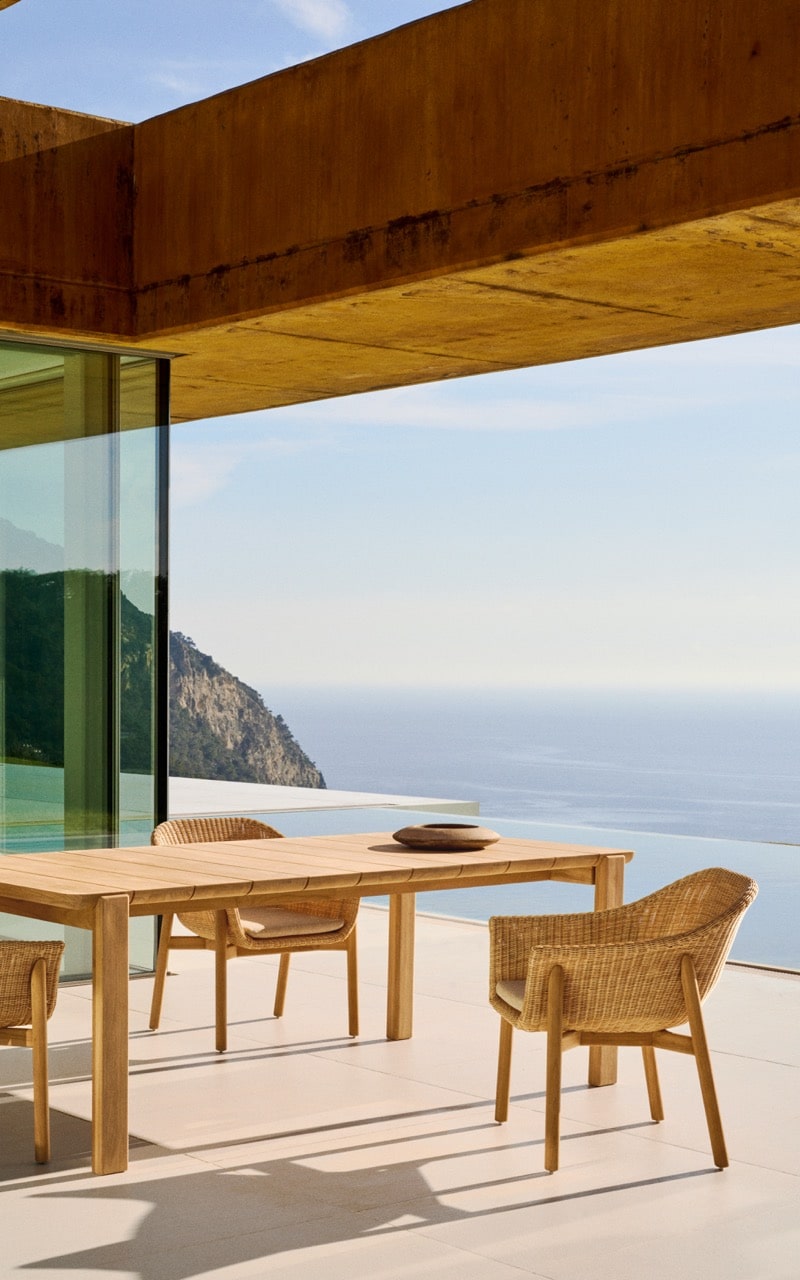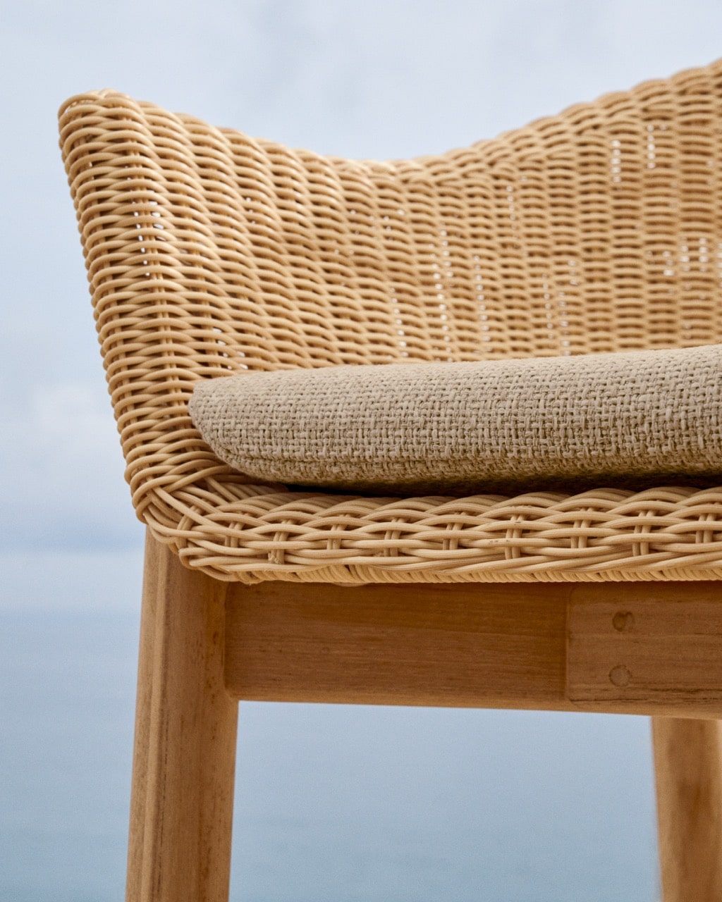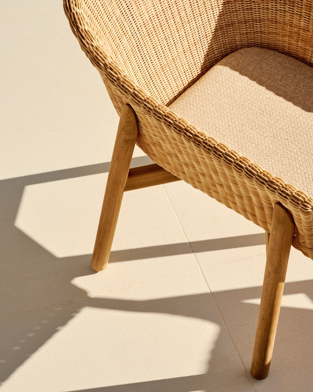 Silla en ratán y madera de teca, apta para exteriores, que utilice métodos de producción propios de la tradición mediterránea artesana.