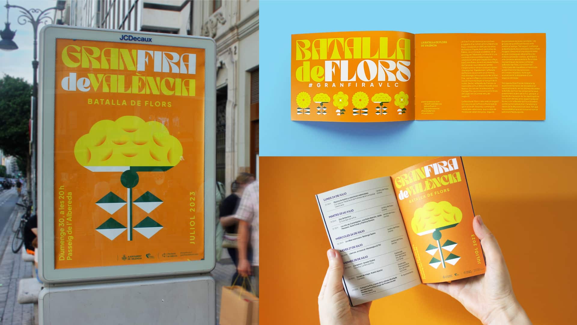 12 carteles diferentes impresos y digitales, escenografía, tótems, columnas, lonas, mupis (estándar y senior: estáticos y animados), camisetas, programación, identificadores, folleto de Batalla de Flors, estandartes y material on y off line