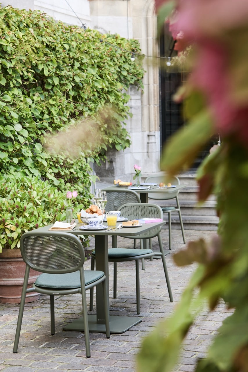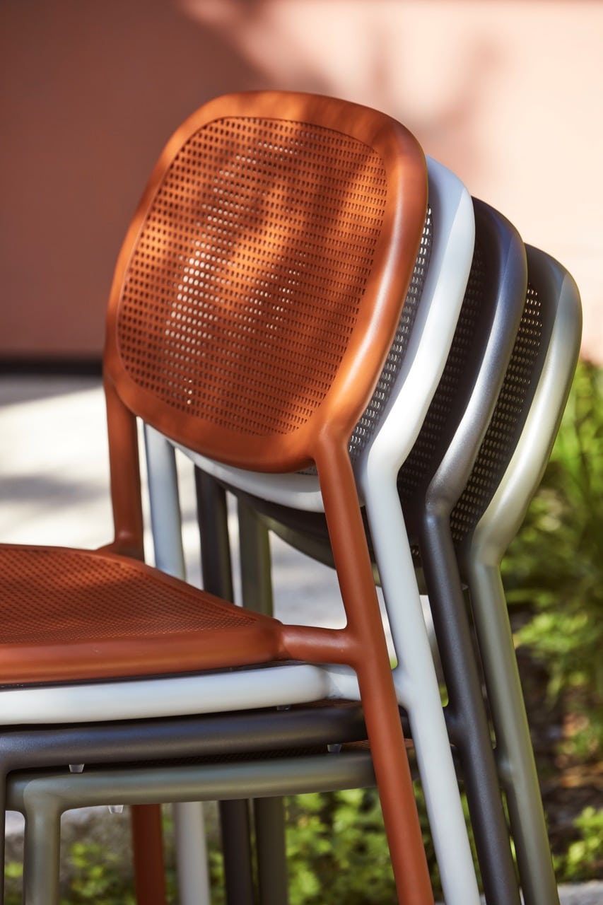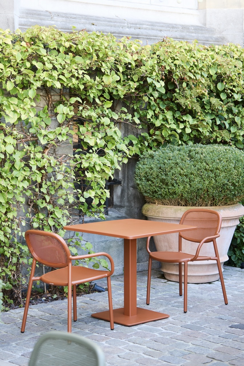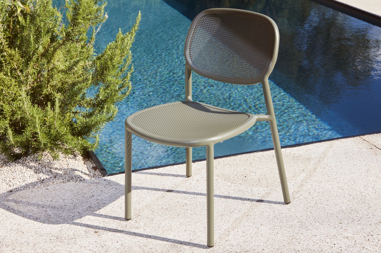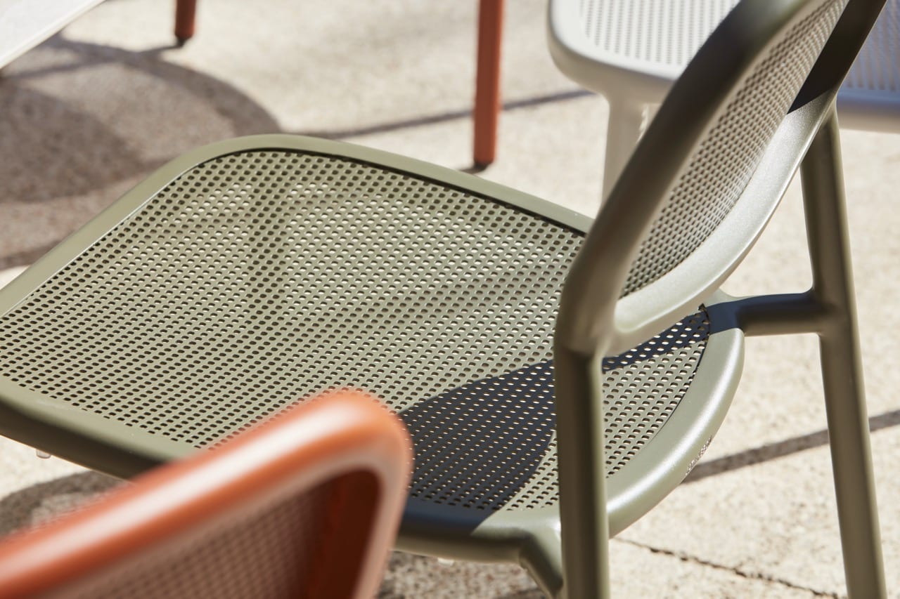 Silla con y sin brazos, apilable y realizada íntegramente en aluminio termolacado. La solución de asiento y respaldo se realiza mediante una chapa de aluminio cortada por láser que facilita la transpirabilidad y evita el agua estancada por la lluvia. Una silla polivalente, ligera, con identidad y robusta, pensada para espacios colectivos de uso intenso.