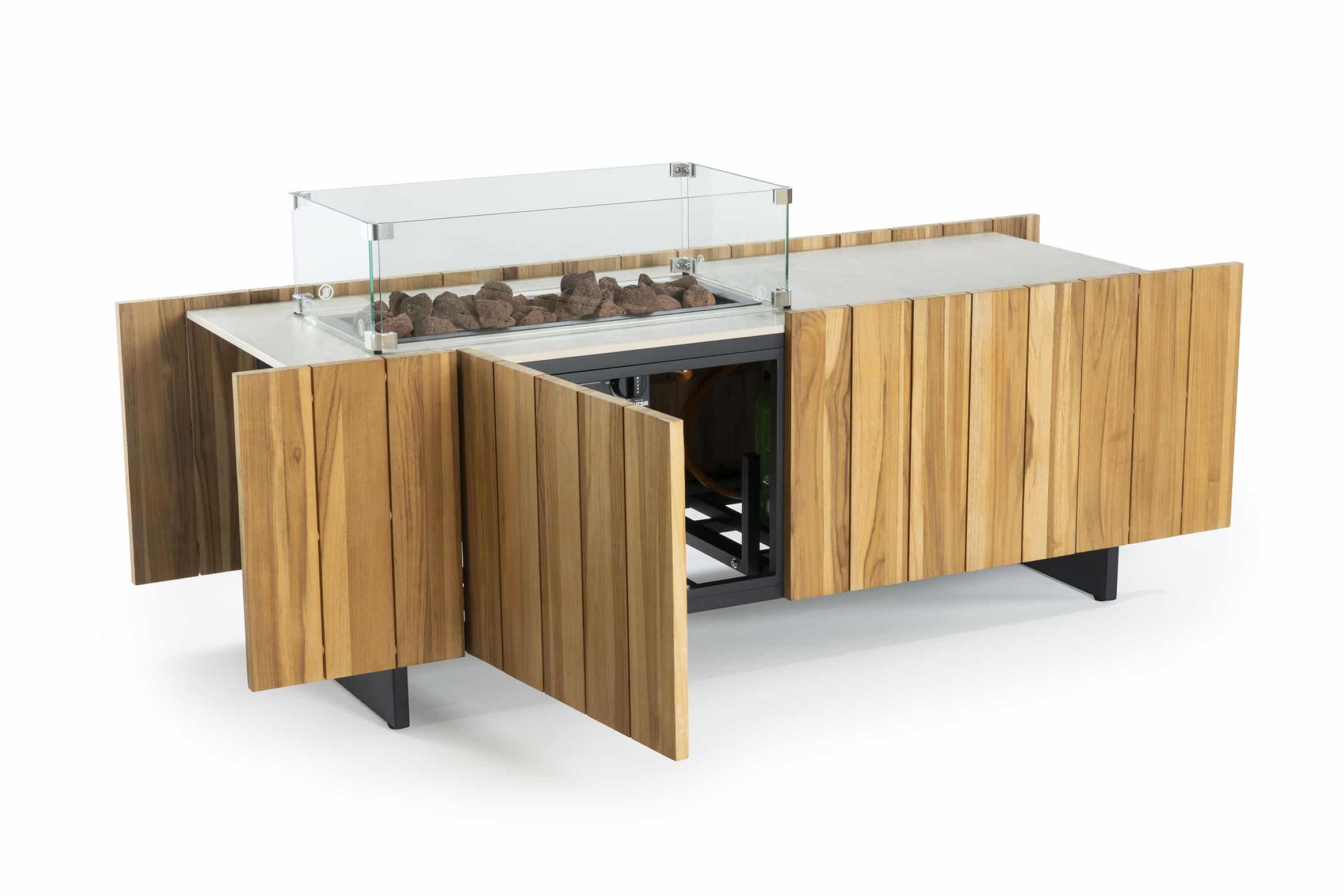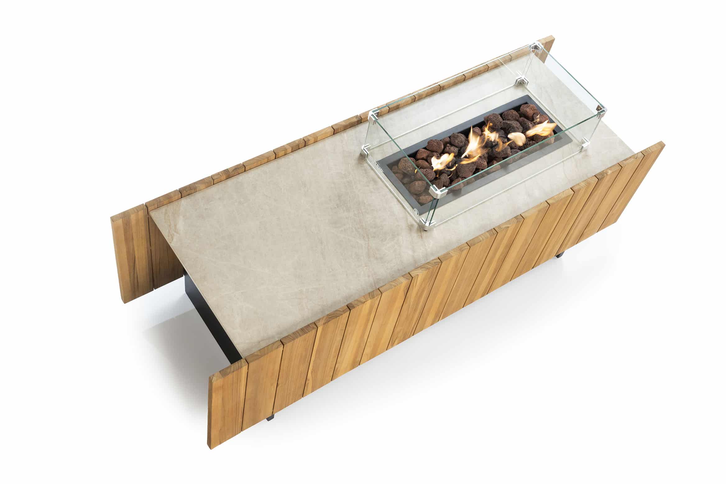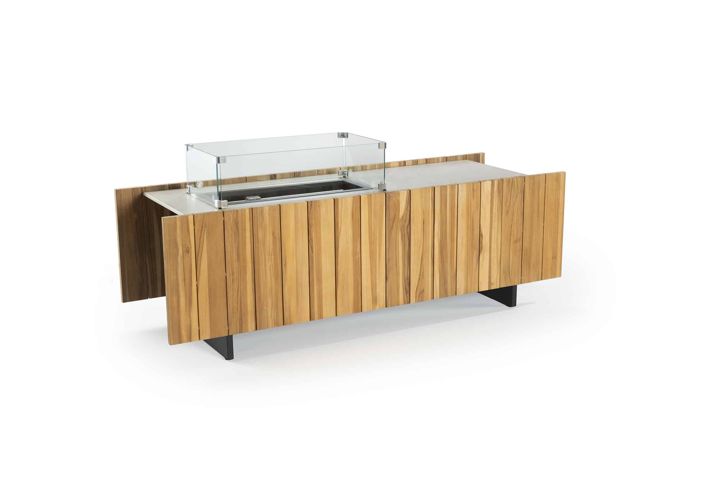 La estructura modular por piezas evoca la forma de un pabellón moderno, el fuego contenido y enmarcado por vidrio templado, se convierte en el corazón de una composición donde materialidad, orden conviven con armonía. La madera de teka aporta textura cálida, mientras la versión de piedra sinterizada ofrece resistencia extrema al uso exterior y una estética sobria y atemporal.
