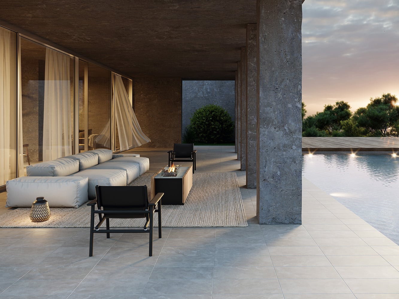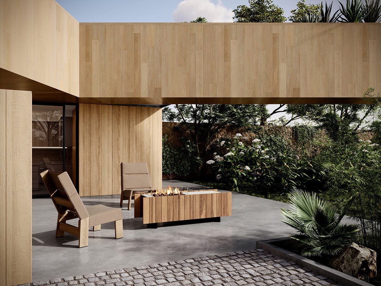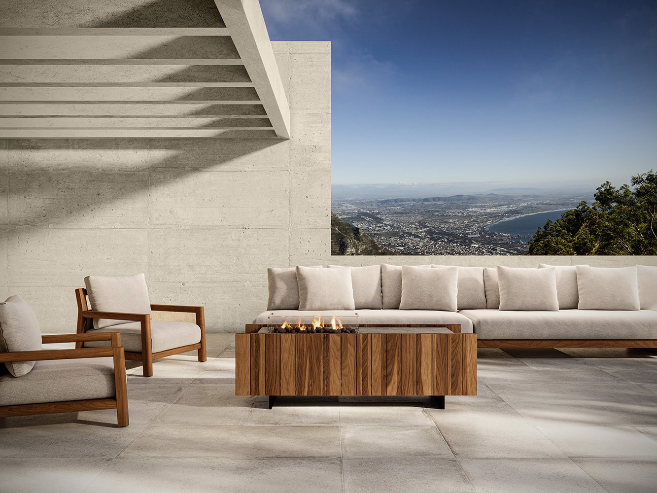 La estructura modular por piezas evoca la forma de un pabellón moderno, el fuego contenido y enmarcado por vidrio templado, se convierte en el corazón de una composición donde materialidad, orden conviven con armonía. La madera de teka aporta textura cálida, mientras la versión de piedra sinterizada ofrece resistencia extrema al uso exterior y una estética sobria y atemporal.