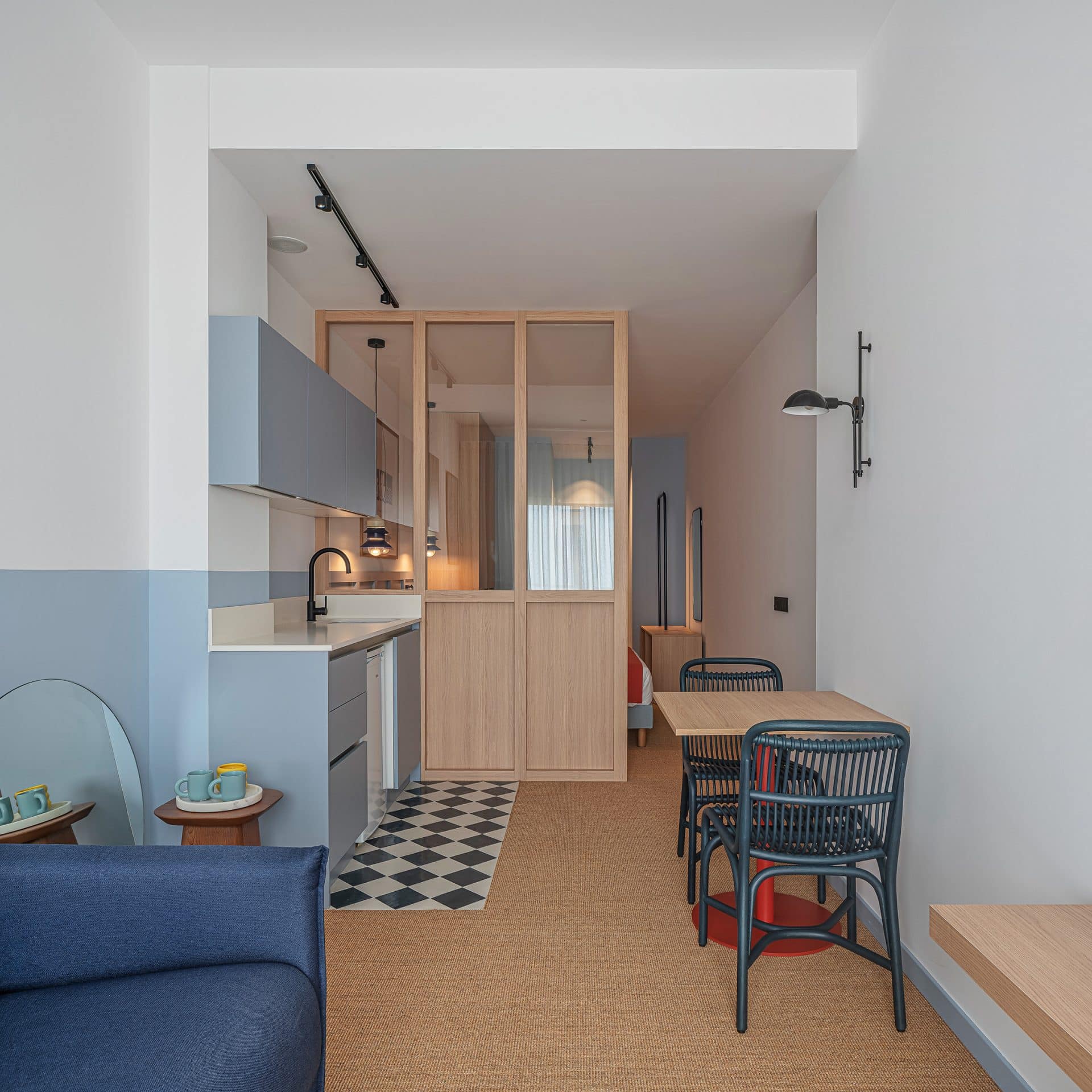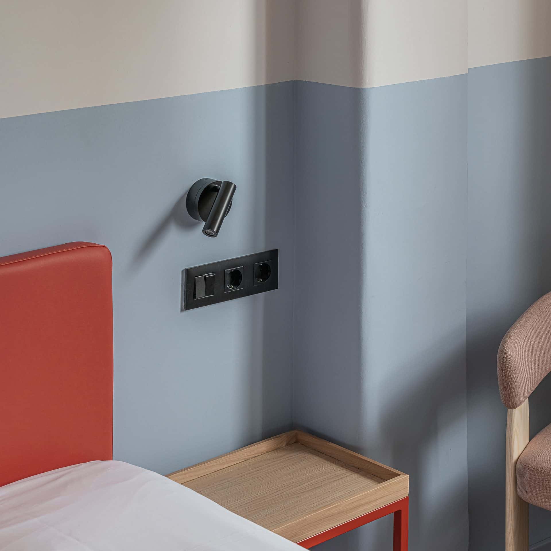 Se diseñó y fabricó la mayoría de mobiliario a medida, adaptándonos a cada habitación. La calidez de la madera y los colores vibrantes acompañan desde el mostrador de recepción hasta cada habitación: cabeceros, mesitas, escritorios y percheros.