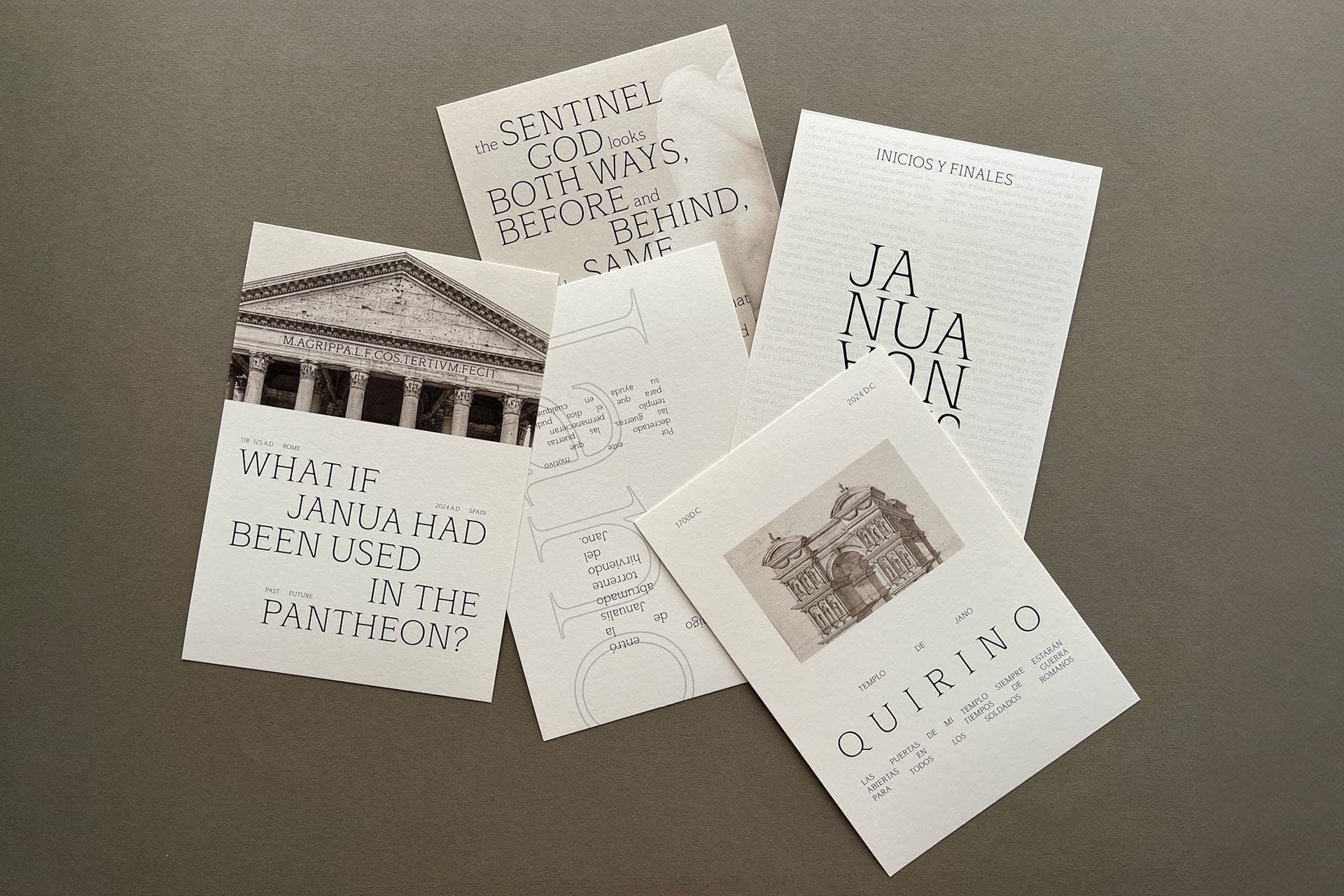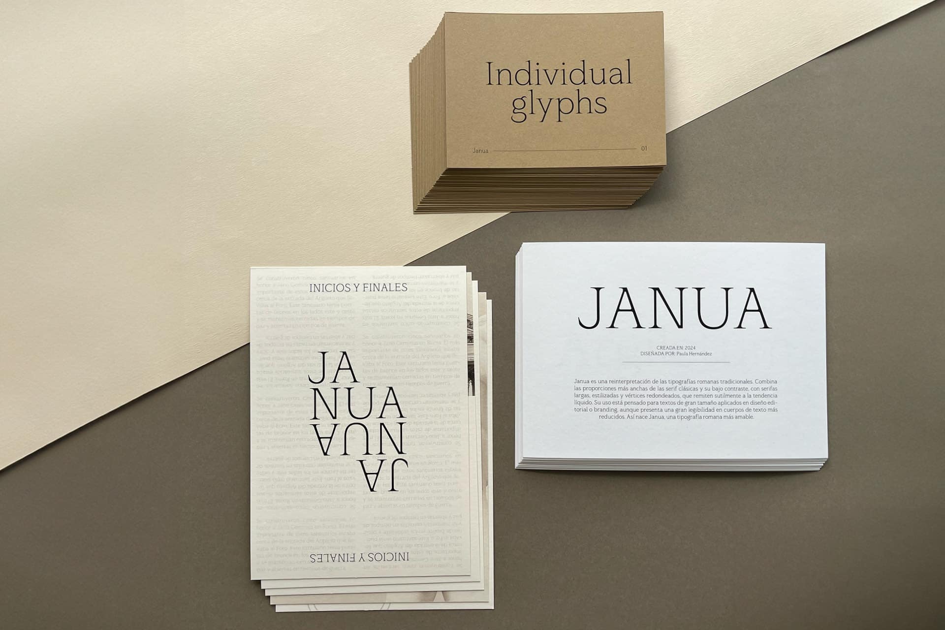 Janua, de proporciones clásicas romanas actualizadas sutilmente con la tendencia líquido, está pensada para titulares o textos grandes, aun siendo funcional en textos pequeños. Su nombre proviene de Jano, dios romano de las transiciones, los inicios y los finales, representado con dos caras en direcciones opuestas, pasado y futuro. Se asocia con la entrada y salida de un ciclo, el final del grado.