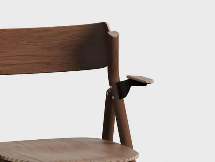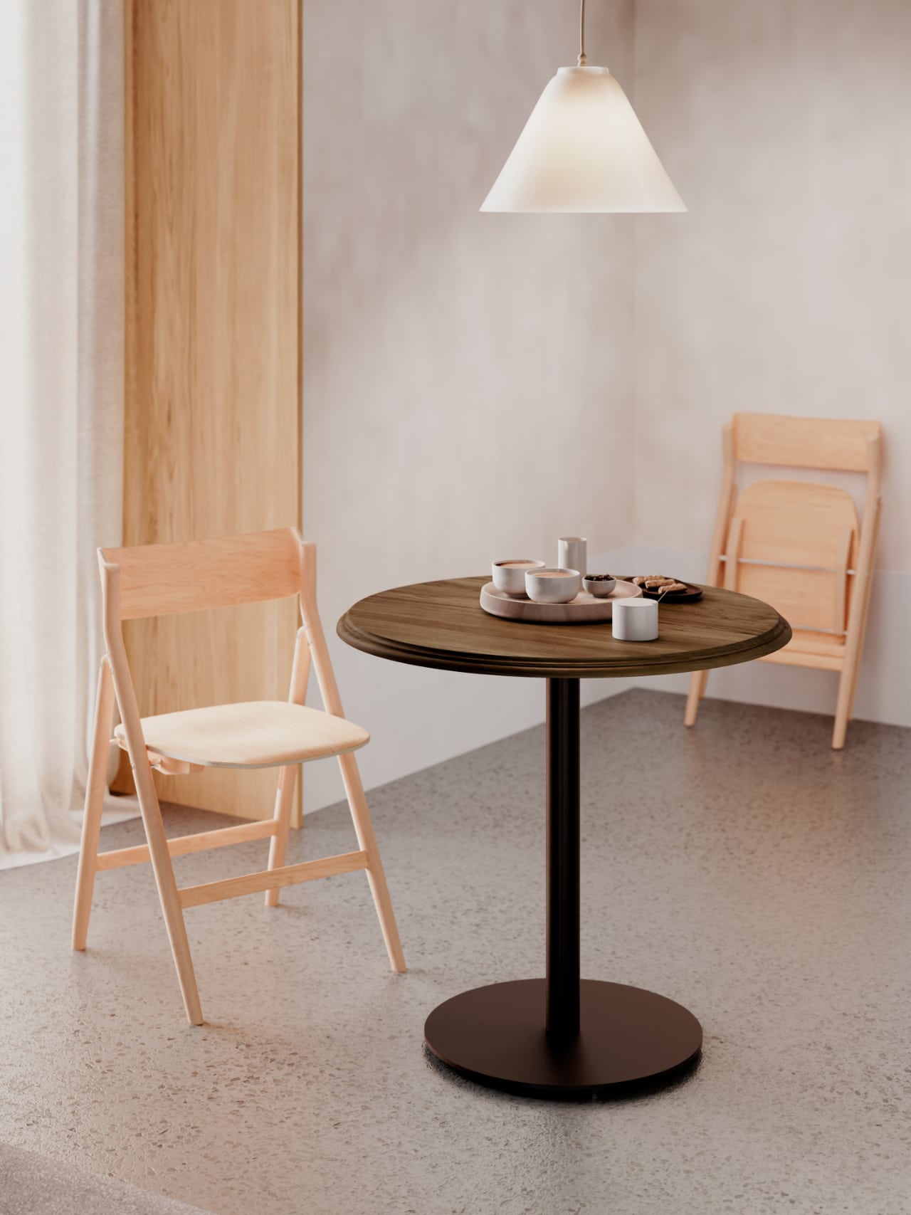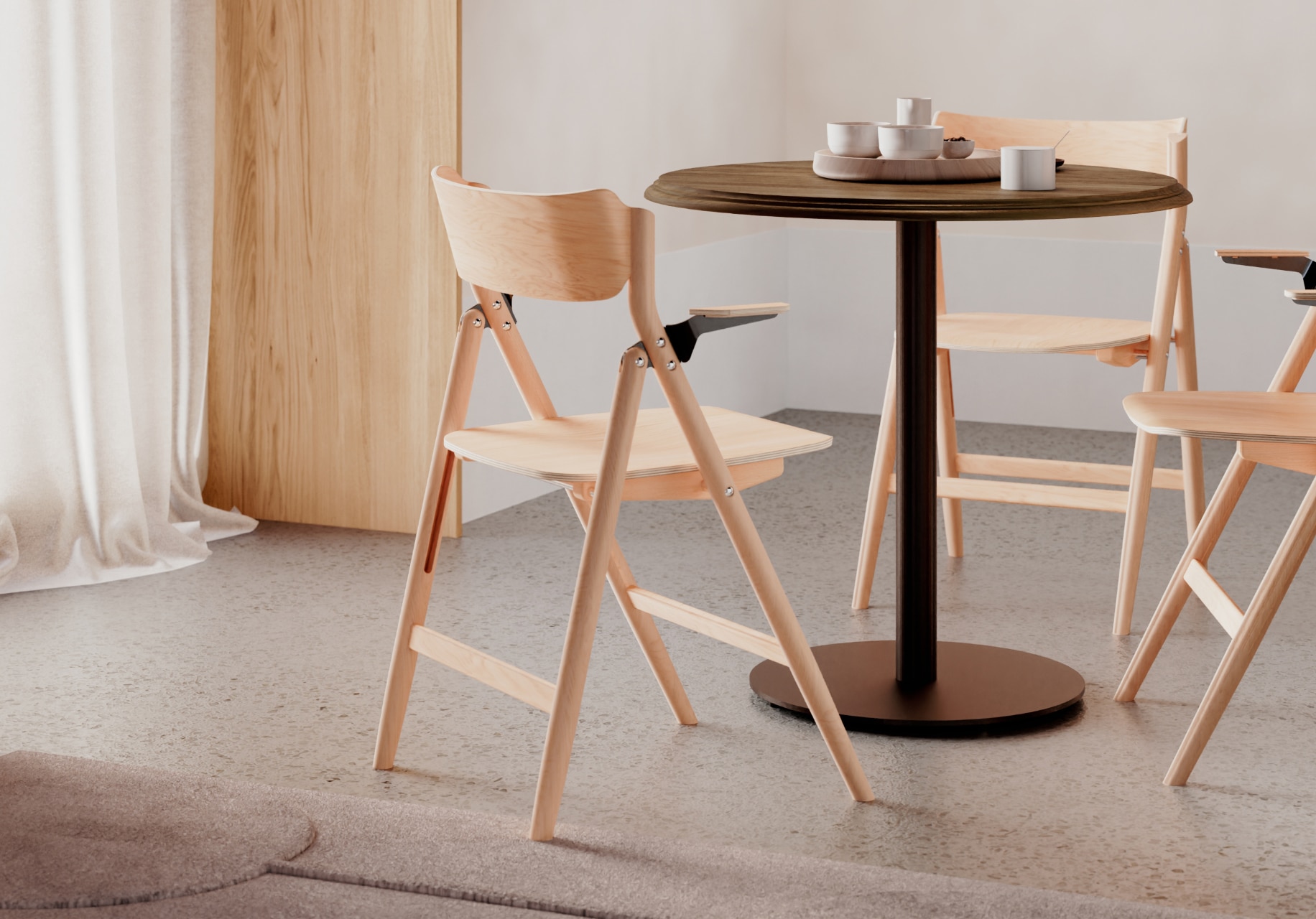 Fameg, especialista en madera curvada, buscaba una pieza que conectara su tradición artesanal con el diseño contemporáneo. El briefing pedía una silla apilable y versátil, destinada al sector contract y hostelería. El objetivo era crear un producto ligero, visualmente sencillo pero con un detalle distintivo que resaltara la maestría técnica de la fábrica en el uso de la madera.