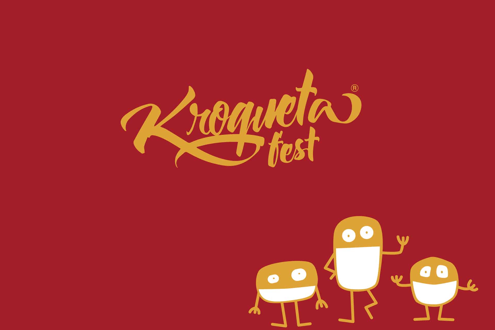 En cuanto a la marca realizamos un logotipo en caligrafía, manuscrita. Dotándola de un color amarillo/ocre sobre un fondo rojo, enfatizando así un color "croqueta". Para las aplicaciones, diseñamos/ilustramos 3 croquetas (Kroquetín, Kroquetón y Kroqueta) en tintas planas, que nos acompañan en todo el evento, de la mano también de frases relacionadas con croquetas.