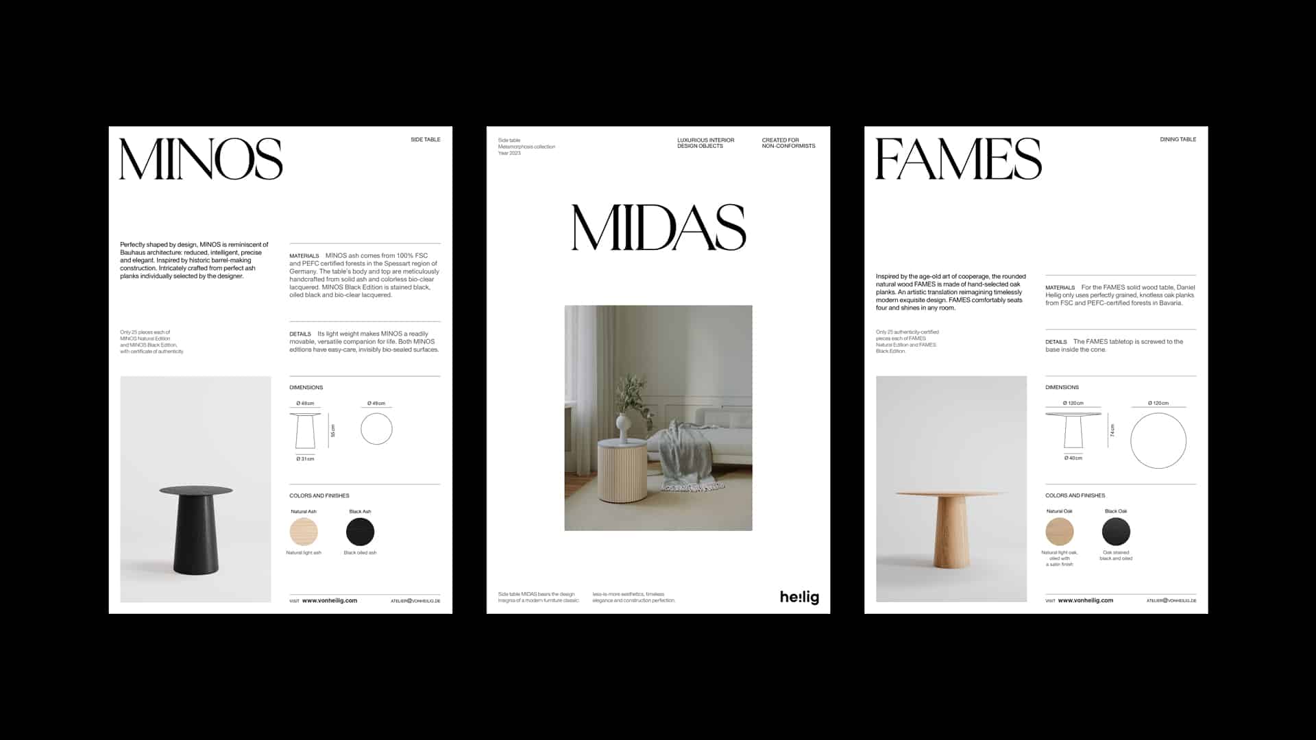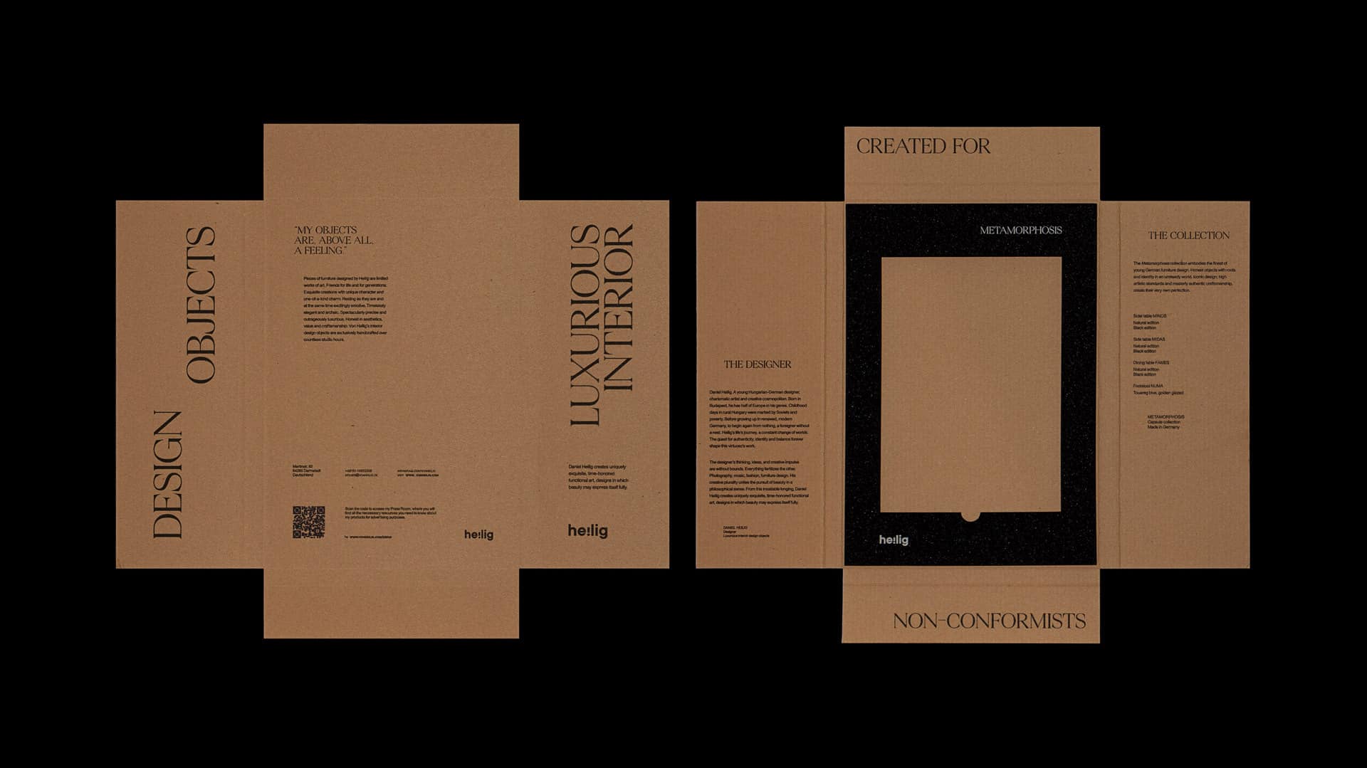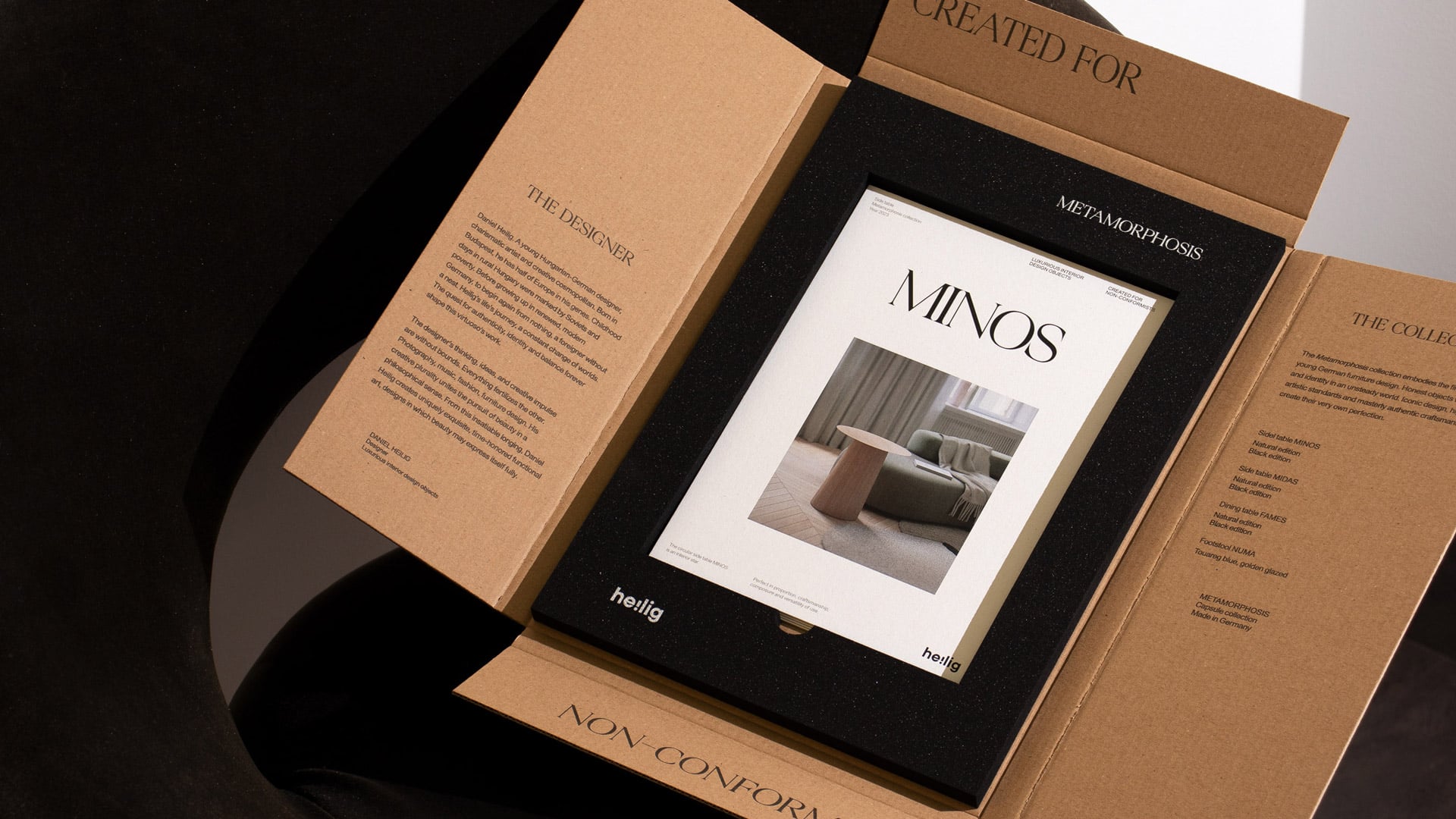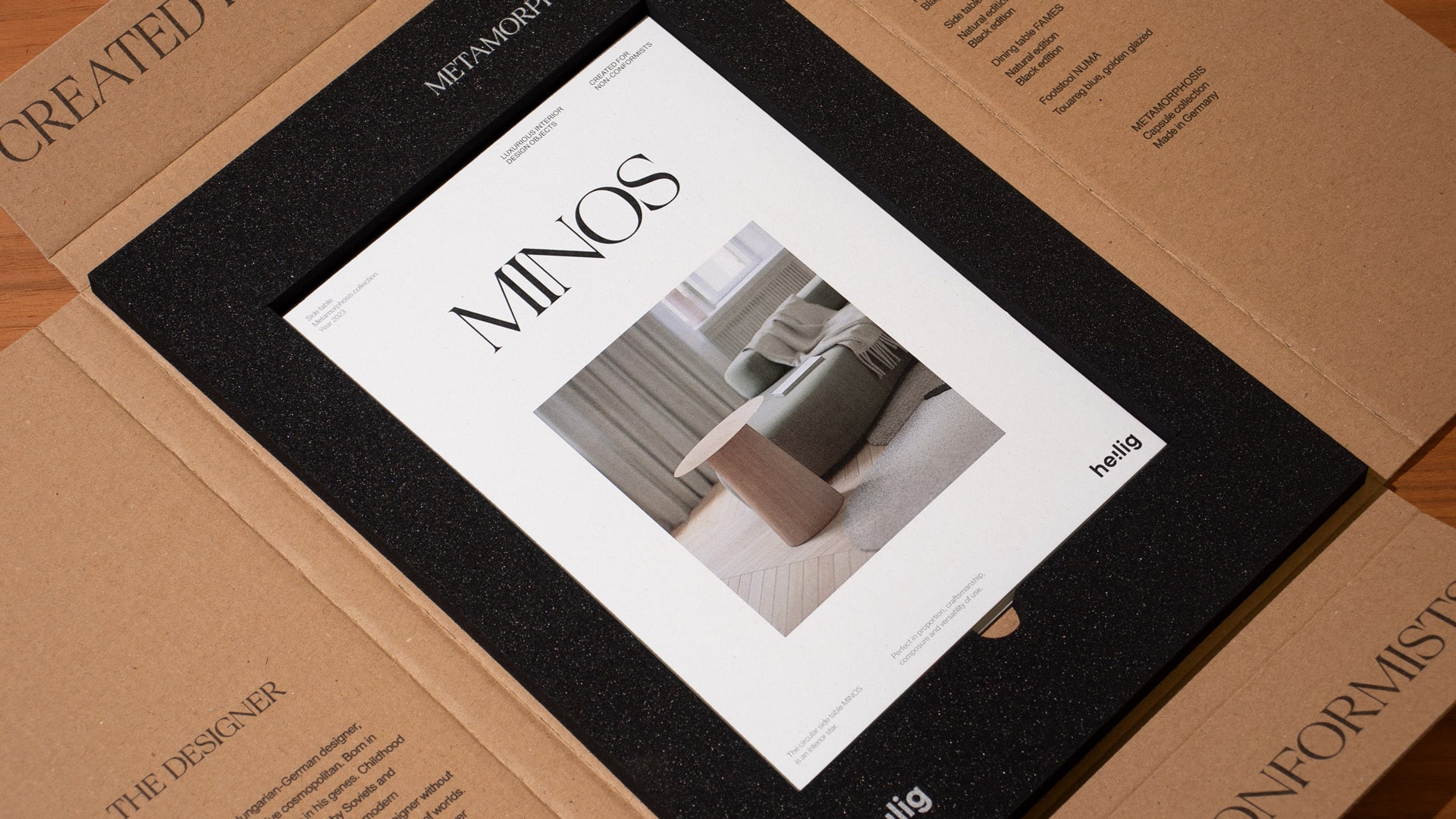 Heilig Objects, marca alemana dedicada a la producción de muebles de diseño, necesitaba un elemento para promocionar su nueva colección, Metamorphosis. Éste debía contener fichas de cada mueble e información sobre la colección y la propia marca.