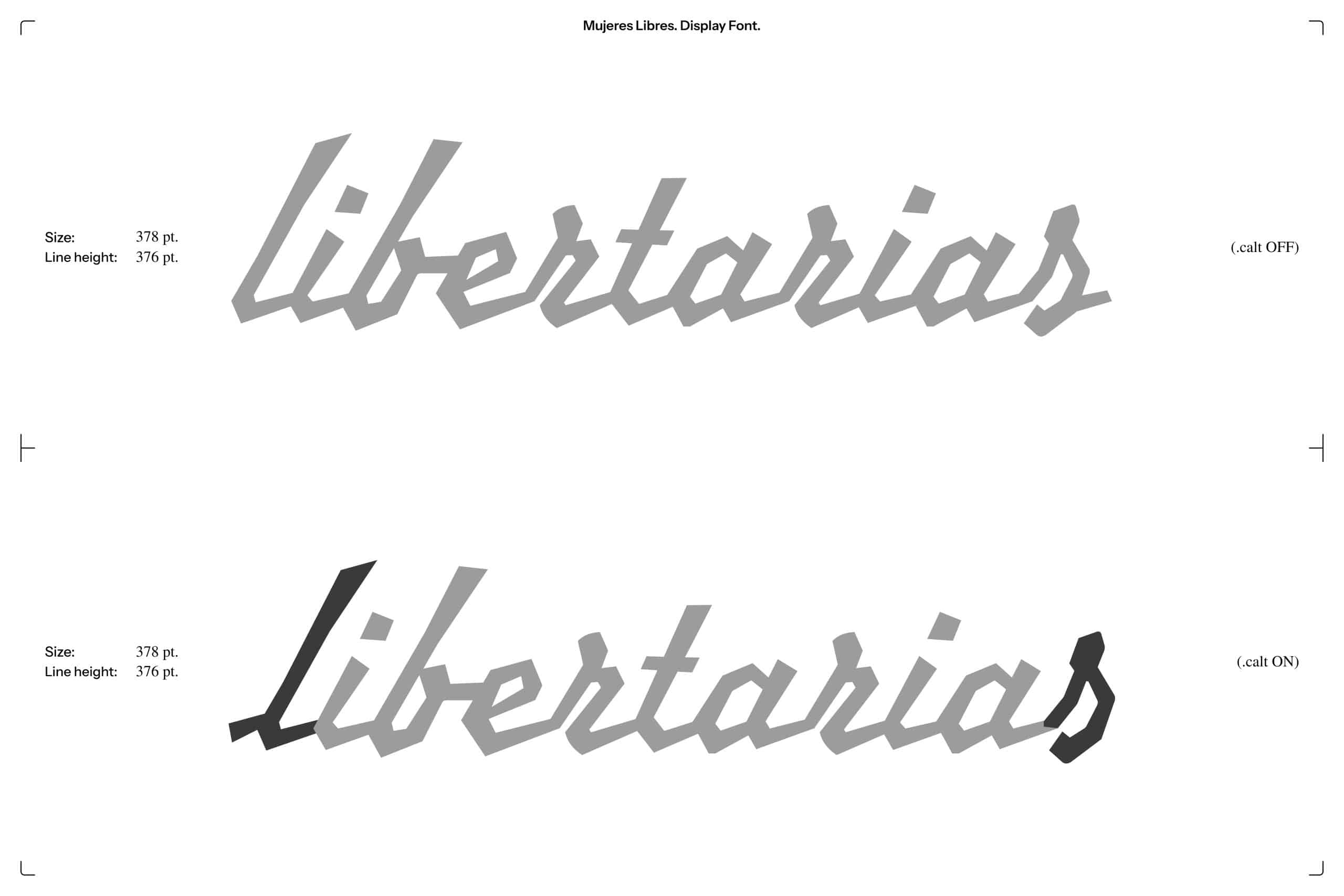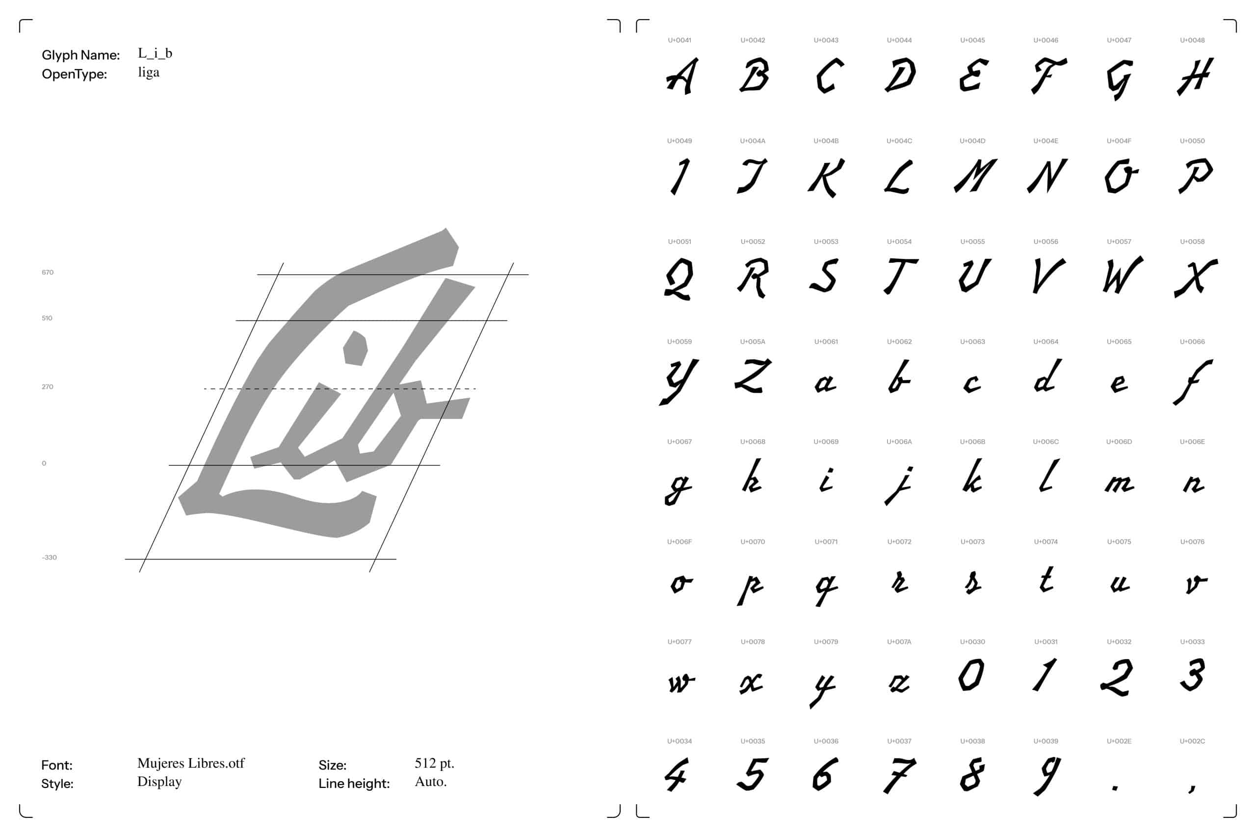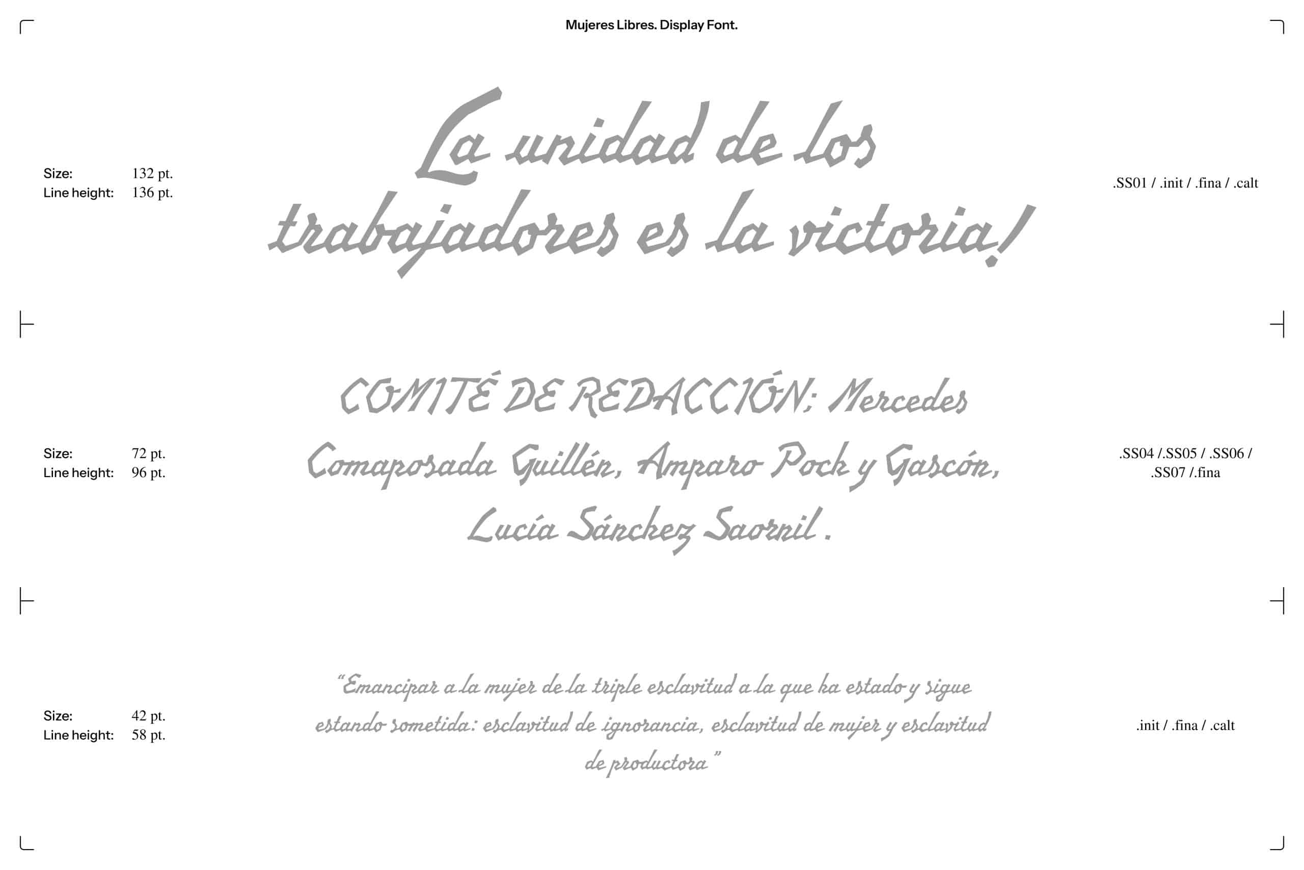 Mujeres Libres se presenta como una fuente digital que rescata las expresiones tipográficas vernáculas observadas en el cartel "Mujeres! Vuestra familia la constituyen los luchadores de la Libertad" (Mujeres Libres, 1937). El producto resultante funciona de forma óptima en contextos display y preserva la lógica constructiva de la cursiva del lettering original.
