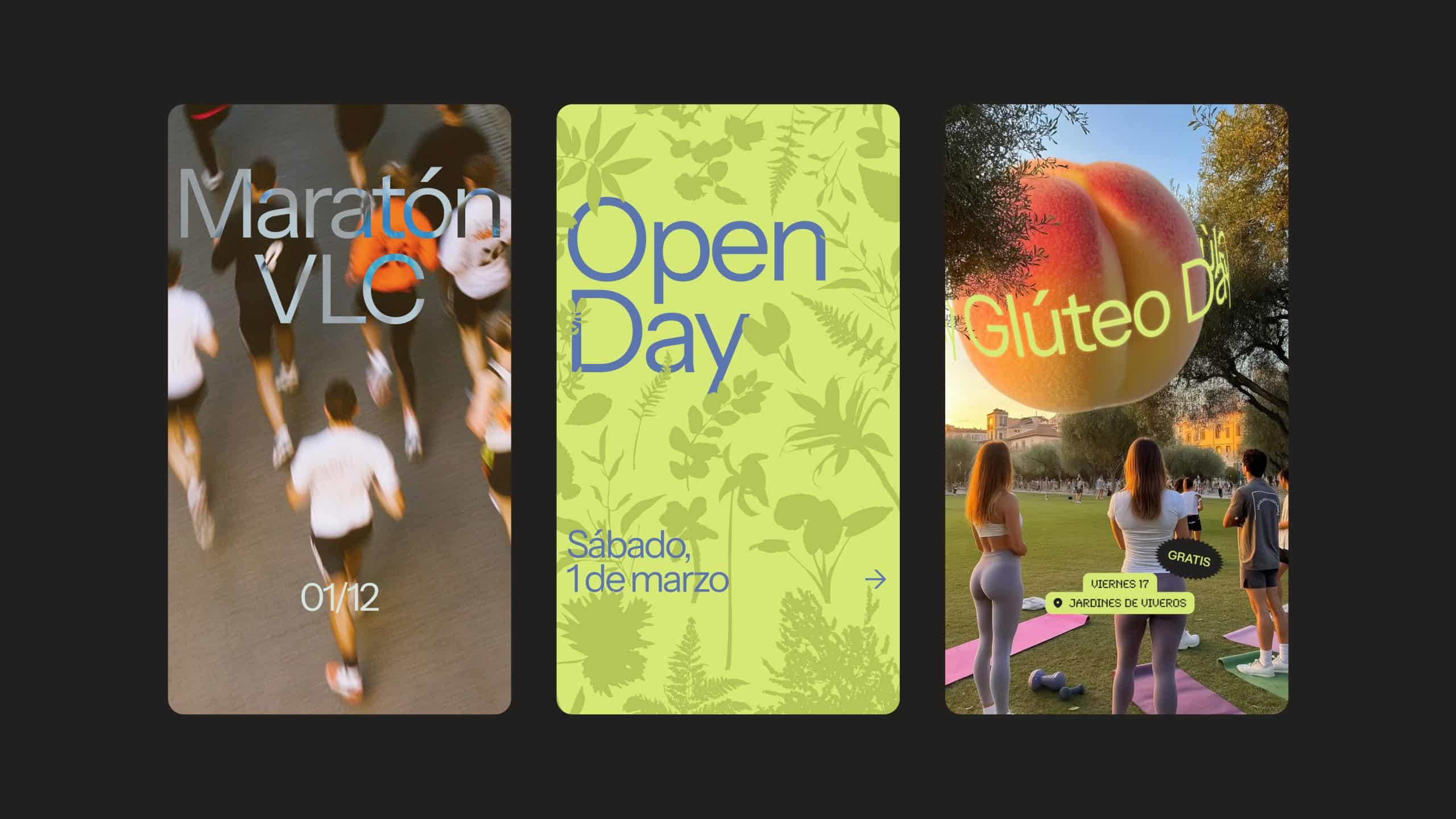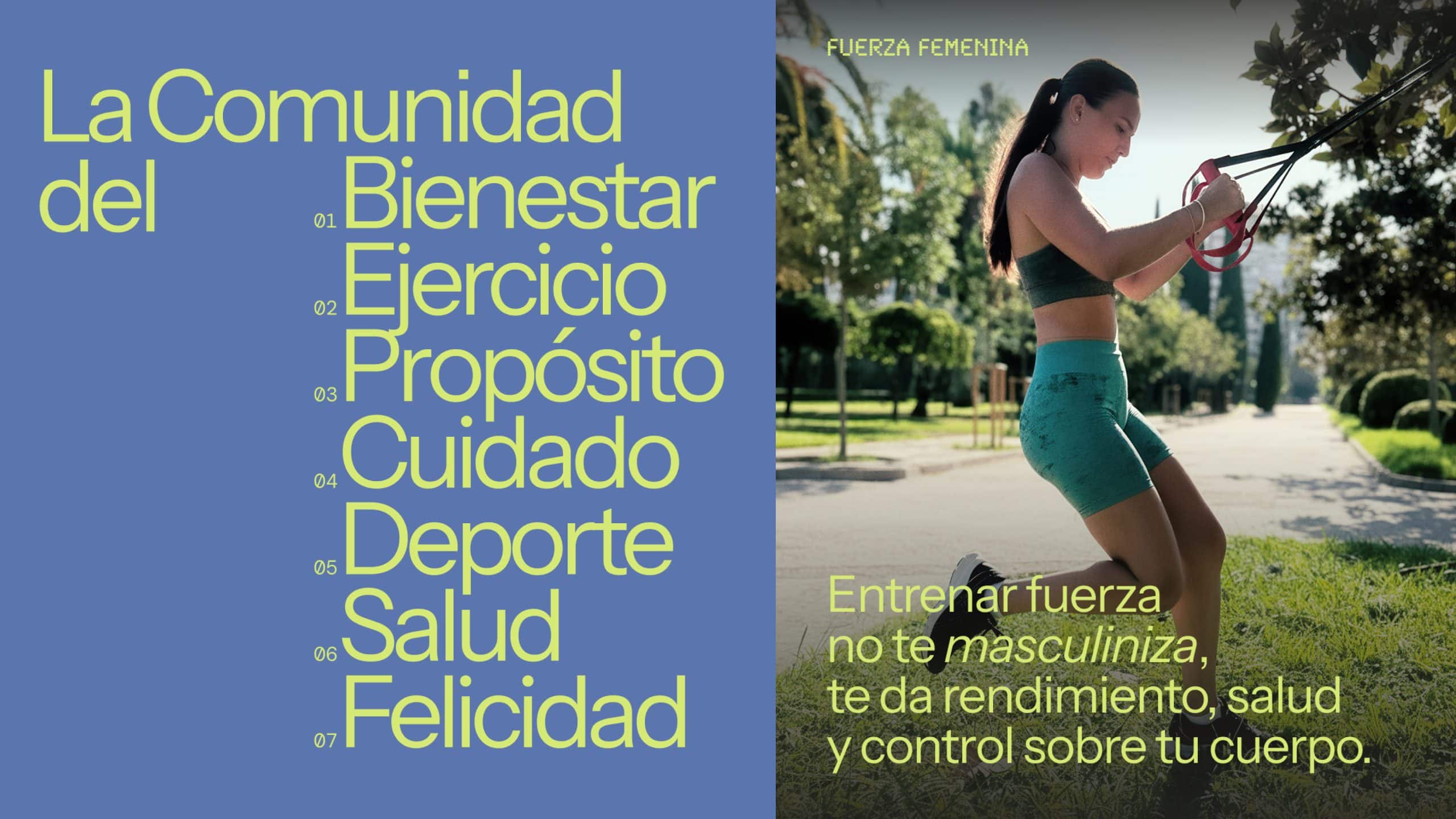 La Comunidad del Bienestar es el concepto con el que se desarrolla el branding. Un sistema que a través del uso del color, la tipografía, el uso de siluetas y un lenguaje verbal cercano, genera una identidad que se aleja de los estereotipos que representan el ejercicio como algo masculino y competitivo. Una nueva forma de comunicar, más inclusiva y positiva.
