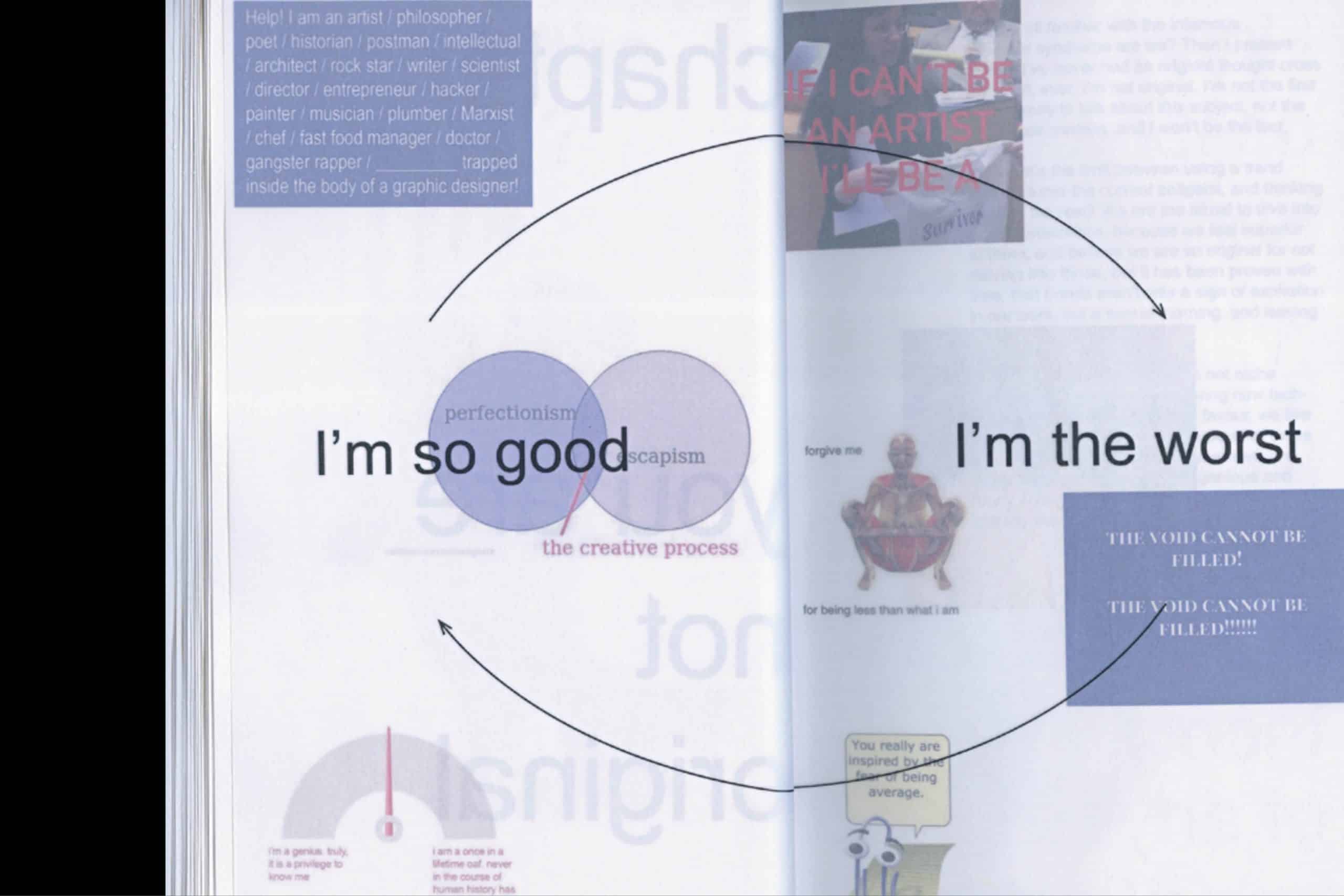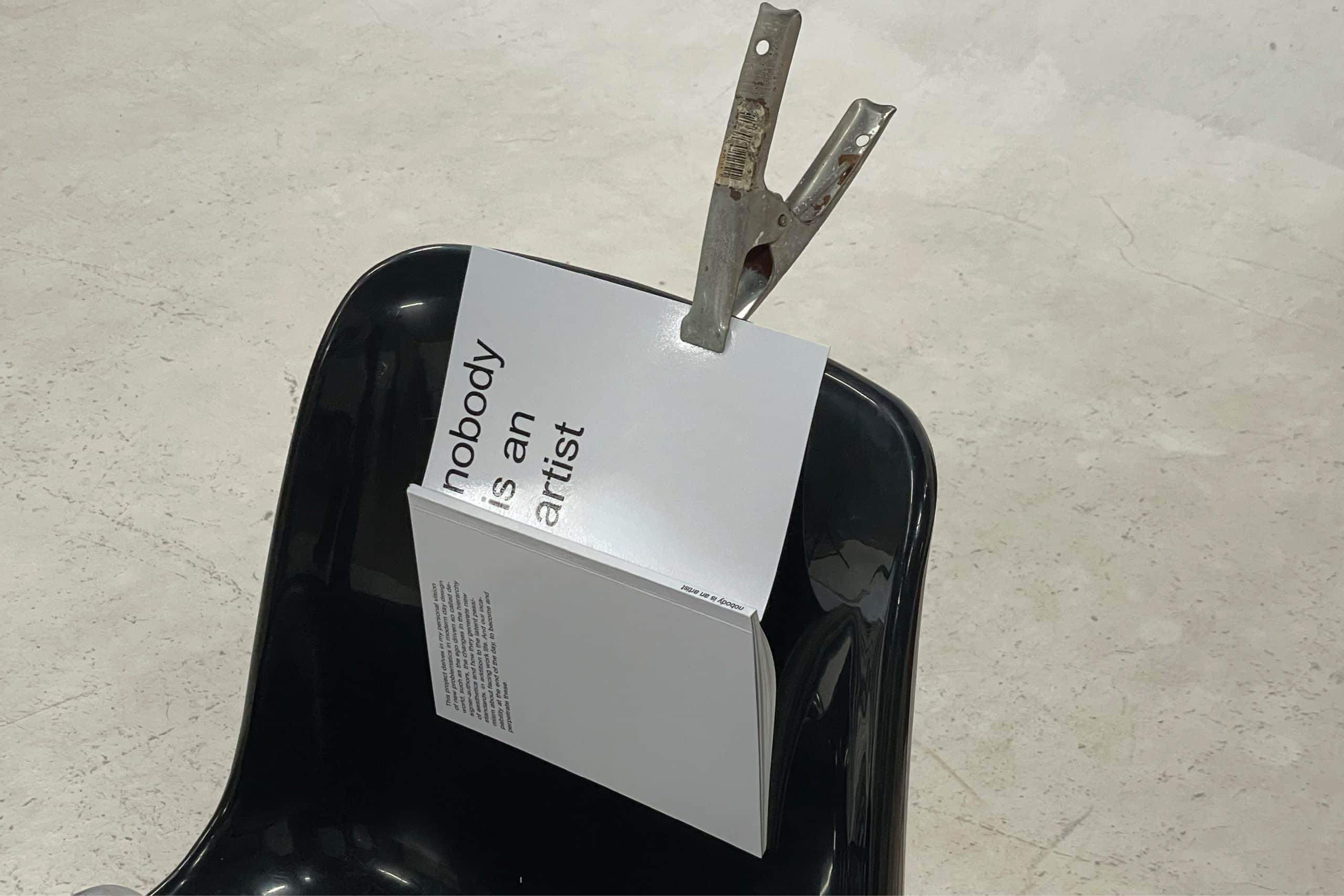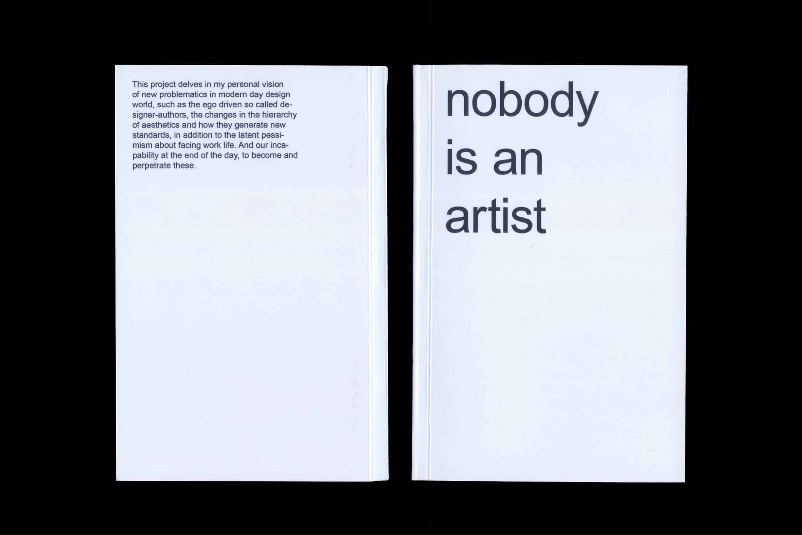 Aunque suene a cliché o a error no saber explicar o describir un proyecto, en este caso no saber definirlo parece lo más acertado. Nobody is an artist no es una publicación, ni un objeto, ni un libro de artista: no es nada de eso y a la vez lo es todo. Como trabajo final decidí hablar de diseño y de problemáticas vividas durante los estudios.