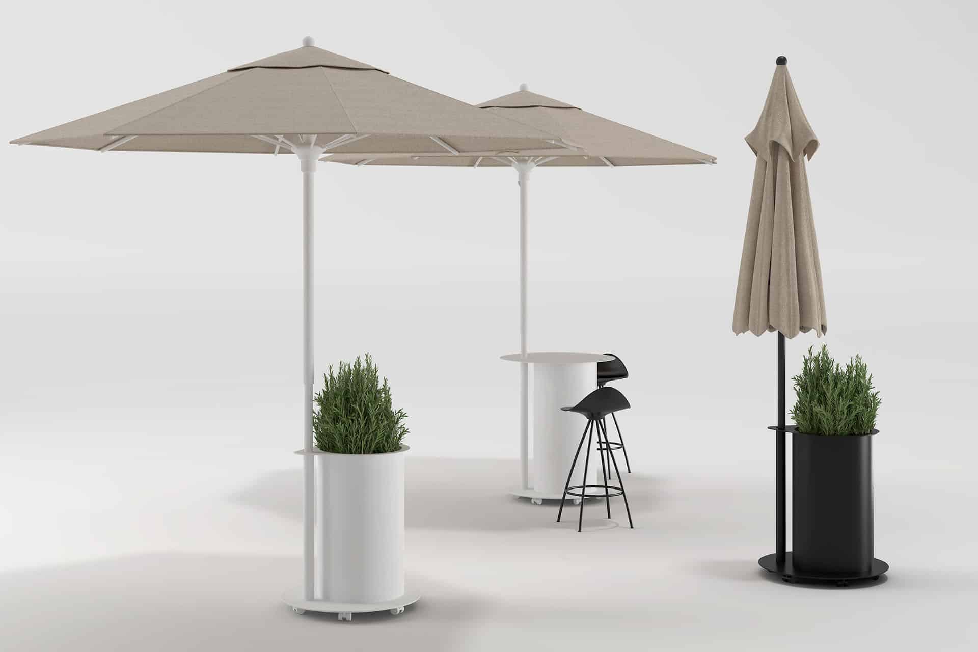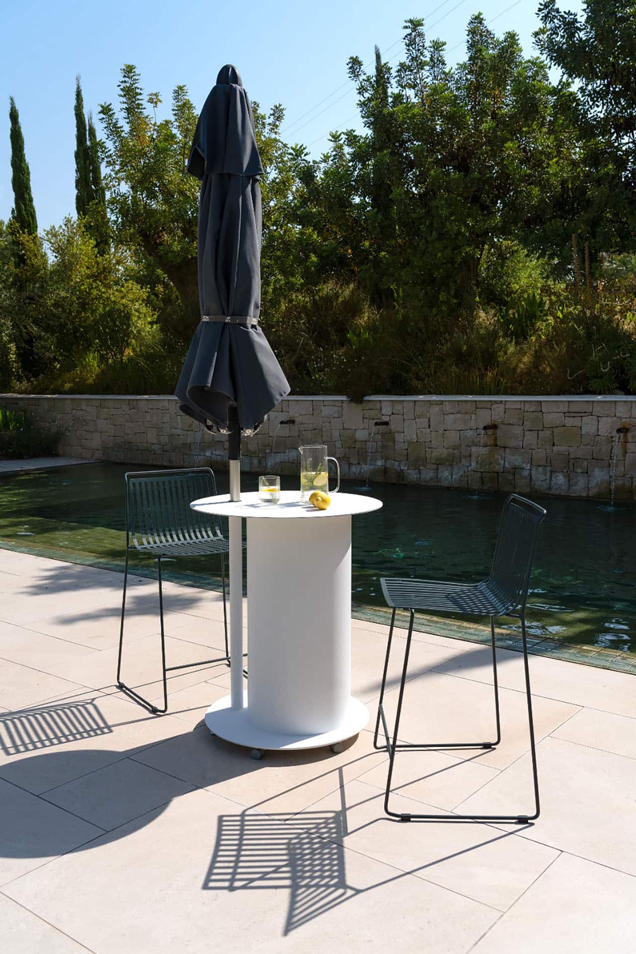 El soporte de sombrilla Parallel destaca por su diseño de líneas paralelas, que transmite equilibrio y orden, integrándose en cualquier espacio exterior. Disponible como mesa o macetero en dos alturas, incluye ruedas para facilitar su movilidad, combinando funcionalidad, comodidad y estilo decorativo.