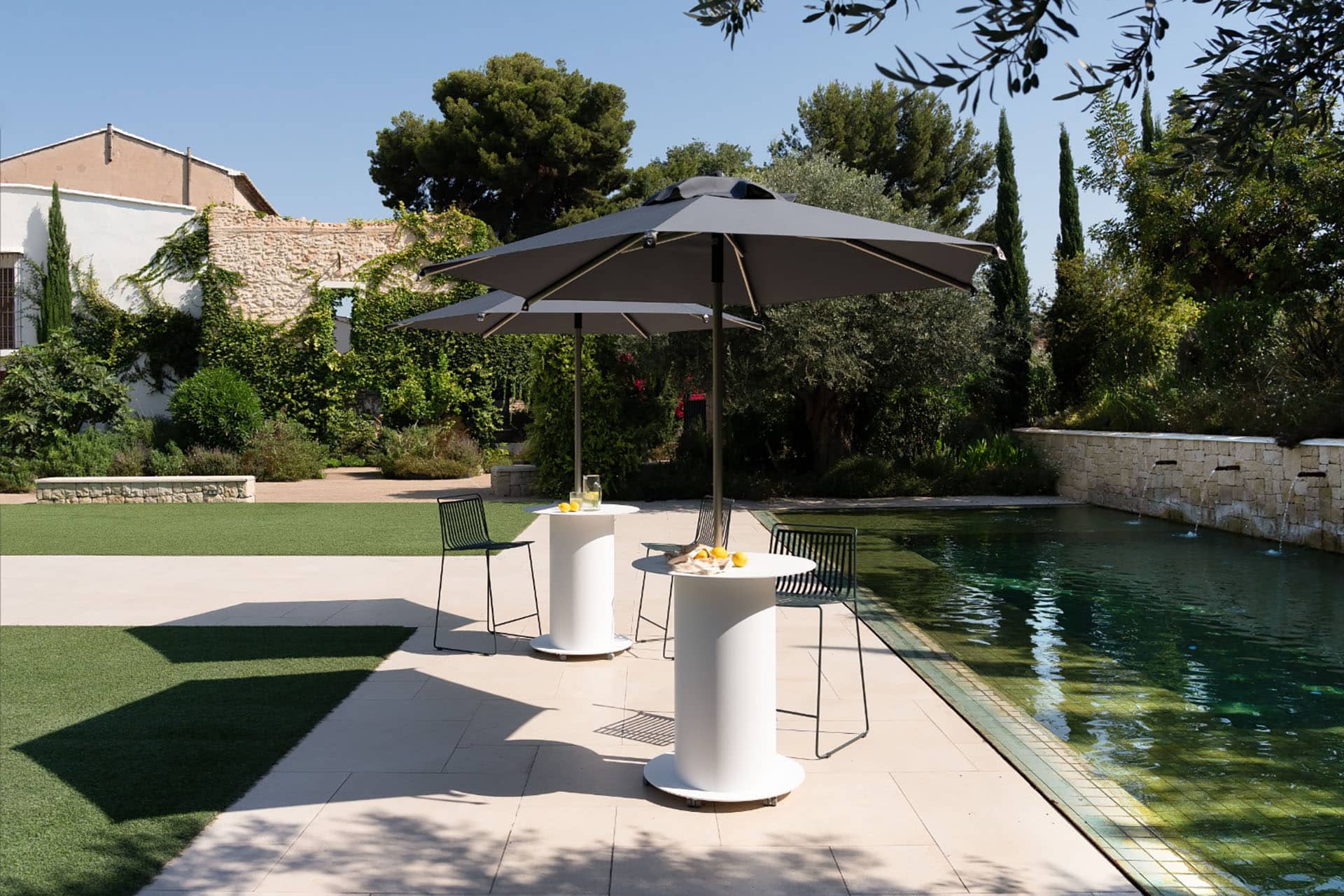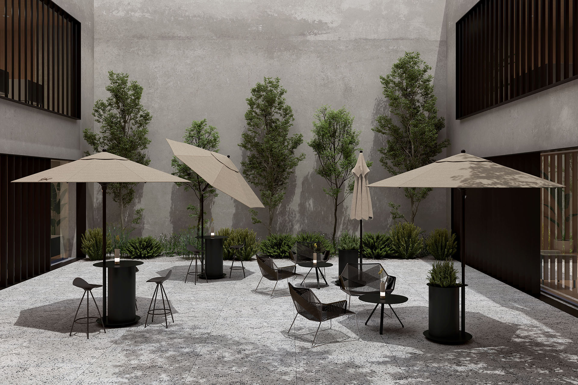 Se plantea el diseño de un mueble de exterior polivalente que combine las funciones de mesa y soporte para sombrilla, destinado a espacios exteriores tanto residenciales como contract. El producto debe responder a criterios de funcionalidad, durabilidad, estabilidad y estética contemporánea, optimizando el uso del espacio y reduciendo el número de elementos necesarios en el entorno exterior.