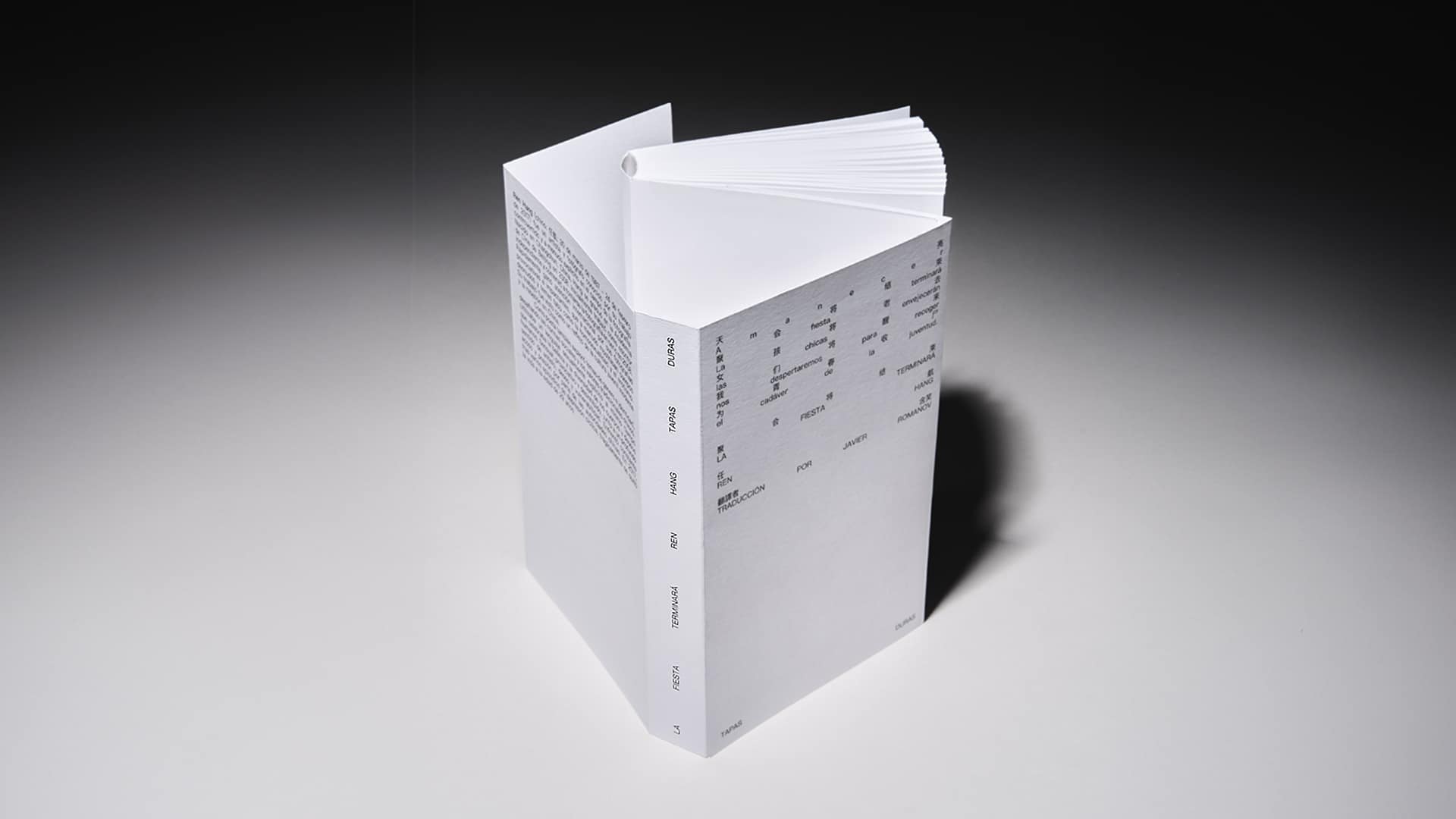 Un libro puramente blanco, en oposición al negro de los poemas, siempre en páginas pares, que se posicionan en el extremo de los márgenes, pues era un autor que se mantenía en los límites. La portada, juego gráfico que alude al proceso de traducción.