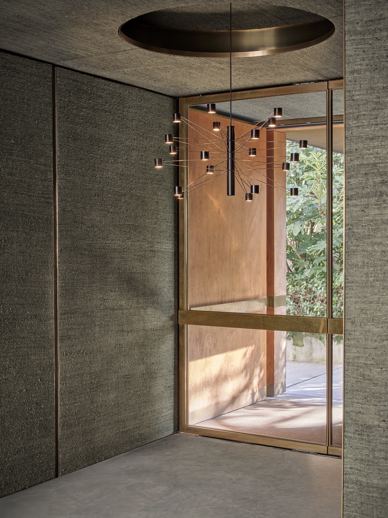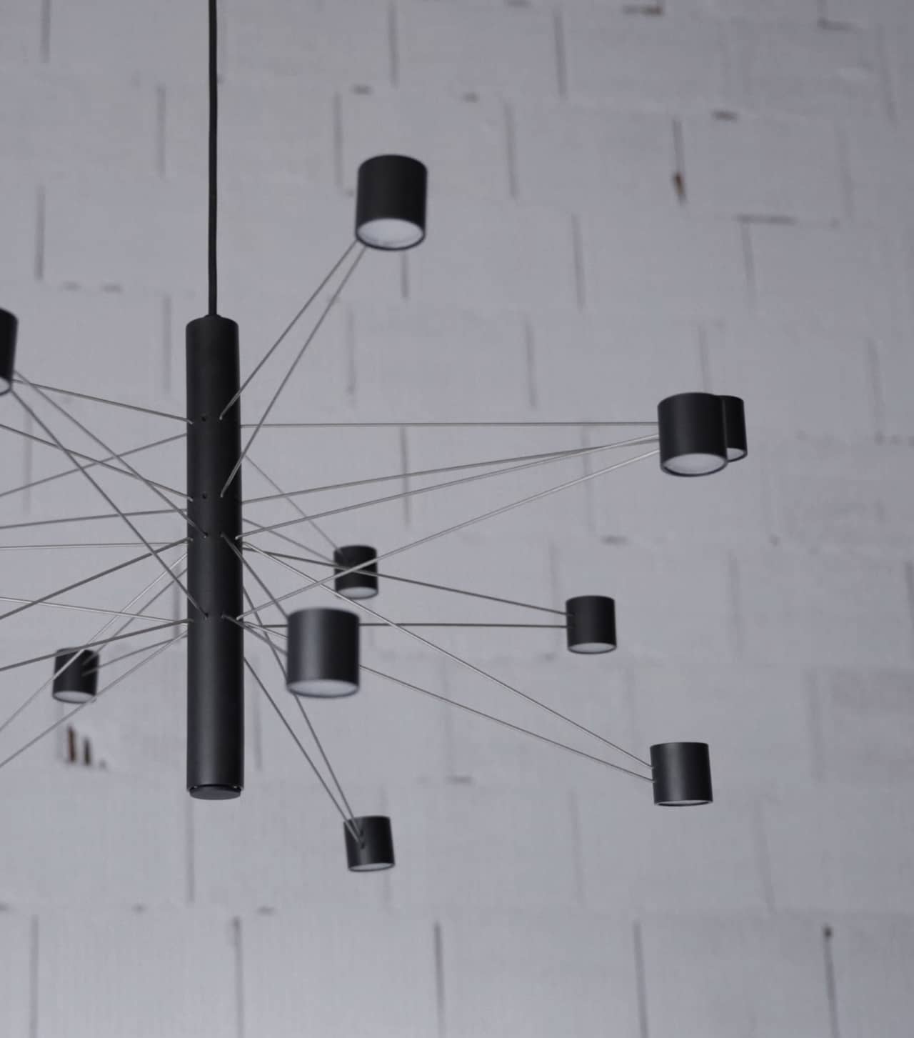 La propuesta se define por el uso de brazos metálicos intercambiables que se articulan alrededor de un eje central. Esta solución permite crear diversas composiciones geométricas que llenan el volumen de forma dinámica. Es un sistema inteligente donde la luz no es estática, sino que se construye mediante módulos, permitiendo adaptar la presencia de la luminaria a la escala de cada proyecto.