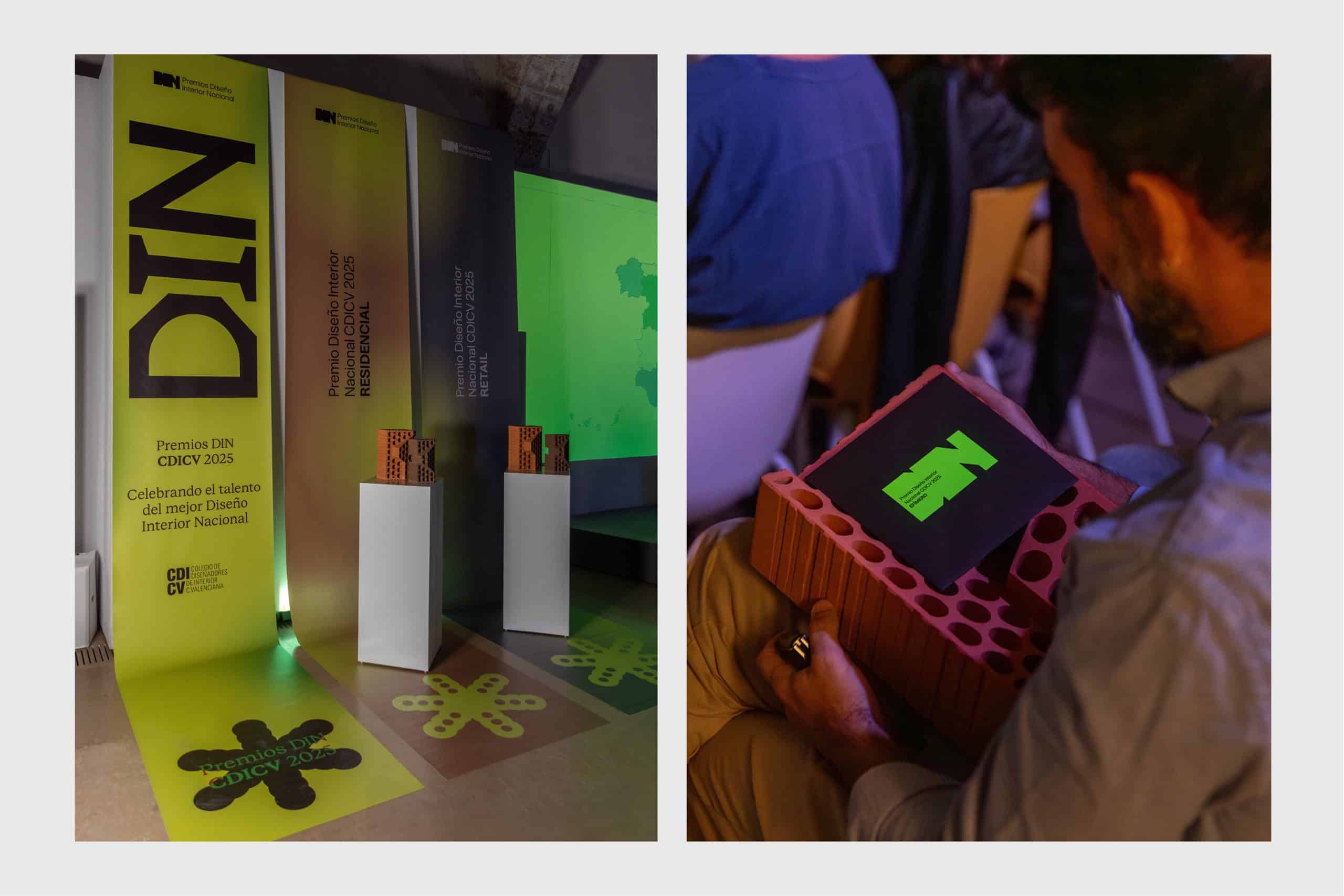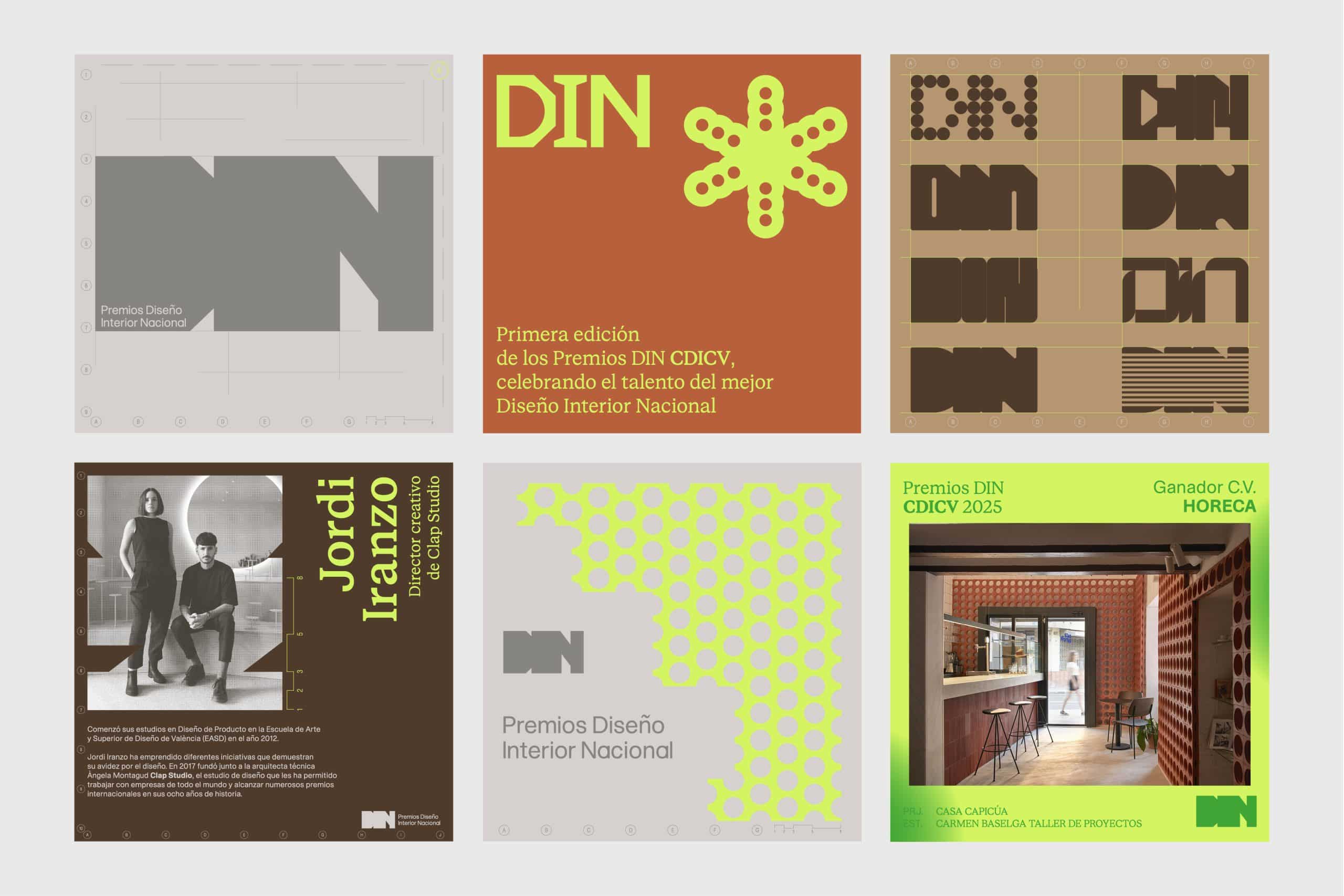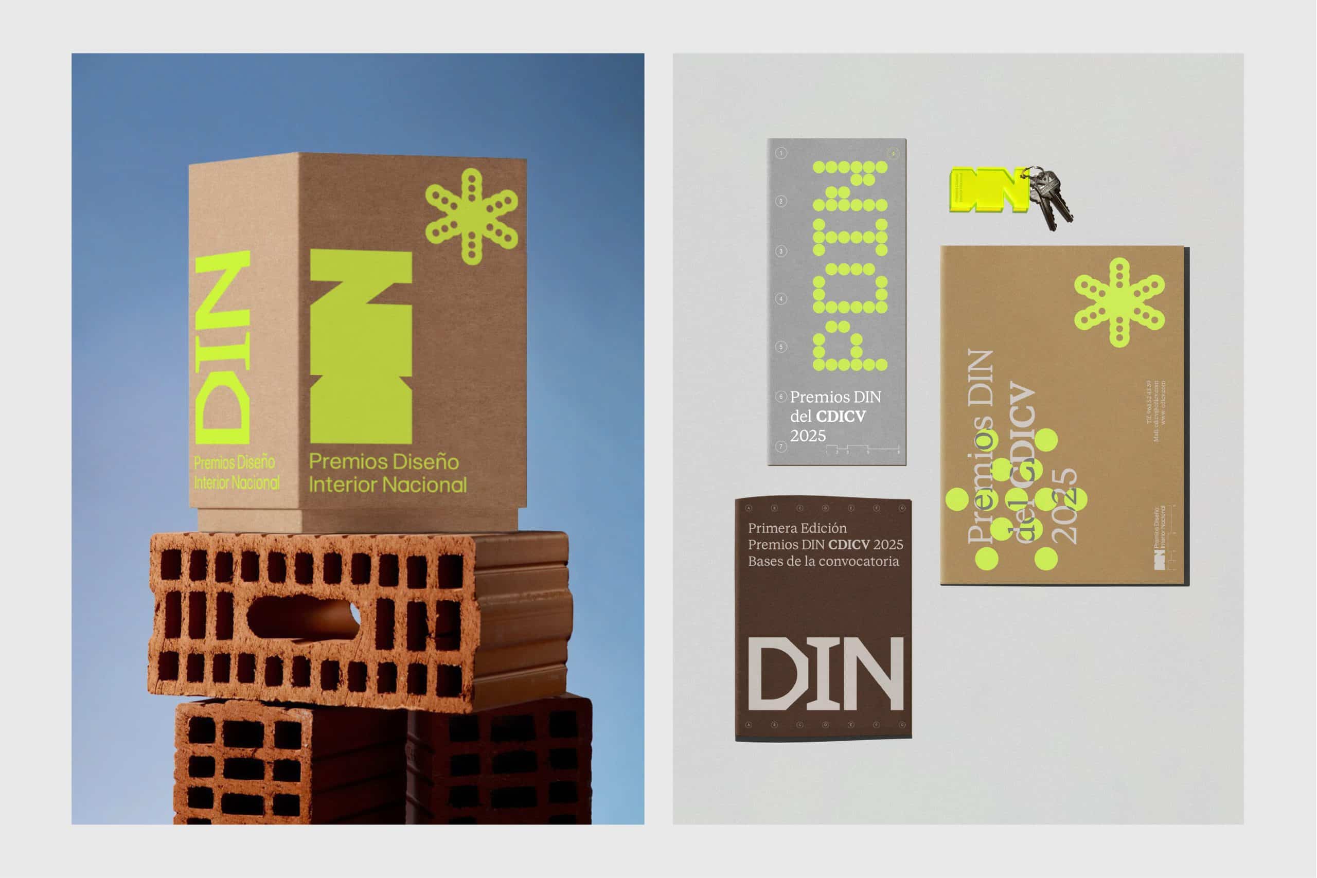"DIN", las siglas de "Diseño Interior Nacional" son el pilar de la marca. Un sistema visual potente y contemporáneo, sólido y rotundo, que utiliza elementos gráficos y colores extraídos del entorno de la obra de un interiorista. Planos, geometría, marcas de registro o el propio galardón, diseñado y fabricado a partir de un ladrillo son muestras de ello.