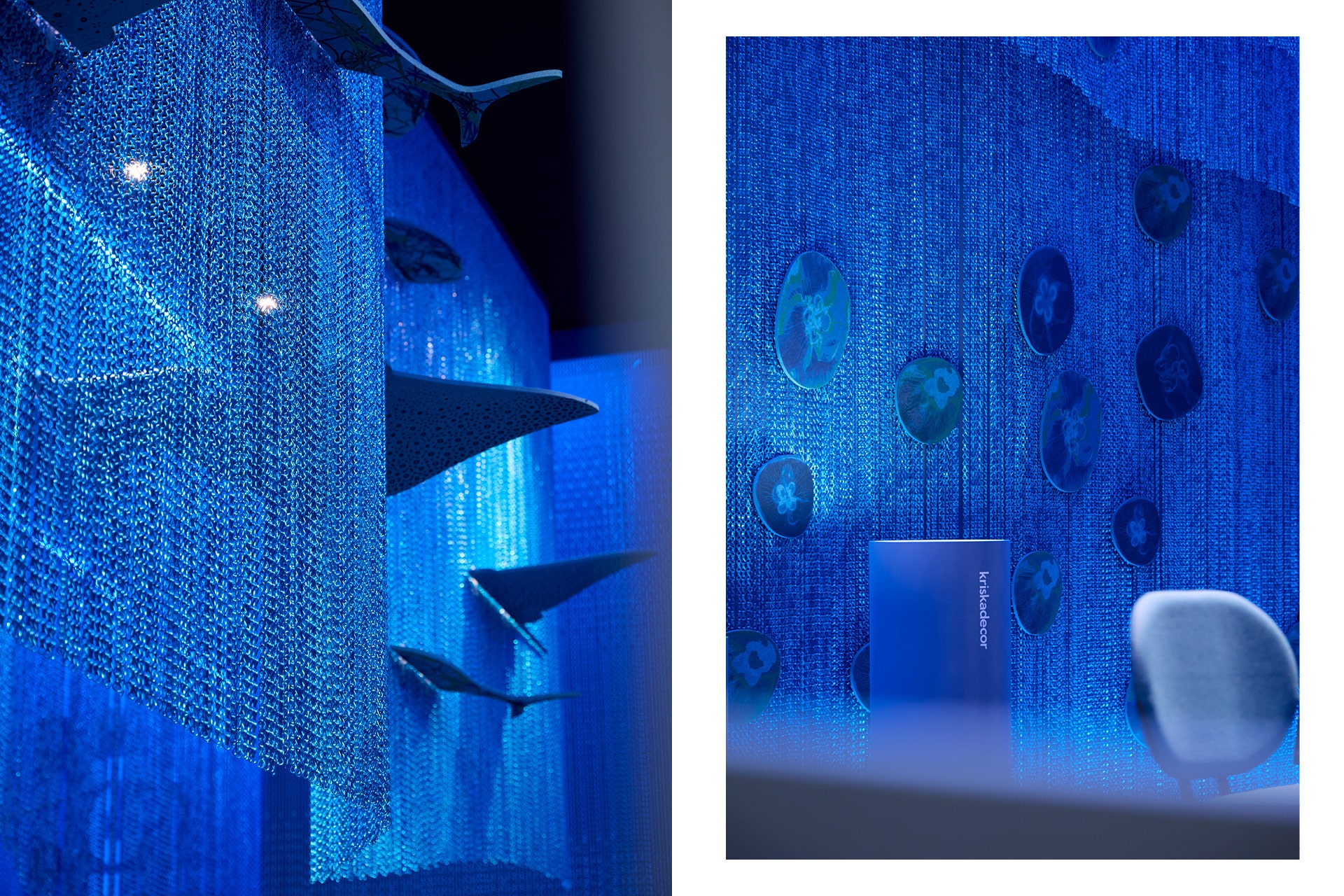 El stand transforma el espacio en un océano en calma. La cortina de cadenas marca el umbral hacia un entorno inmersivo donde la luz se filtra en tonos azules y el ambiente se vuelve envolvente, con bancos de peces y criaturas marinas deslizándose entre capas las cadenas. Dos áreas, experiencial y de negocio, combinan emoción, diseño y soluciones acústicas.
