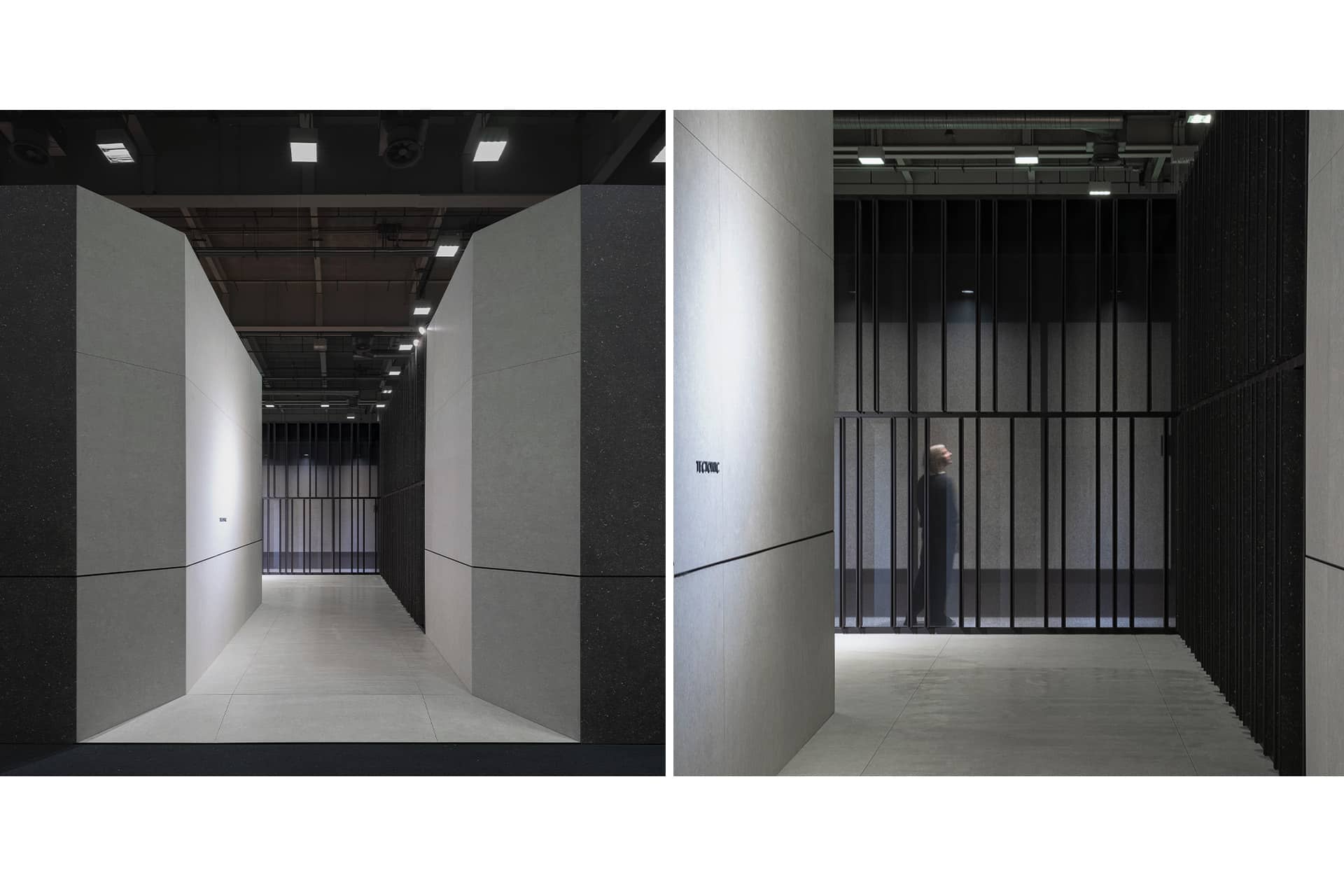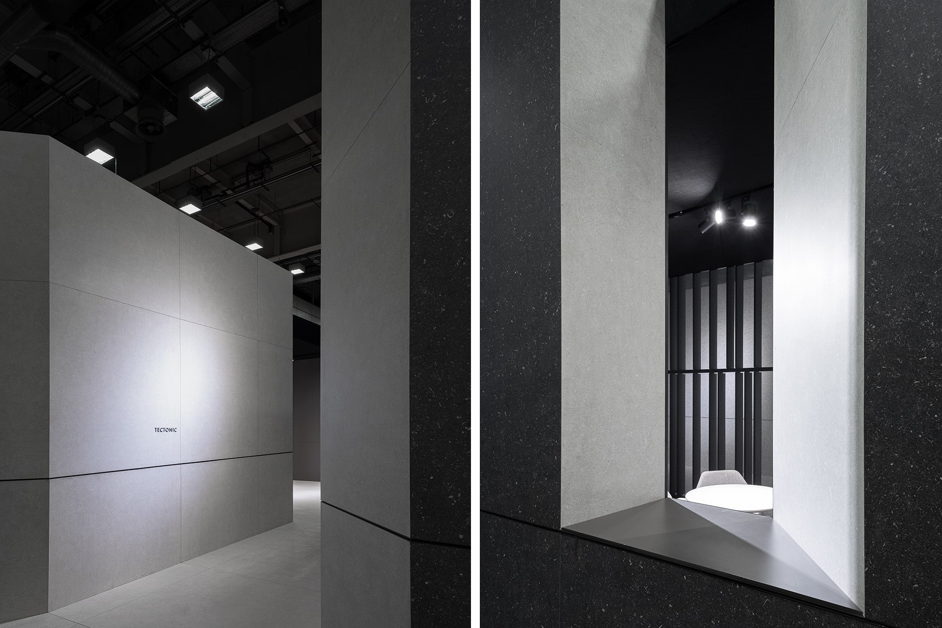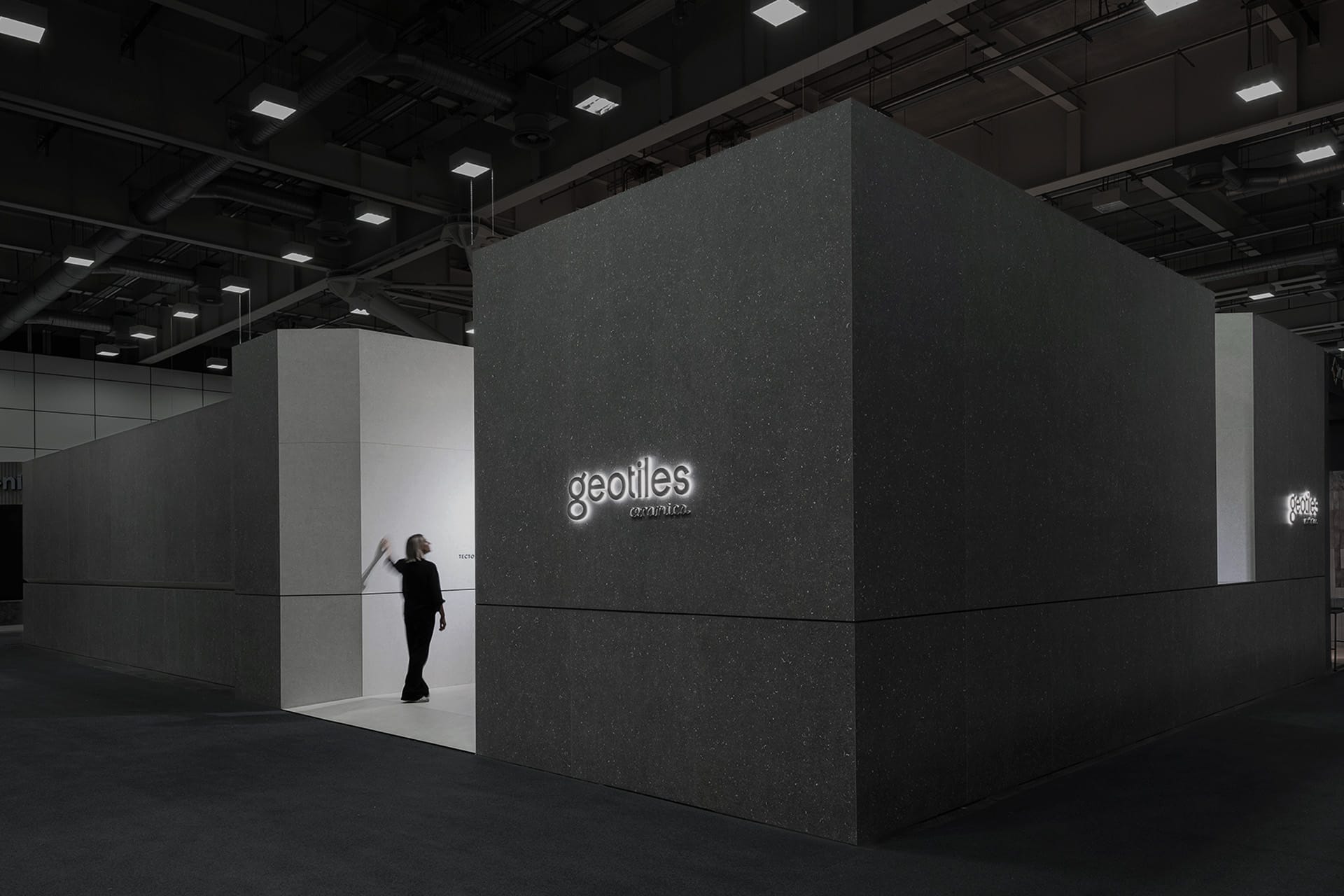 La ejecución combina grandes paneles cerámicos, planos continuos y encuentros precisos que refuerzan la idea de bloque tectónico. Iluminación lineal integrada en hendiduras y paramentos potencia la textura del material. El resultado es una arquitectura efímera de fuerte impacto visual, coherente, sólida y técnicamente optimizada para montaje ferial.