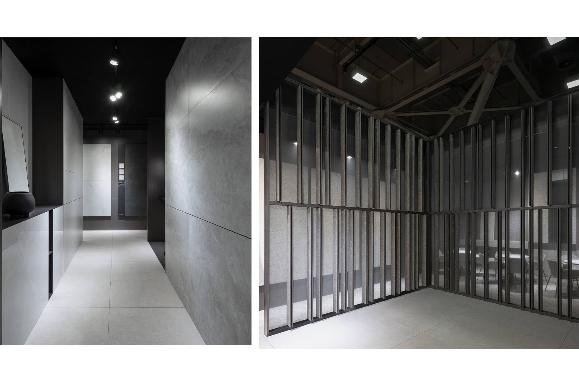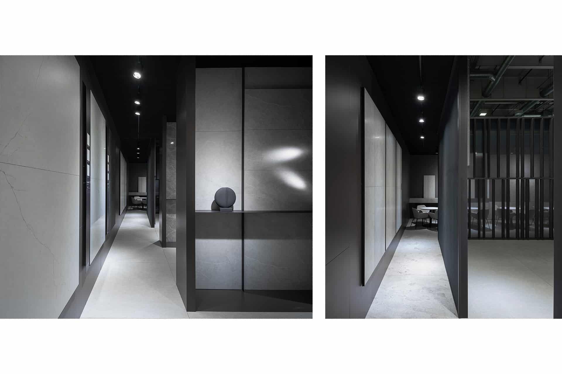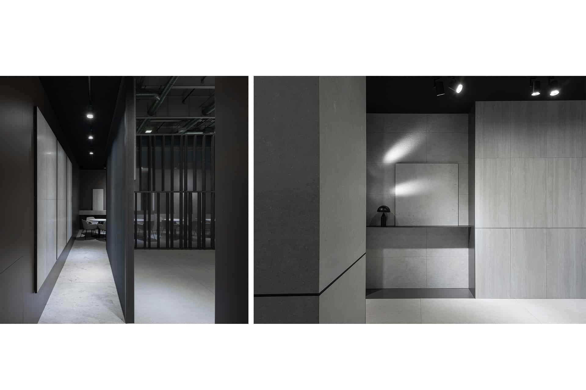 La ejecución combina grandes paneles cerámicos, planos continuos y encuentros precisos que refuerzan la idea de bloque tectónico. Iluminación lineal integrada en hendiduras y paramentos potencia la textura del material. El resultado es una arquitectura efímera de fuerte impacto visual, coherente, sólida y técnicamente optimizada para montaje ferial.