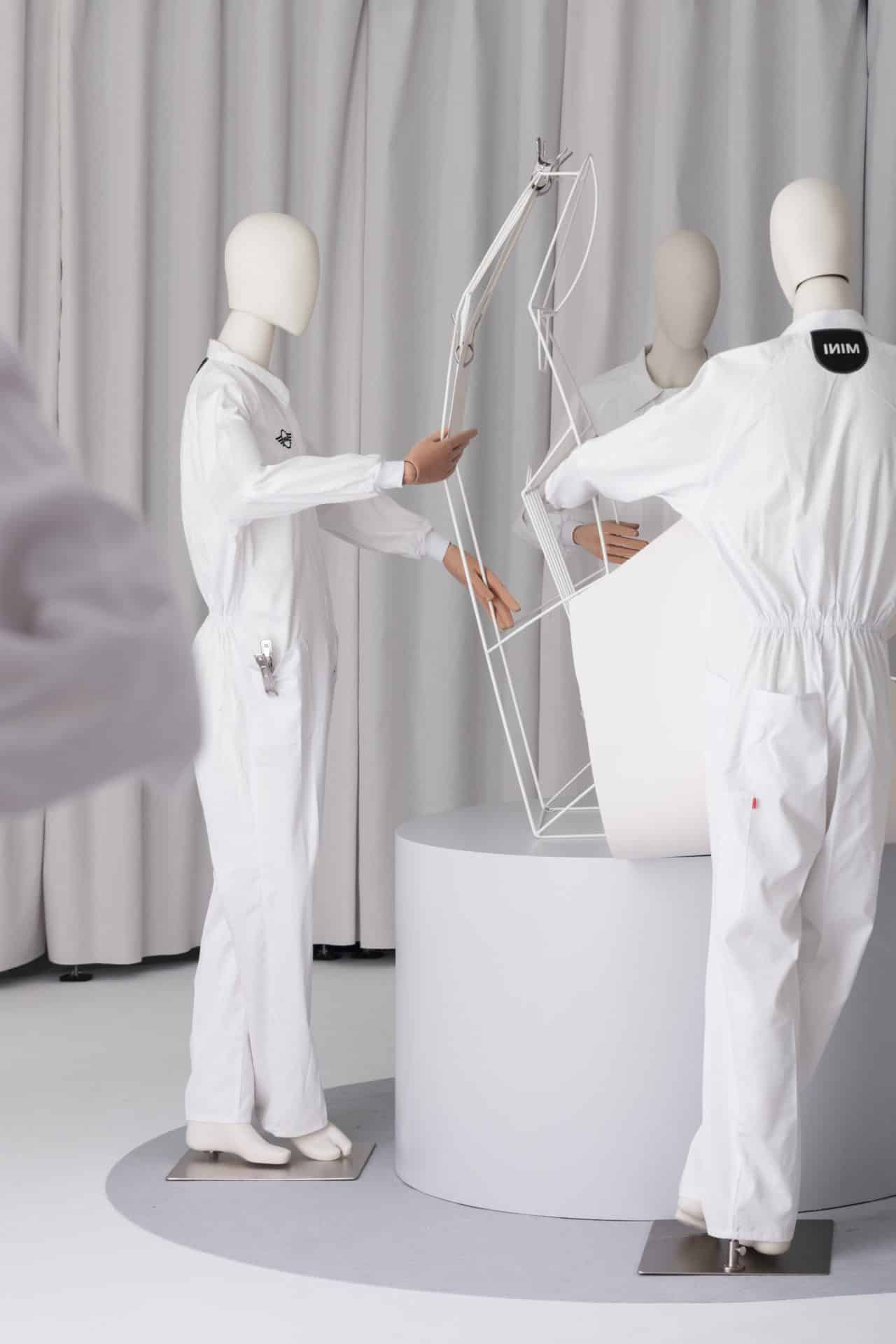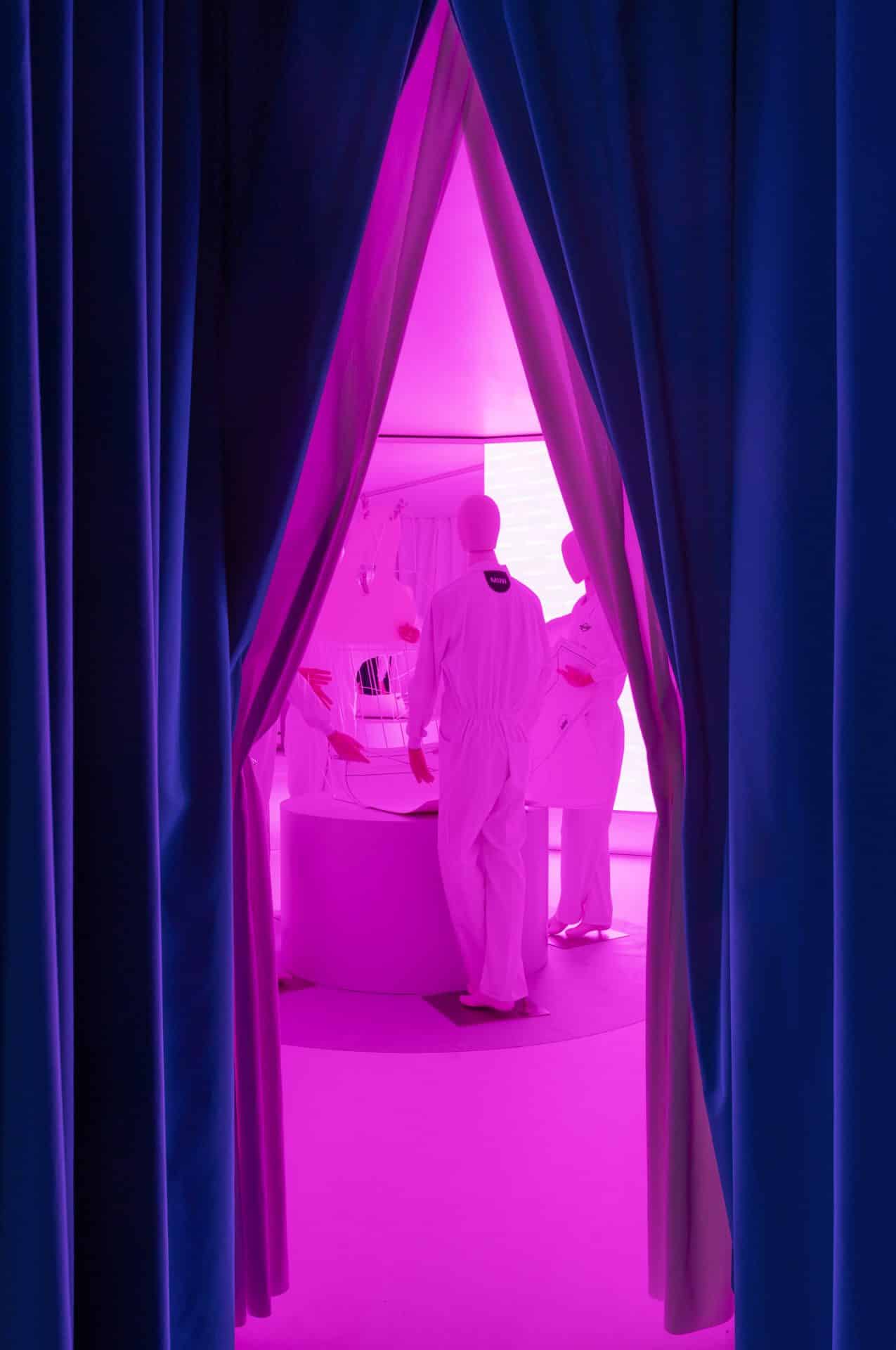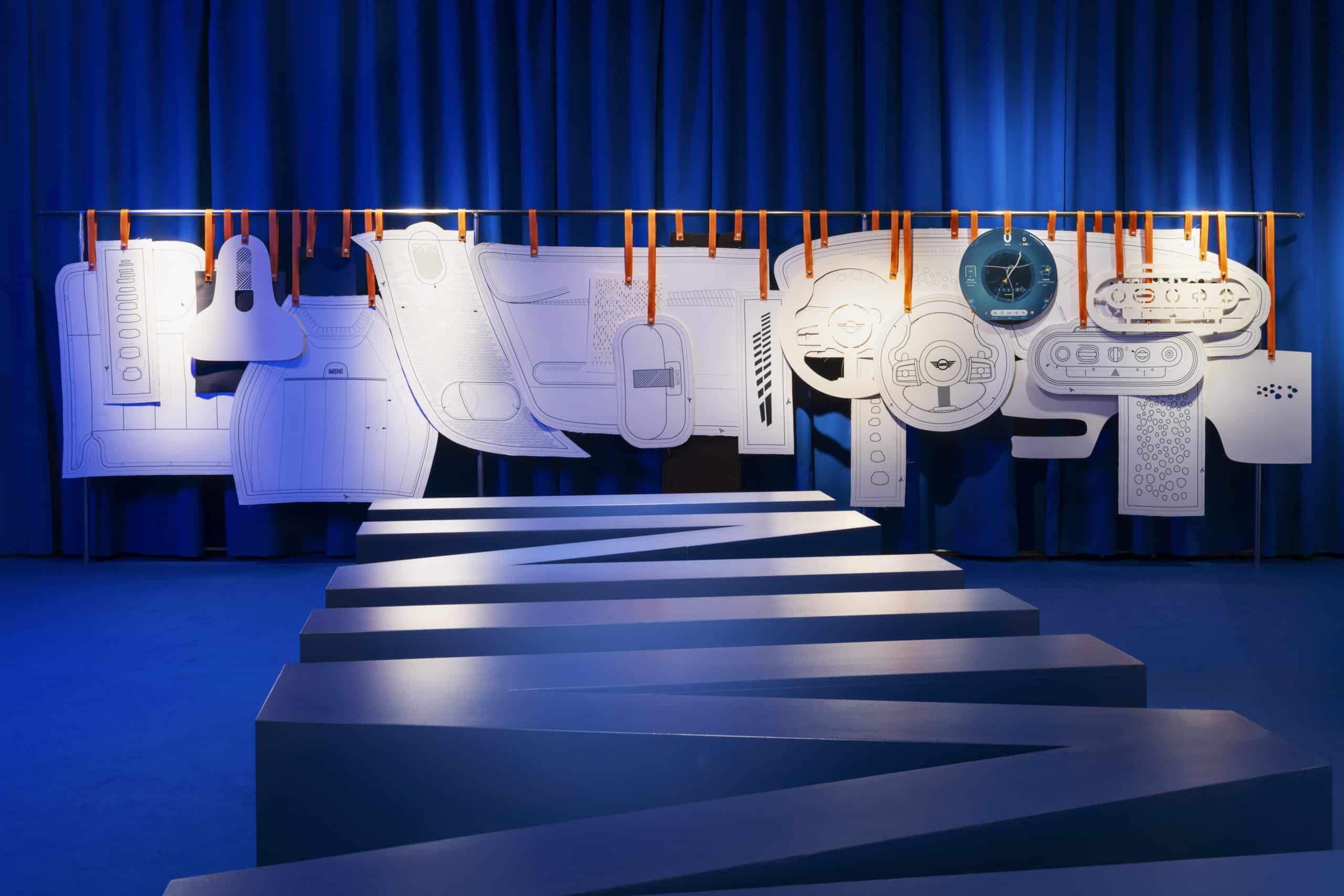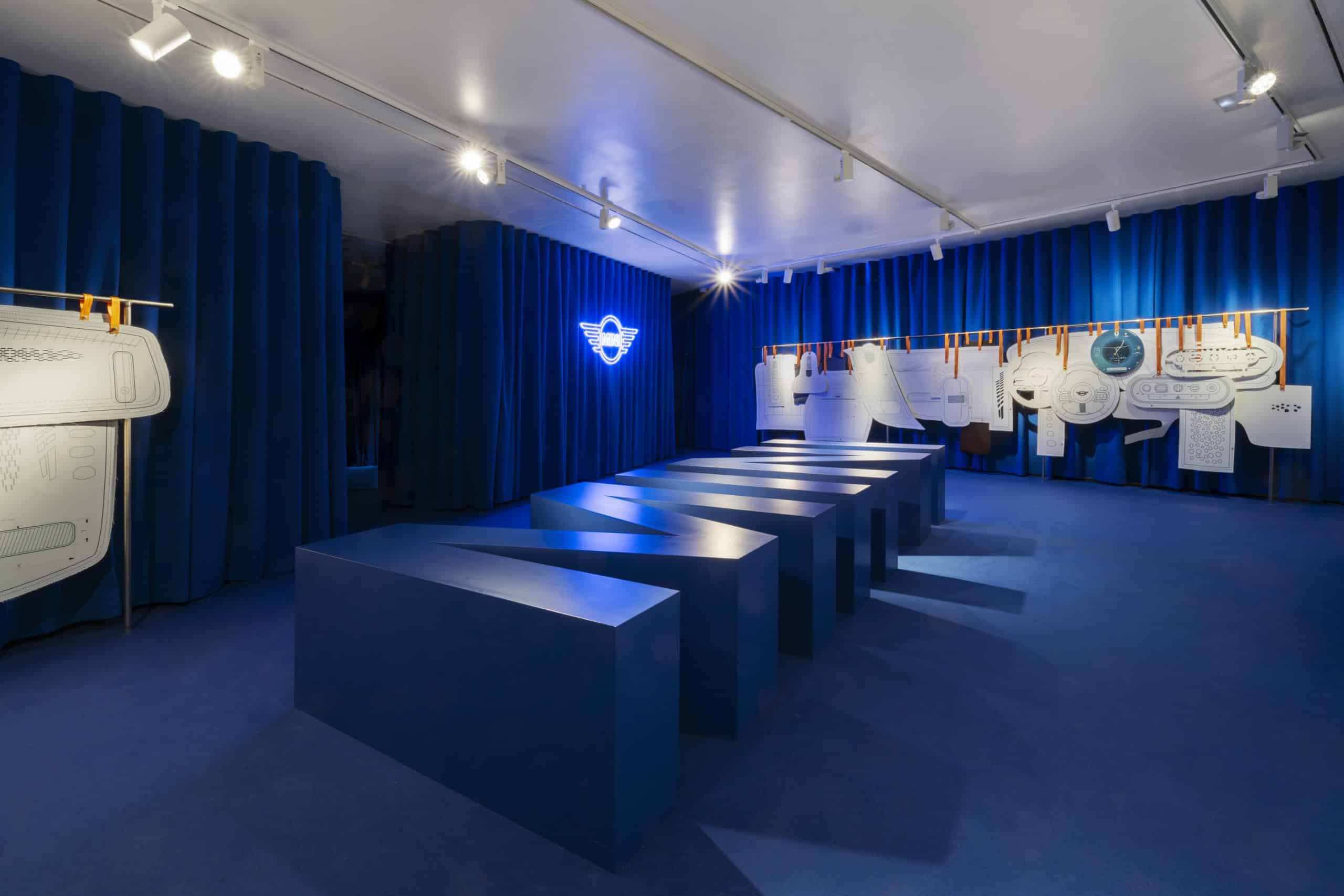 Una envolvente instalación realizada en tejido dando forma al espacio, combinada con una estructura de metal que hacia de percha con el despiece en forma de patrones de las distintas partes del interior del nuevo vehículo, junto a los nuevos tejidos, que daban paso al probador donde podías vivir la experiencia MINI que es cuando entras dentro del coche se personaliza de cara a ti color, sonido...