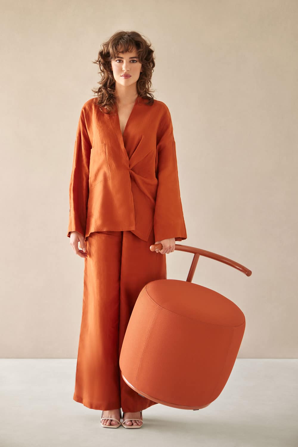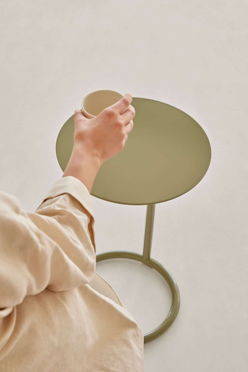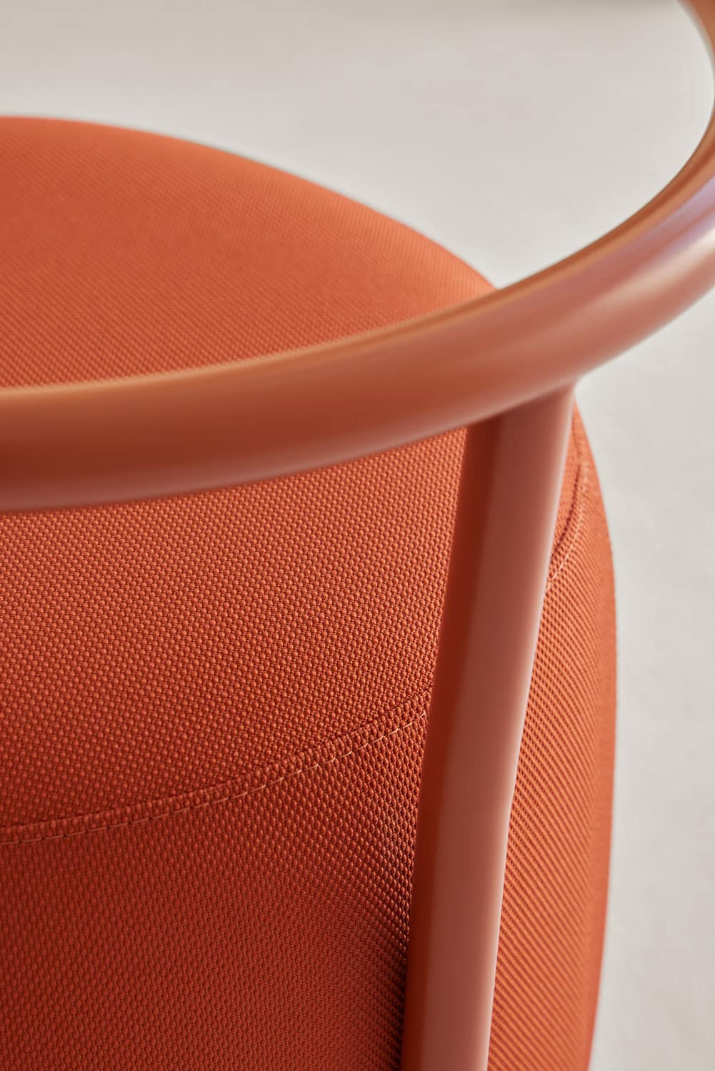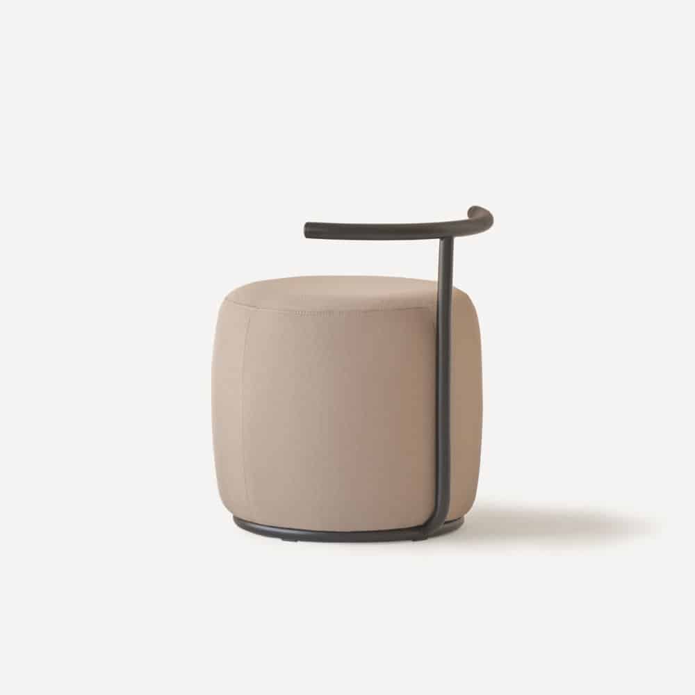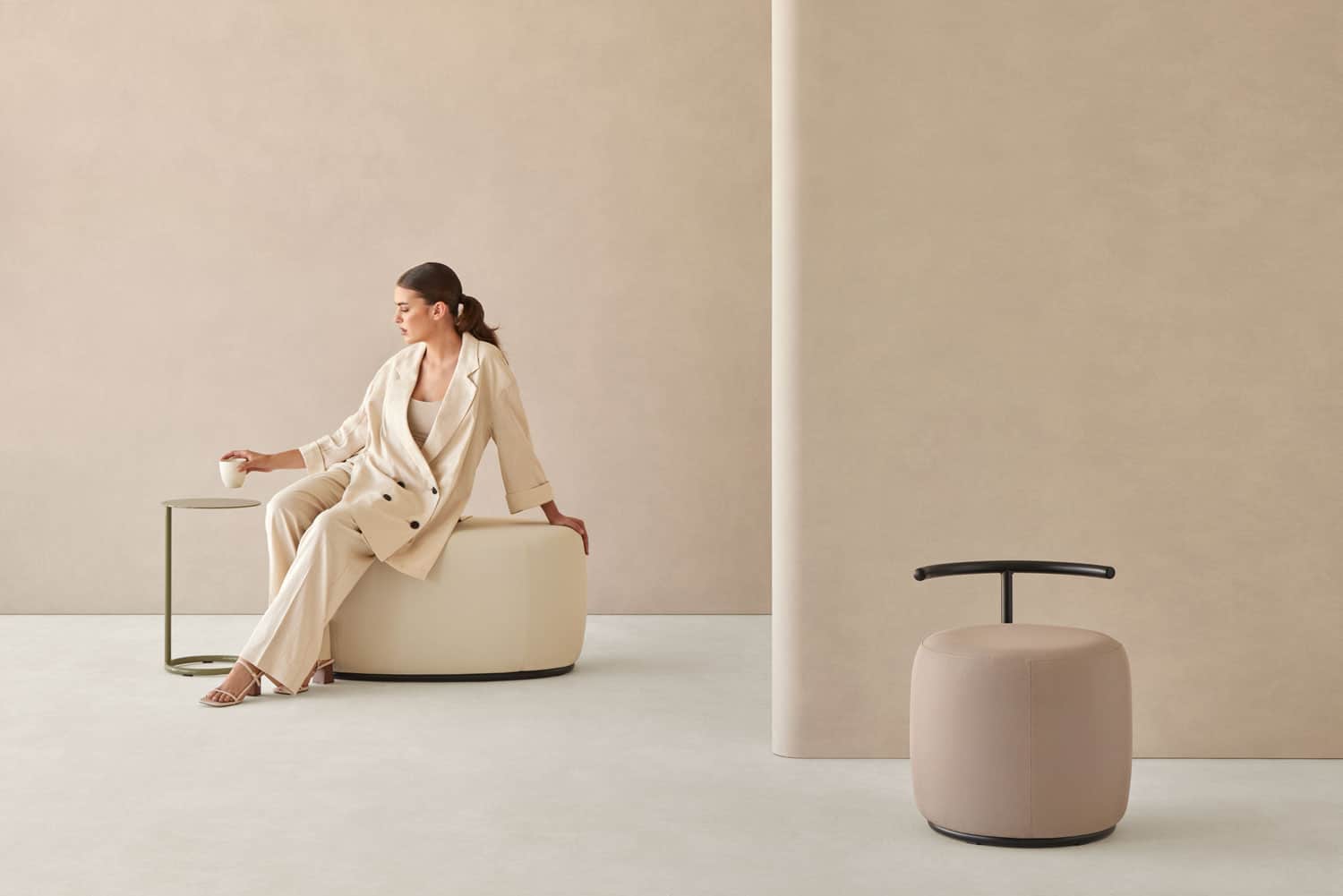 La solución se centra en un respaldo en forma de T unido a una base circular, que funciona como asa y protege el tapizado, aportando personalidad y fácil reconocimiento. La familia Tibo se adapta a distintos formatos y alturas, combinando comodidad y estilo, y se completa con mesas auxiliares que replican el mismo diseño en su base, creando un conjunto armonioso y versátil..