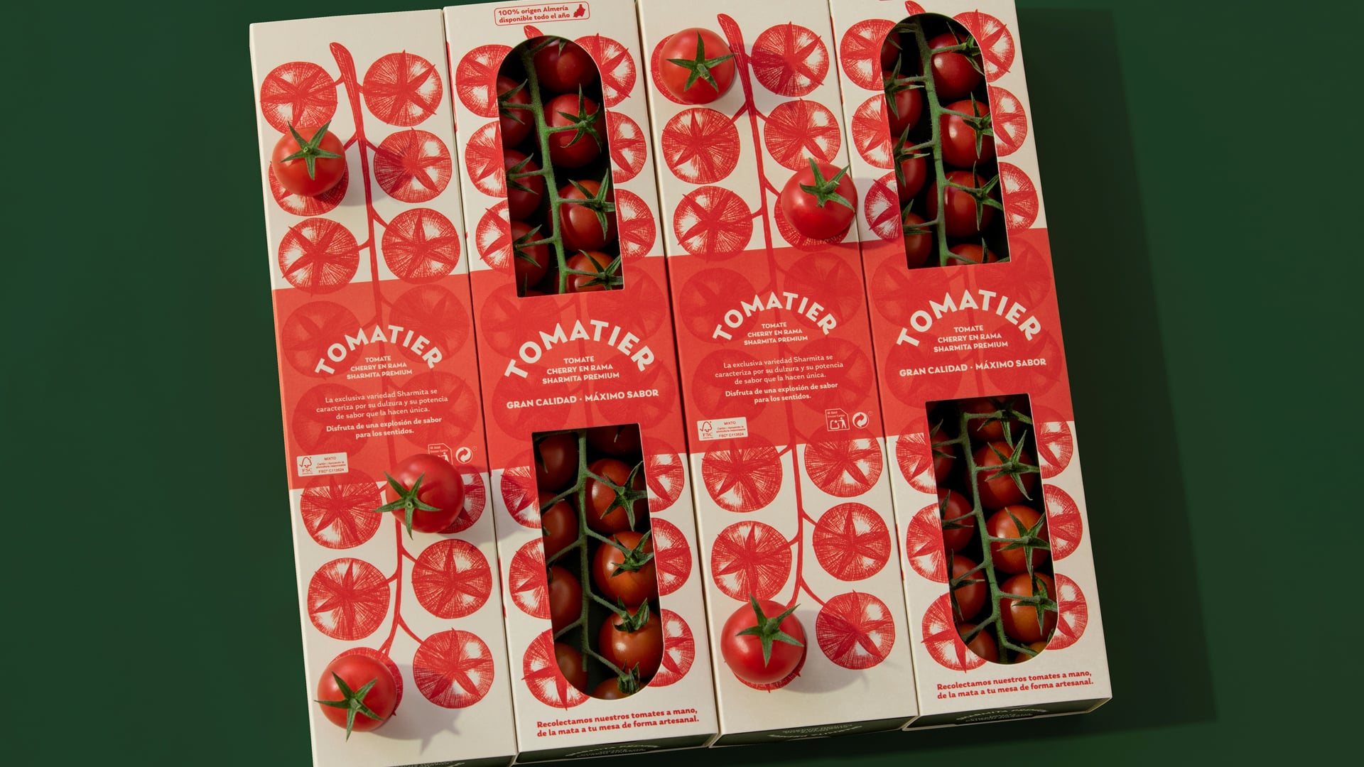 Crear un packaging de Tomates Cherry en rama recolectados a mano y de alta calidad, una edición exclusiva para Carrefour.