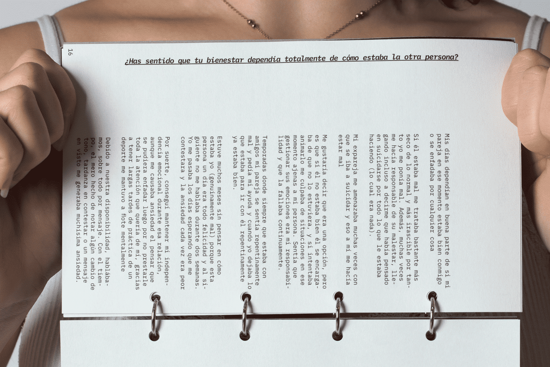 La propuesta consiste en un libro que articula relatos personales, voces anónimas y fragmentos visuales para exponer las dinámicas del abuso emocional. A través de una narrativa fragmentaria y una estética experimental, la obra busca generar identificación, reflexión crítica y espacios de reconocimiento colectivo.