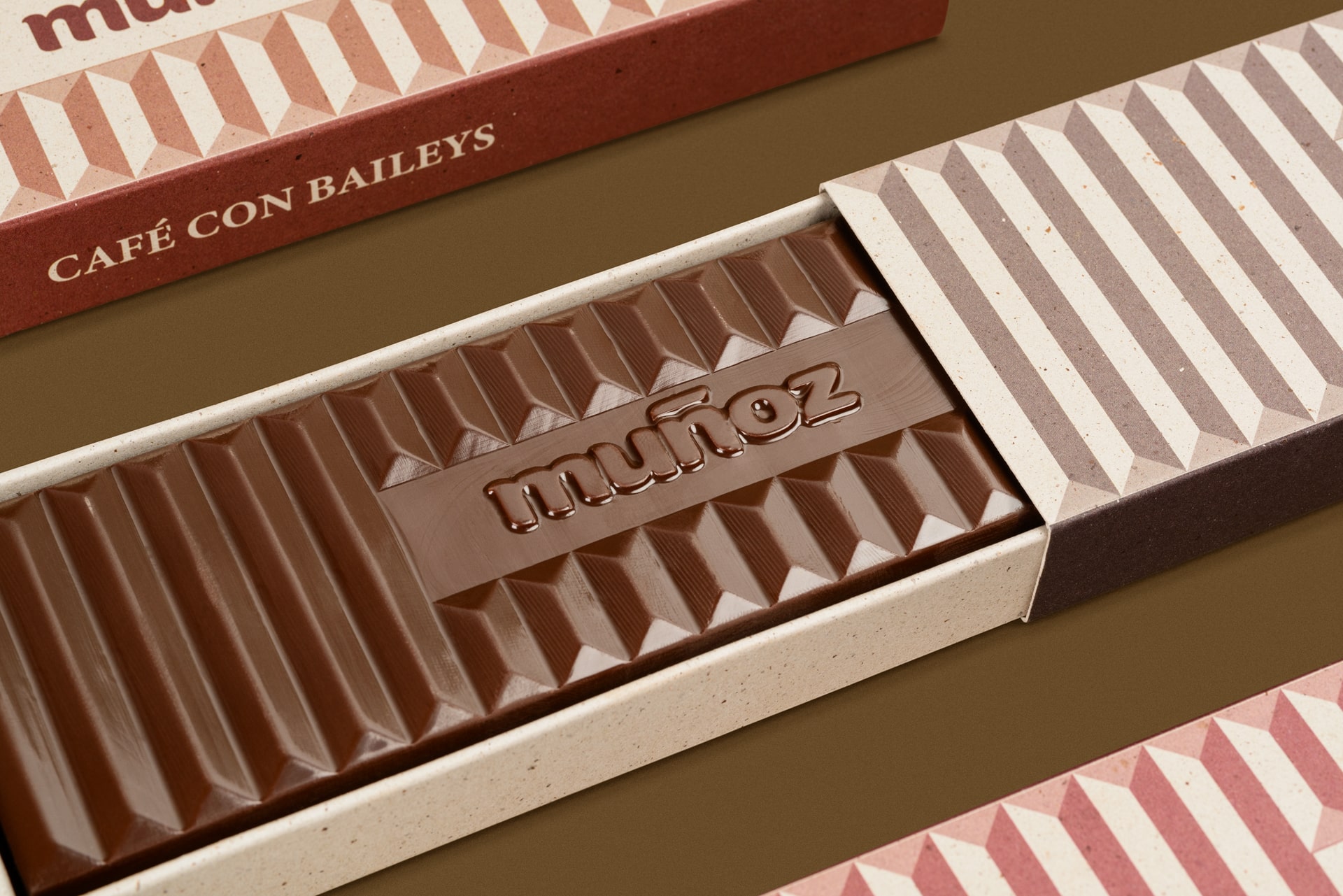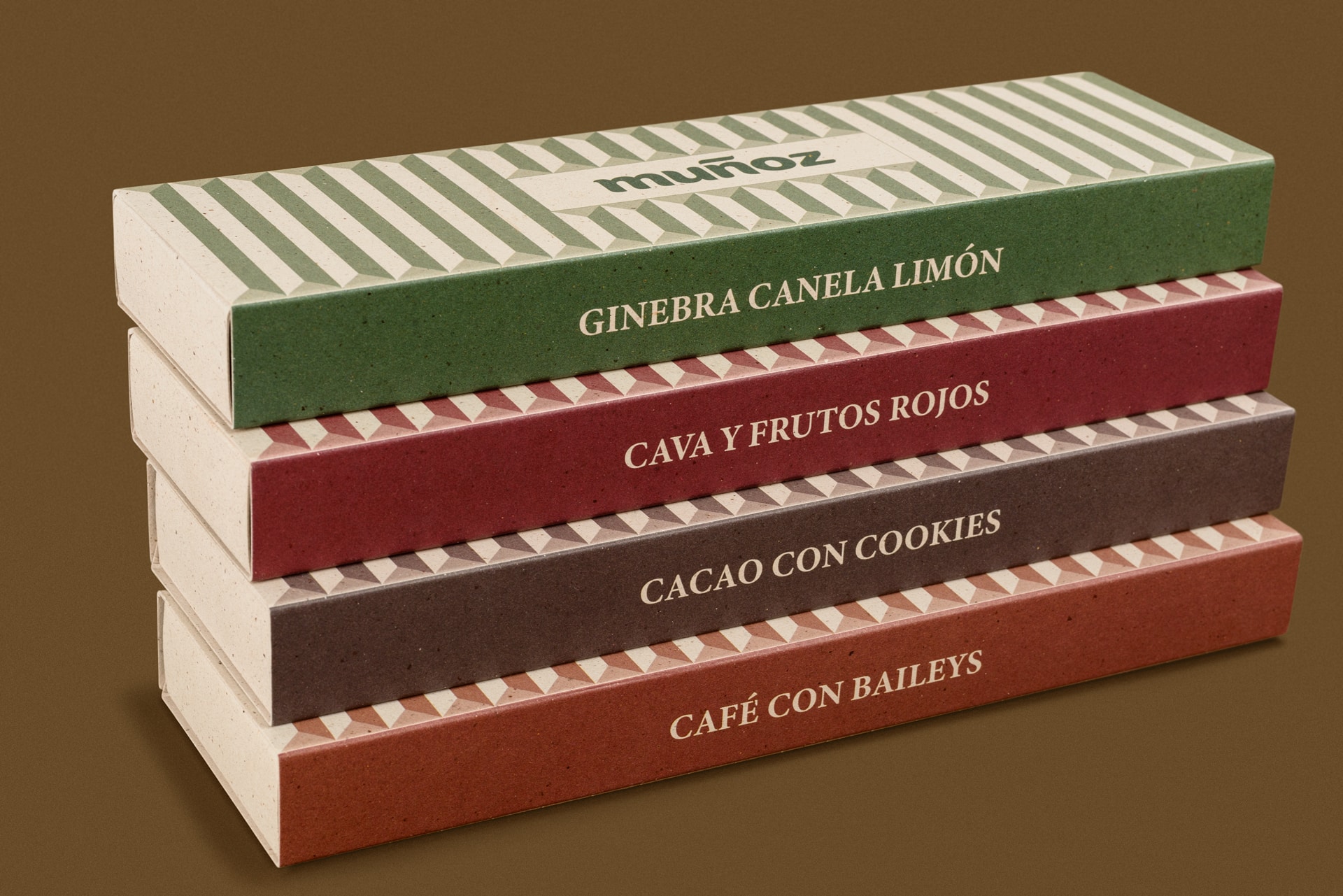 Diseño sencillo diferenciando las cuatro variedades por colores monocromos. El papel ecológico contiene cáscara de cacao. El molde se ha diseñado para que las franjas dentadas del chocolate faciliten el corte en porciones iguales, además sirve de recurso gráfico para el envase.