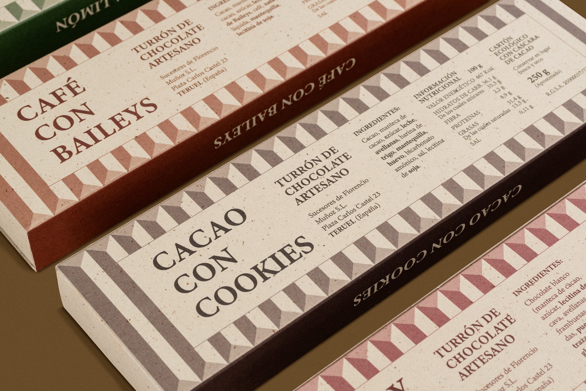 Se produjeron 1.000 unidades de turrón de manera artesanal usando exclusivamente ingredientes naturales, sin añadidos. Packaging impreso y producido en la imprenta IMPRESUM, negocio de proximidad, especializado en impresión ecológica, papeles reciclados y tintas vegetales.