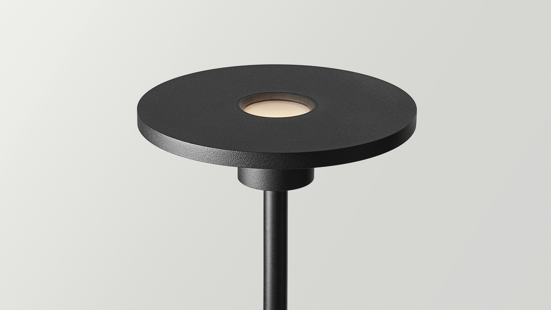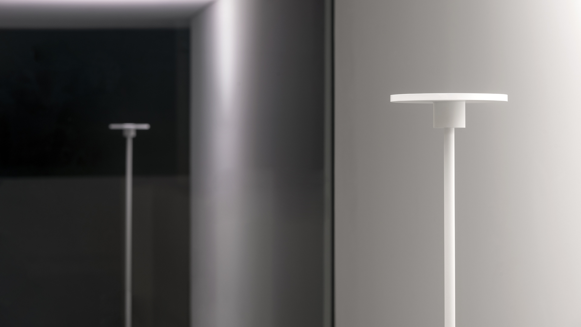 Up se alza como una pieza noble, un todo de un único material. Con su marcada esbeltez, sostiene elegantemente un liviano plato para que nazca la luz. Este pie de salón es una escultura racional y sobria, coronada por un aura lumínica.