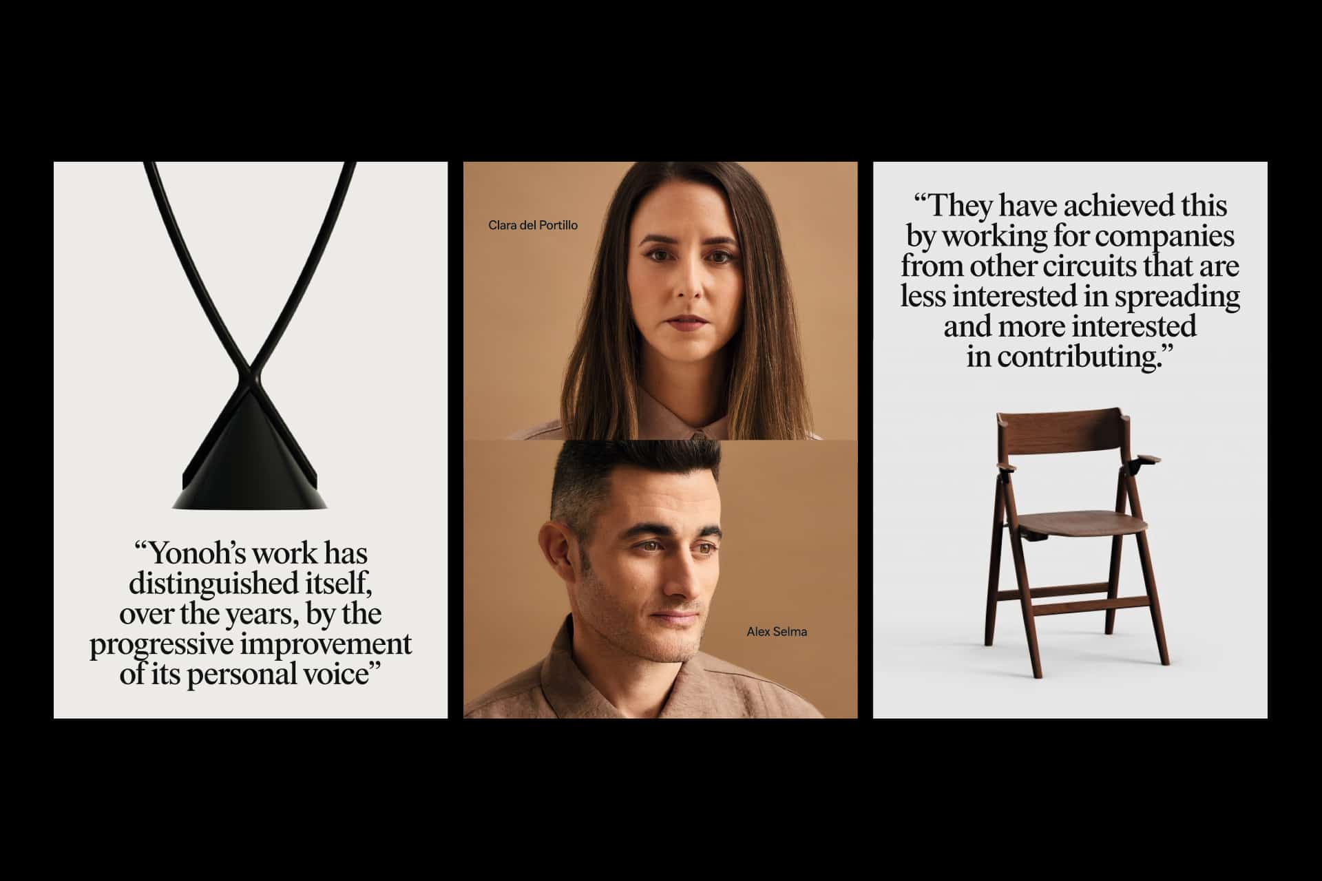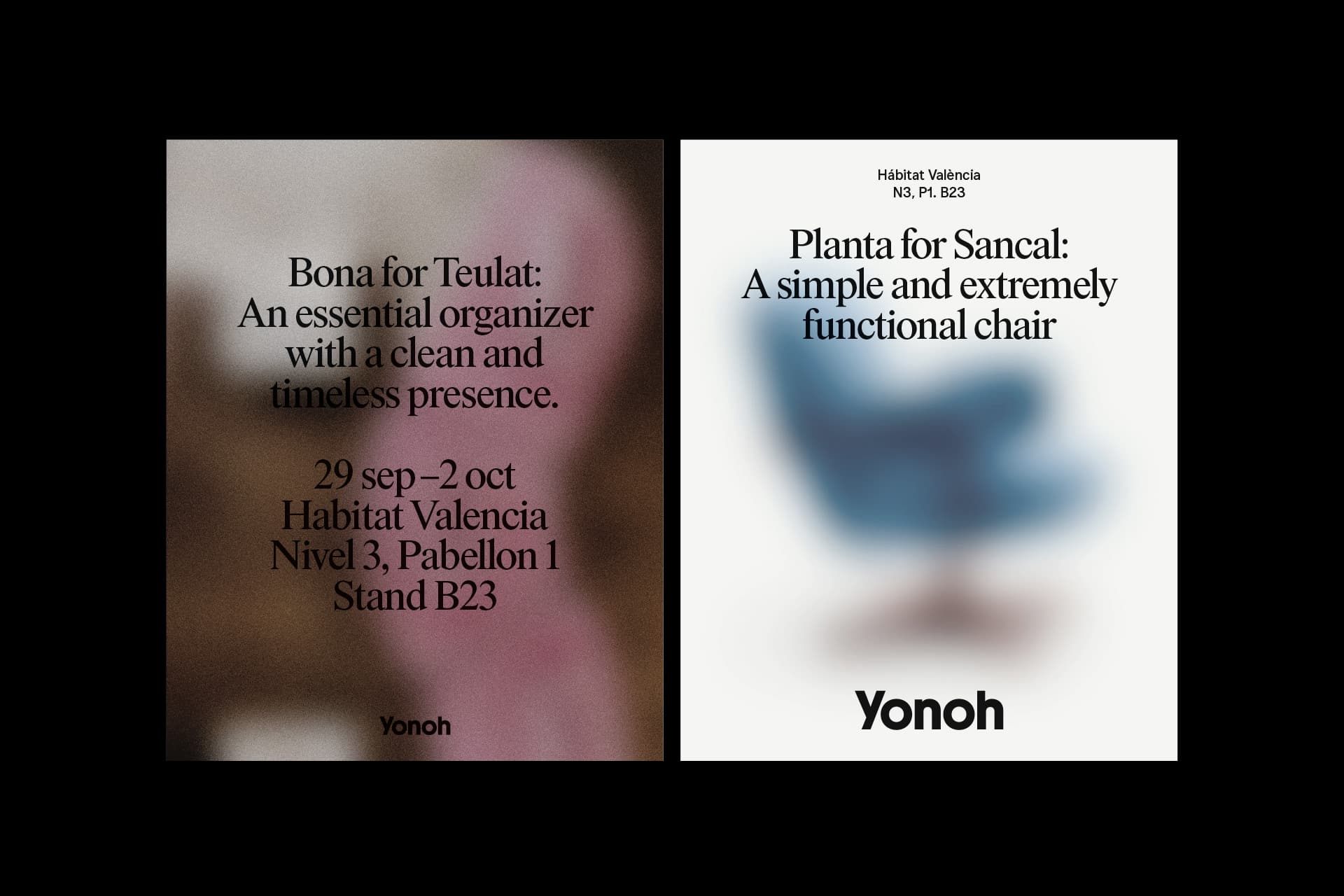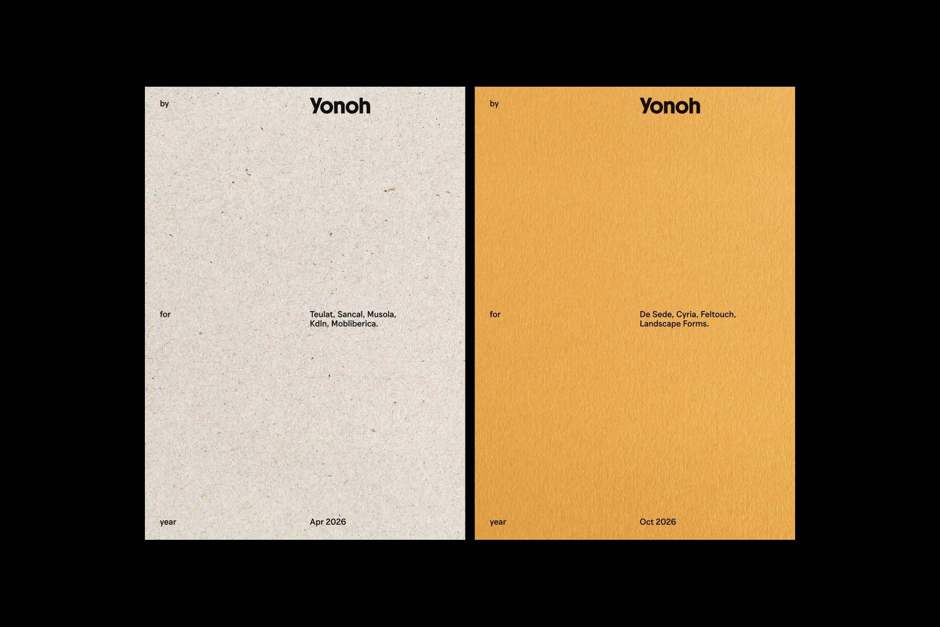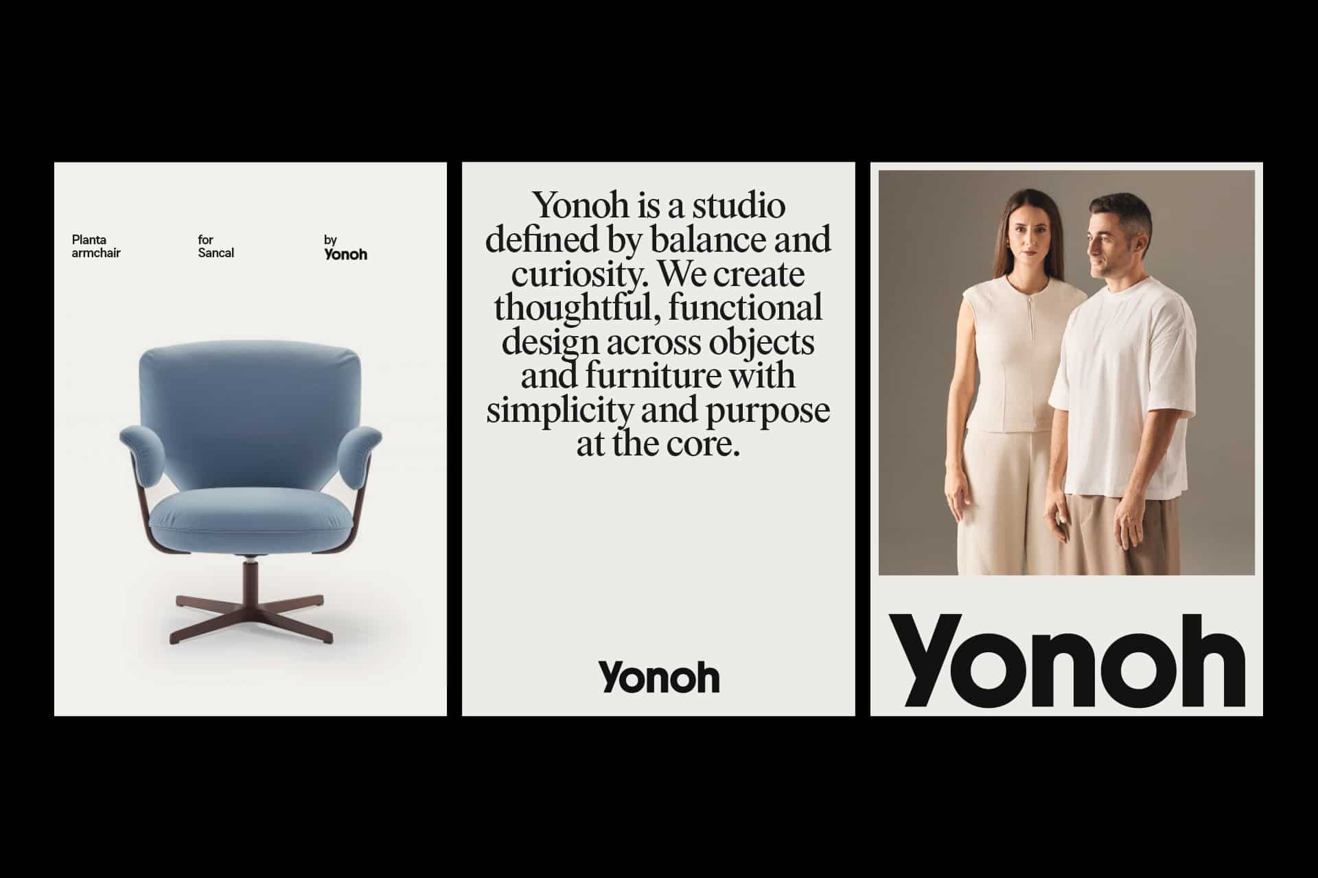 La identidad se articula sobre la idea que el trabajo de Yonoh logra un equilibrio perfecto entre su sello propio y su capacidad de integrarse y aportar valor a las firmas. El sistema combina rigor estructural y calidez para crear una voz reconocible pero flexible, capaz de integrarse en contextos industriales diversos con una estética sobria, honesta y atemporal.