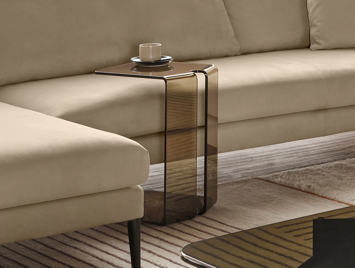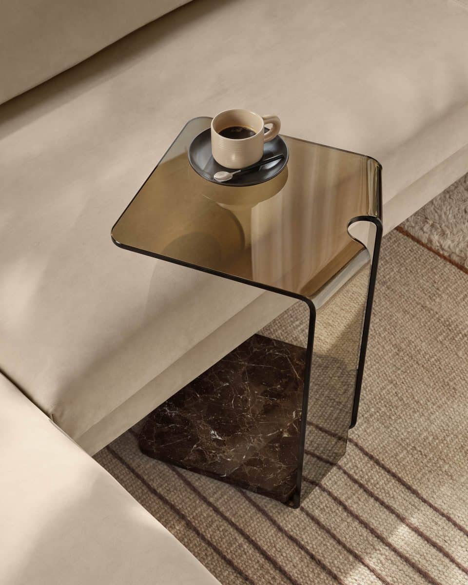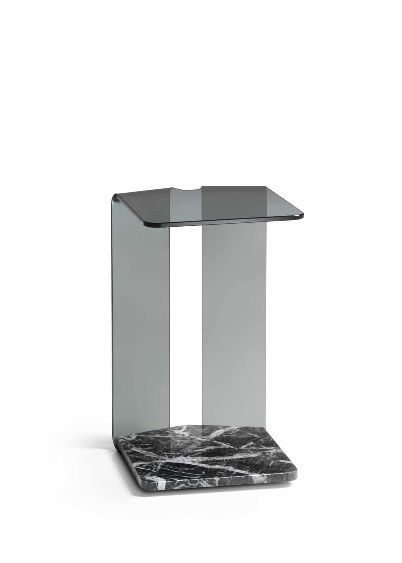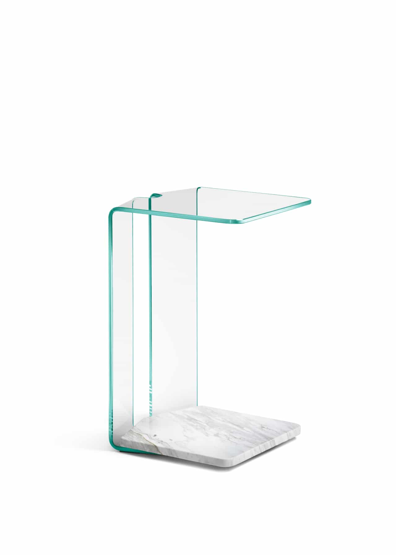 Fiam, referente mundial en el vidrio curvado, buscaba una pieza que desafiara la percepción de este material. El encargo consistía en diseñar una mesa auxiliar que combinara la transparencia del cristal con un elemento sólido. El objetivo era crear un mueble elegante y sofisticado que aprovechara la maestría técnica de la firma para lograr una estética ligera y atemporal.
